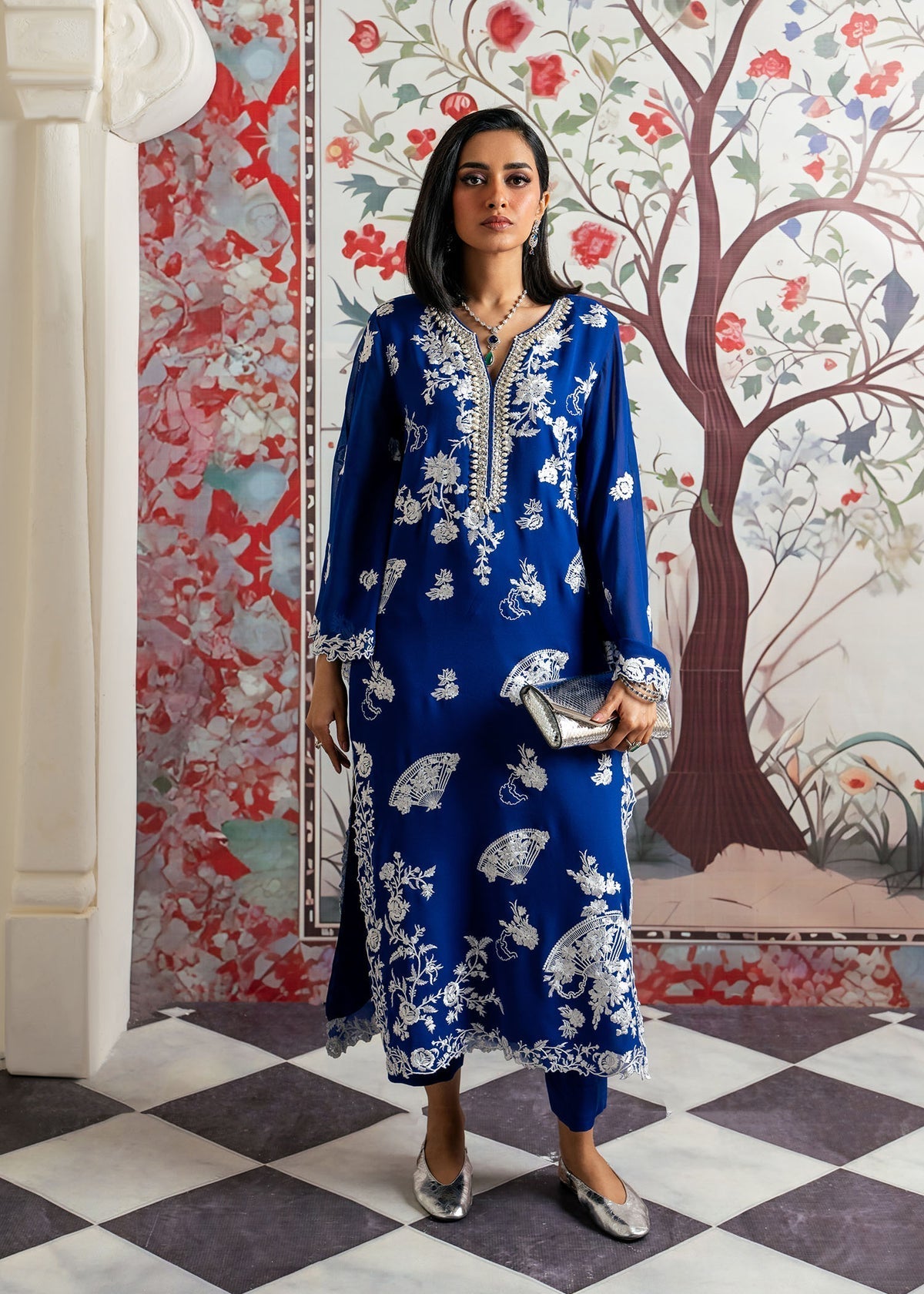 Azure Jewel from Echoes of Elara is a vision of elegance in rich blue hues. Crafted from flowing chiffon, the long shirt exudes grace and sophistication, beautifully adorned with a signature Mahgul hand-worked neckline that adds a touch of timeless artistry. Paired with sleek raw silk trousers, this ensemble is the perfect blend of tradition and modern refinement.