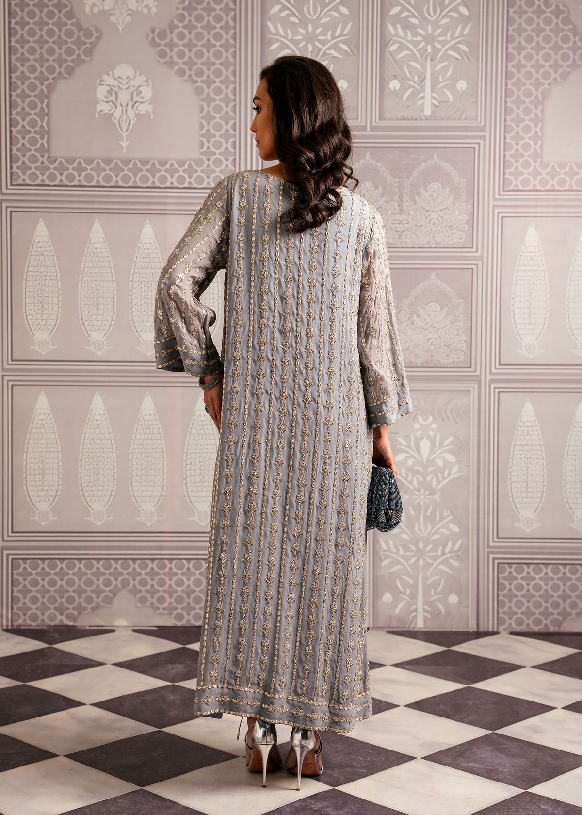 Jahnur from Echoes of Elara is a seamless blend of elegance and refinement. This grey long shirt, crafted from ethereal chiffon, drapes gracefully, embodying timeless sophistication. The handworked neck adds an exquisite touch of intricate artistry, elevating the design with signature craftsmanship. Paired with sleek raw silk trousers, it is a statement of understated luxury.