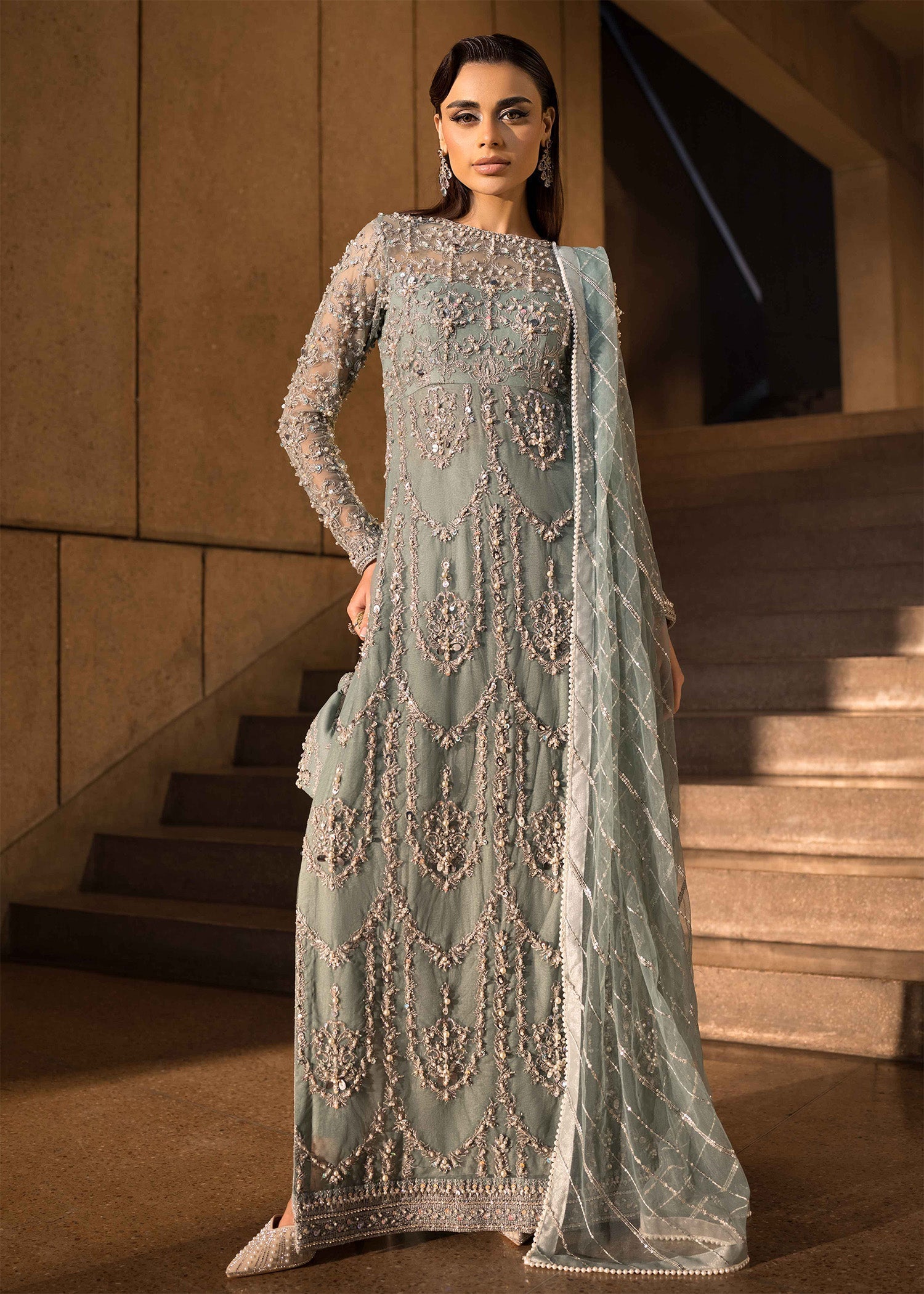 Step into a realm of soft hues and captivating elegance with this stunning Mint dress. The net base is adorned with delicate embroidered motifs that evoke the beauty of precious jewels, while luxurious silver embellishments add a touch of opulence and glamour. Imagine intricate patterns sparkling in the light, effortlessly drawing attention wherever you go. Paired with matching pants, this ensemble creates a perfect blend of bold sophistication and timeless beauty, leaving a lasting impression.