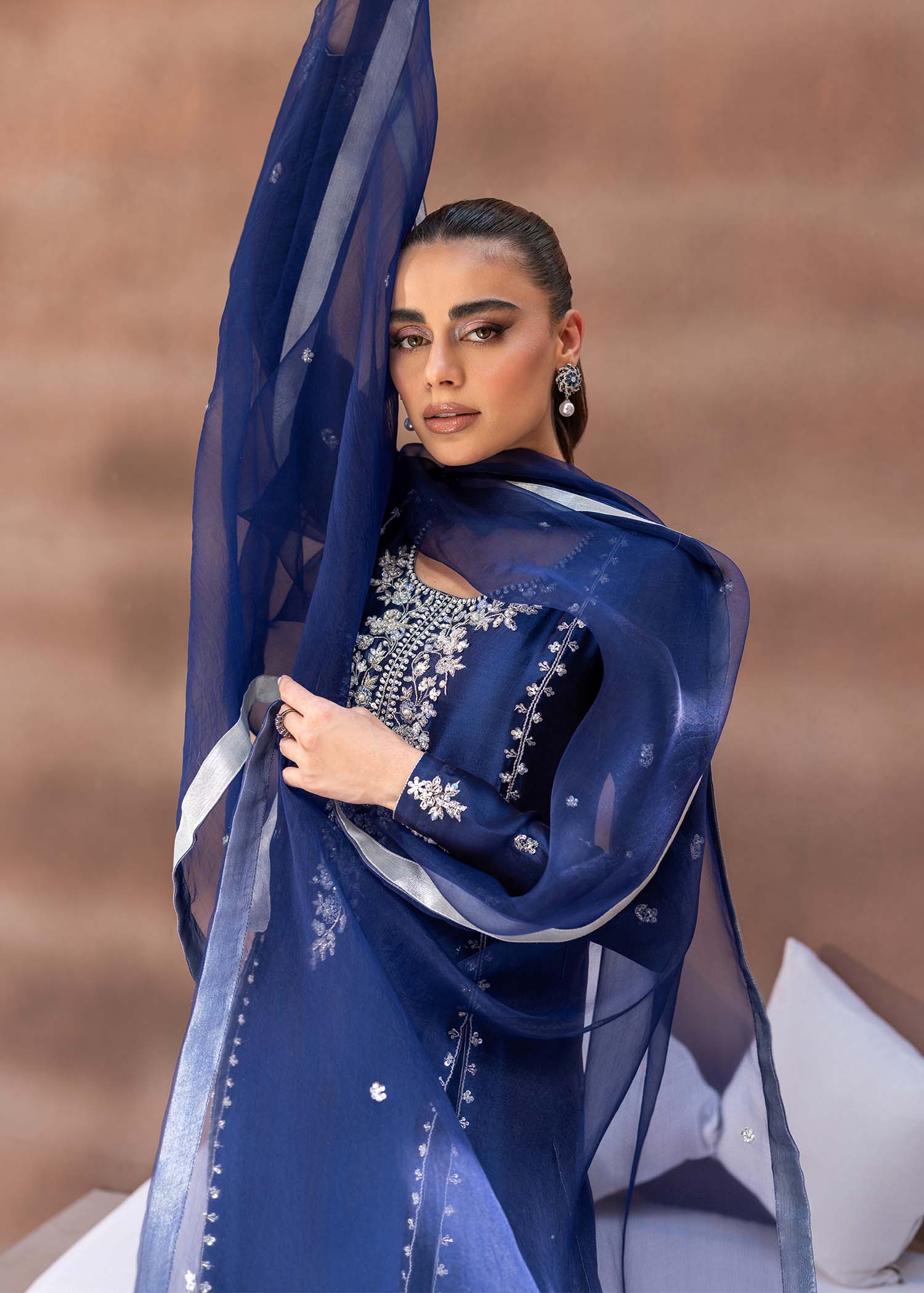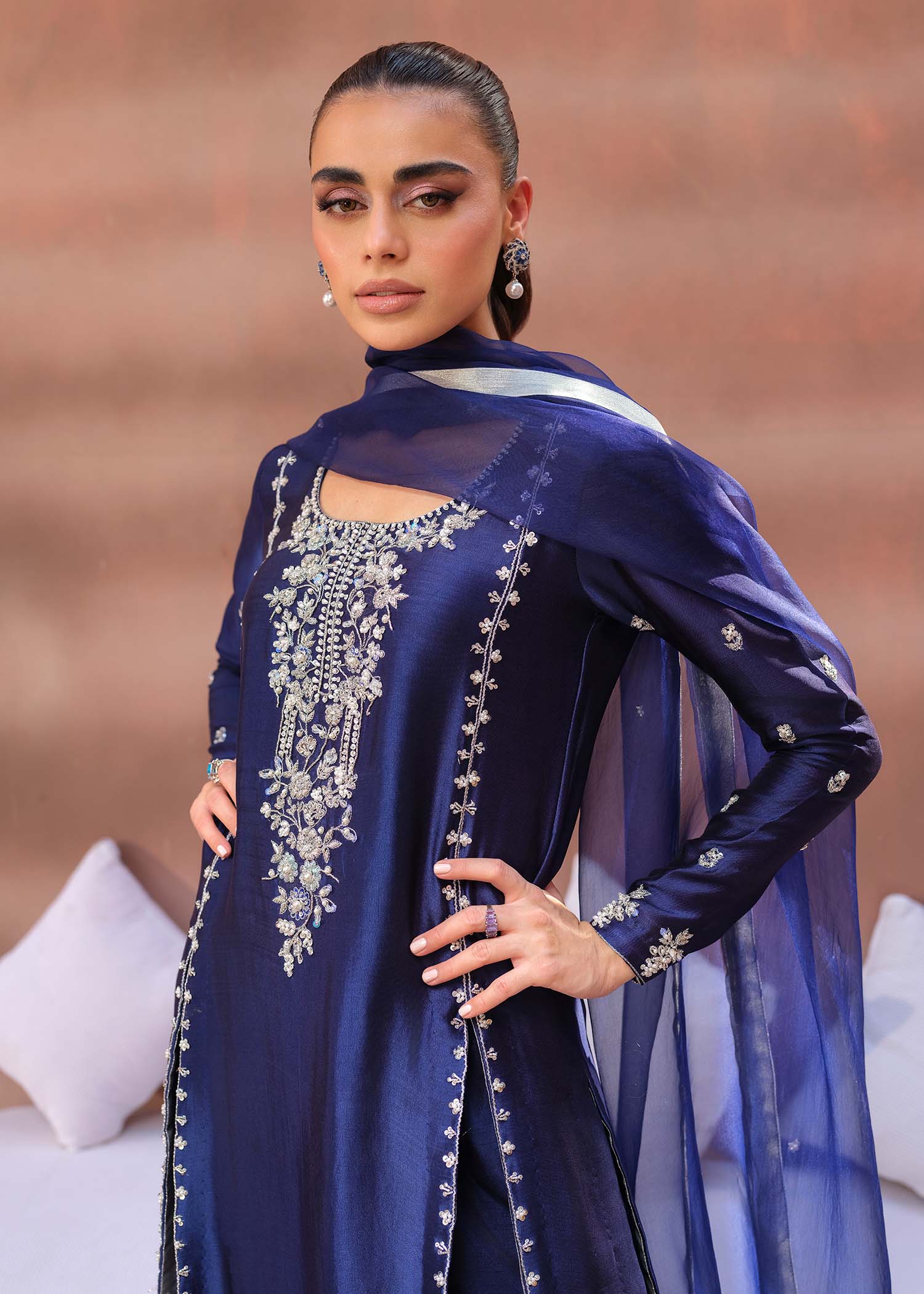 Radiate sophistication in the HoneyColor ensemble. The shirt dazzles with glittering gold sequins meticulously adorning its flawless cut and extravagant detailing. Paired seamlessly with matching embellished Korean raw silk shalwar pants, and complemented by an embellished organza dupatta, this ensemble exudes opulent charm and refined elegance