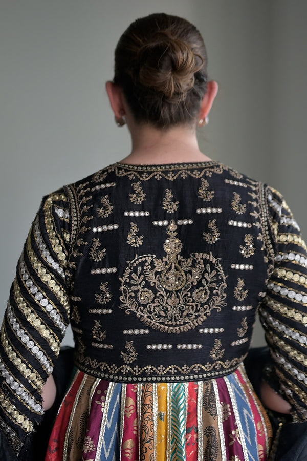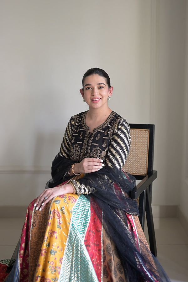 Radiate festive charm in this 3-piece pret ensemble in striking Black & Yellow. The Anarkali-style long kalidar frock features a jacket-inspired bodice, beautifully adorned with traditional multi-color hand-printed panels. Fitted sleeves and delicate gotta trims enhance its regal appeal, while the embroidered hem adds intricate detail. Paired with a sleek grip trouser and a net dupatta finished with four-sided embroidered borders, this look blends heritage aesthetics with contemporary grace.