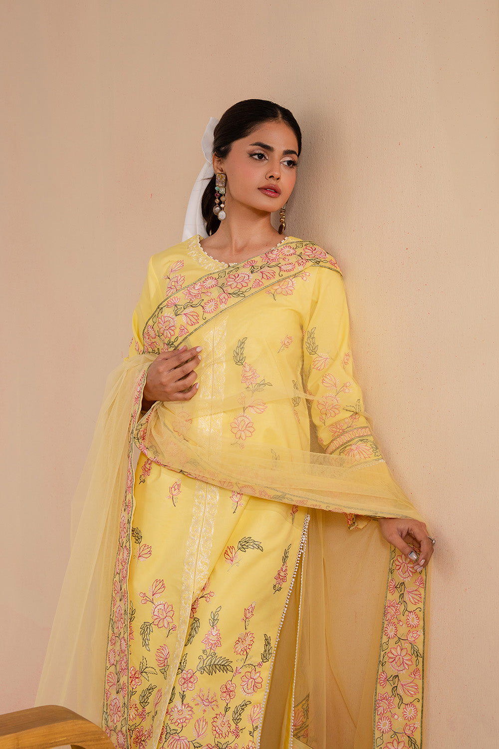 Brighten up your look with this radiant 3-piece ensemble in Sun Shine. The Lawn and Organza shirt exudes elegance, paired with a tailored Cotton trouser, while the delicate Net dupatta adds a touch of sheer grace.