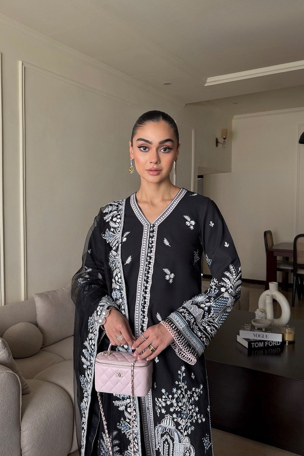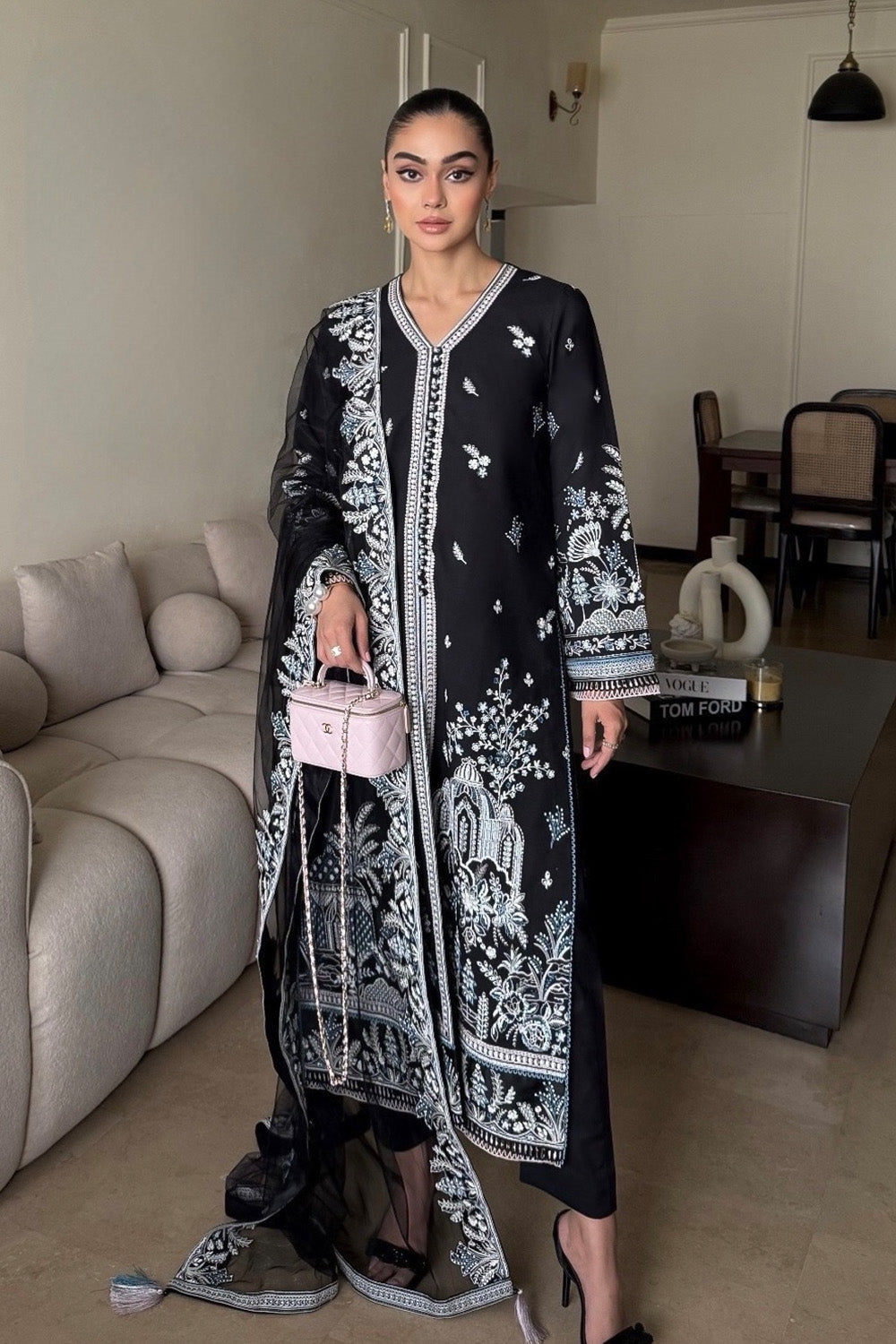 Step into timeless elegance with this captivating Black 3-piece pret outfit, designed to leave a lasting impression. The V-shaped neckline is adorned with exquisite embroidery that draws the eye with subtle sophistication. Straight sleeves feature intricate embroidery paired with delicate lace styling, blending classic and contemporary elements effortlessly. The look is completed with a net dupatta showcasing all-over embroidered borders enhanced with graceful tassel hangings, adding a touch of festive finesse. Paired with straight plain trousers, this ensemble strikes the perfect balance between understated charm and elevated style-ideal for your next special occasion.