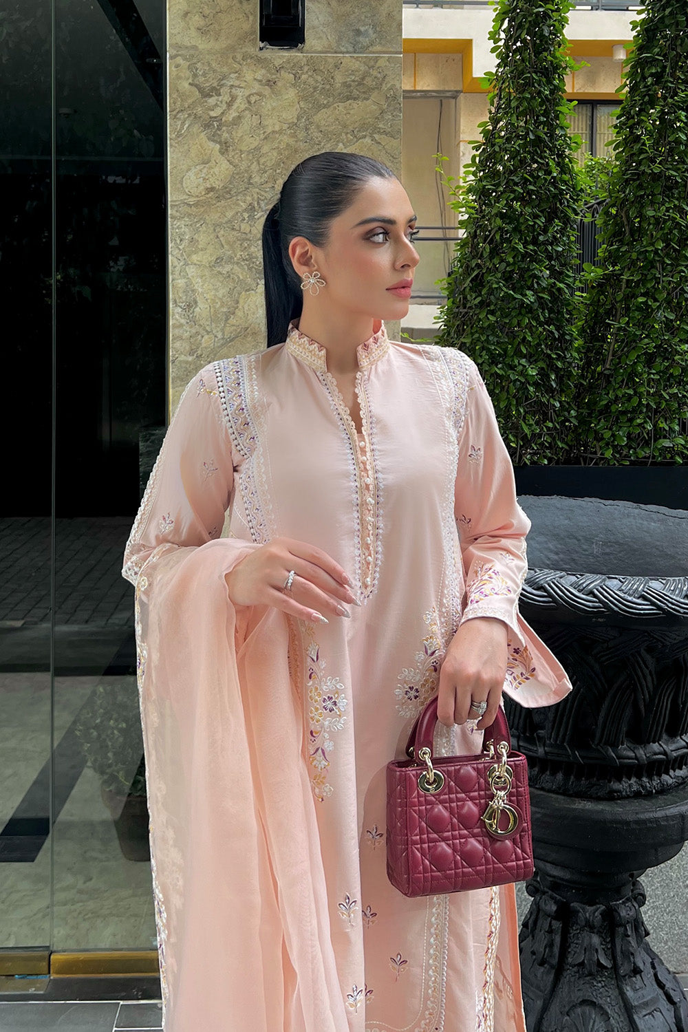 Step into effortless elegance with this stunning Peach 3-piece embroidered lawn suit, designed to brighten your wardrobe with its soft, graceful charm. The collar neckline frames the beautifully embroidered lawn front, while the delicate organza embroidered daman adds a touch of ethereal sophistication. Straight sleeves adorned with intricate embroidery create a harmonious balance of style and comfort. The organza embroidered dupatta drapes gracefully, completing the look with refined femininity. Paired with straight plain trousers featuring a subtle embroidered border, this ensemble is perfect for both casual gatherings and elegant occasions.