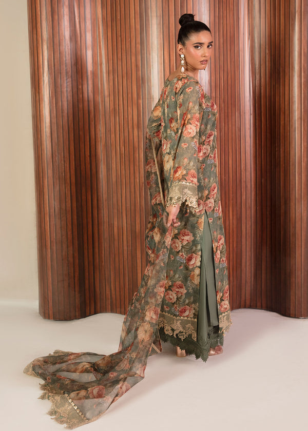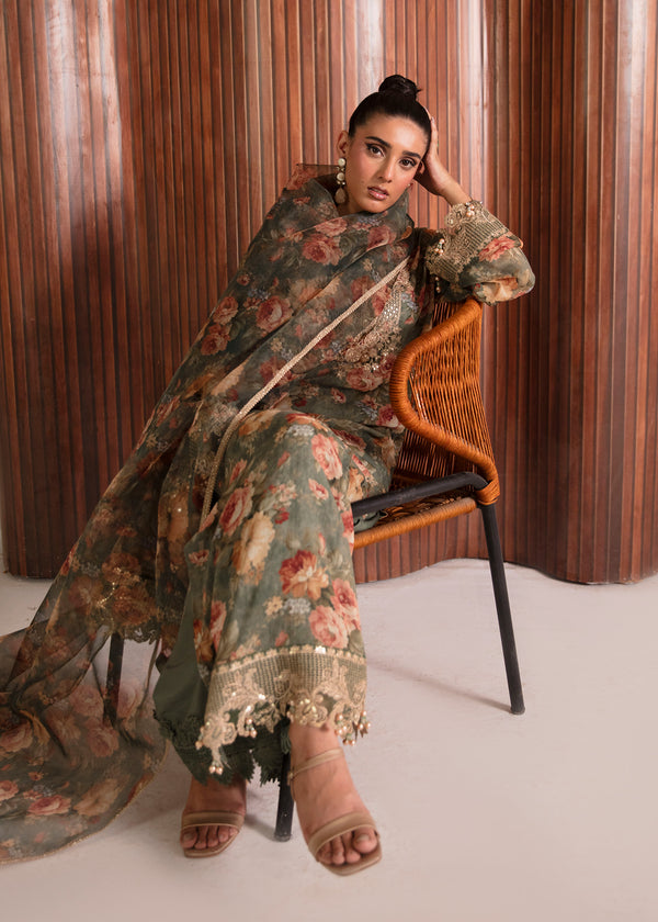 KAMAL - A Whisper of Nature's Grace. Breathe elegance into your wardrobe with Kamal, a dusty green dream in printed chiffon layered over a soft dyed inner. The organza printed dupatta, finished with zari lace, and raw silk trousers add refined charm. Embroidered neckline, sleeves, and daman complete the look with timeless sophistication and grace.
