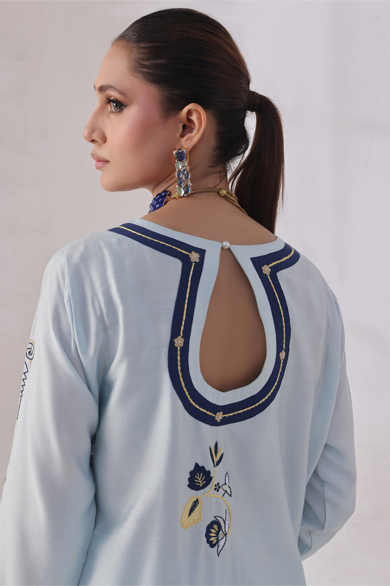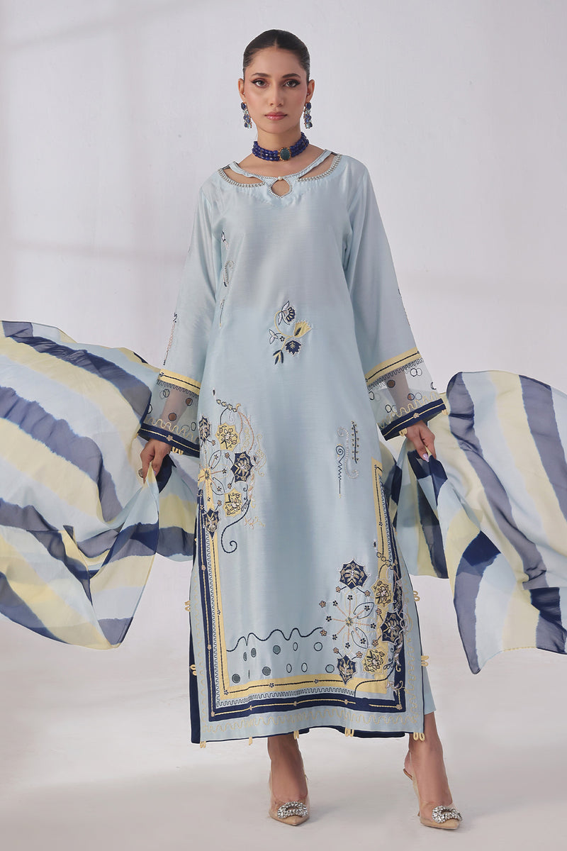 A vision of calm elegance and delicate craftsmanship, Nazneen is a 3-piece ensemble that captures the essence of soulful beauty. Crafted in luxurious Sheesha silk, the outfit features a baby blue long-style shirt adorned with intricate handmade thread embroidery and unique patterns that exude charm and finesse. The 2-color applique work on the daman adds a sophisticated contrast, while the silver neckline brings a refined, glamorous finish. Completing the look is a stunning pure silk tie and dye dupatta, radiating a dreamy blend of hues that make it truly one of a kind. Paired with straight pants for effortless grace, this outfit is perfect for festive gatherings, or any moment you wish to make memorable.