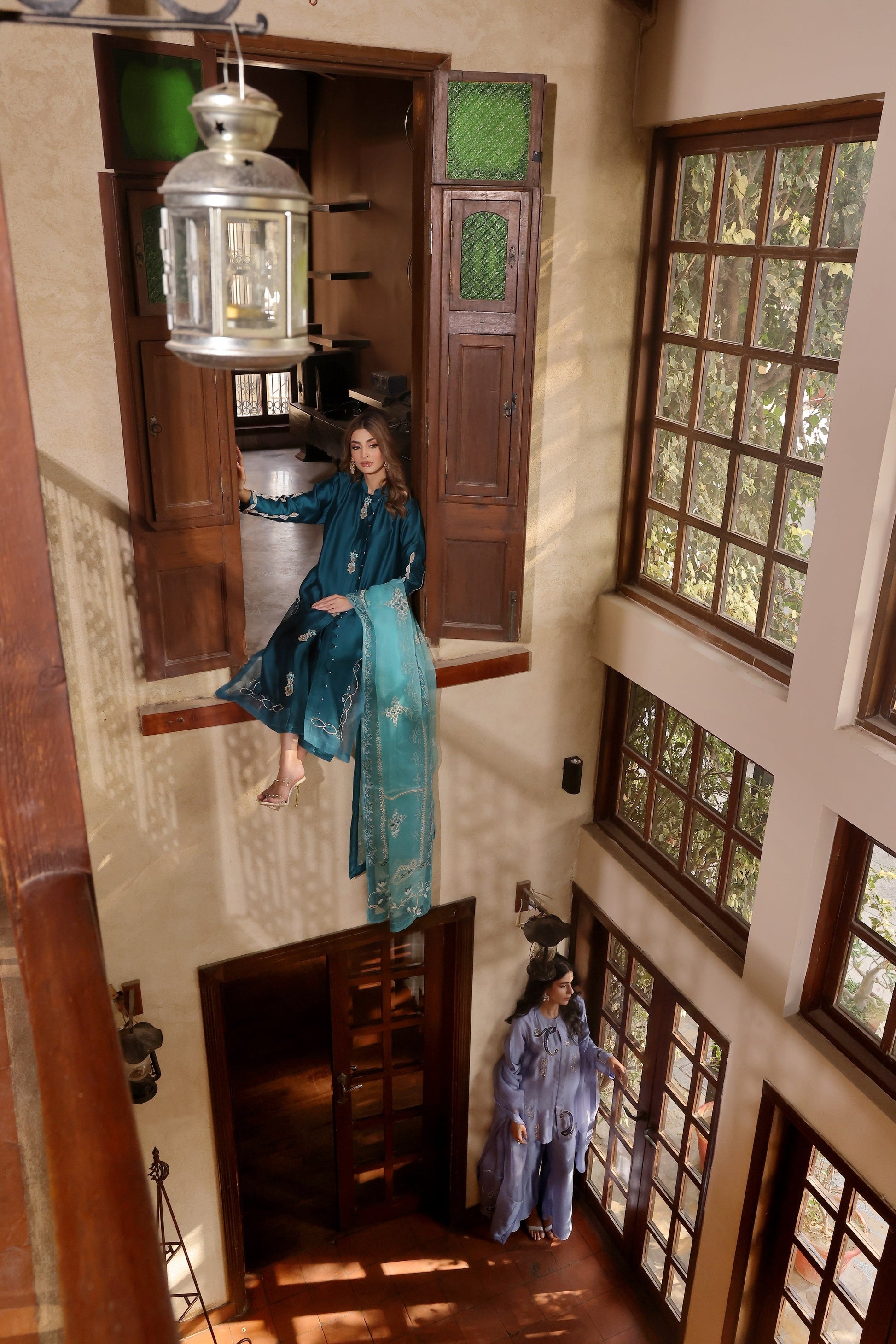 Jahanbano is an elegant teal green shirt with intricate stitching on the front patti and side chalk. The organza material is adorned with hand-embellished stone work, while the sleeves and back feature delicate appleaue embroidery. The accompanying aqua frozen pure organza dupatta boasts detailed embroidery in various patterns.