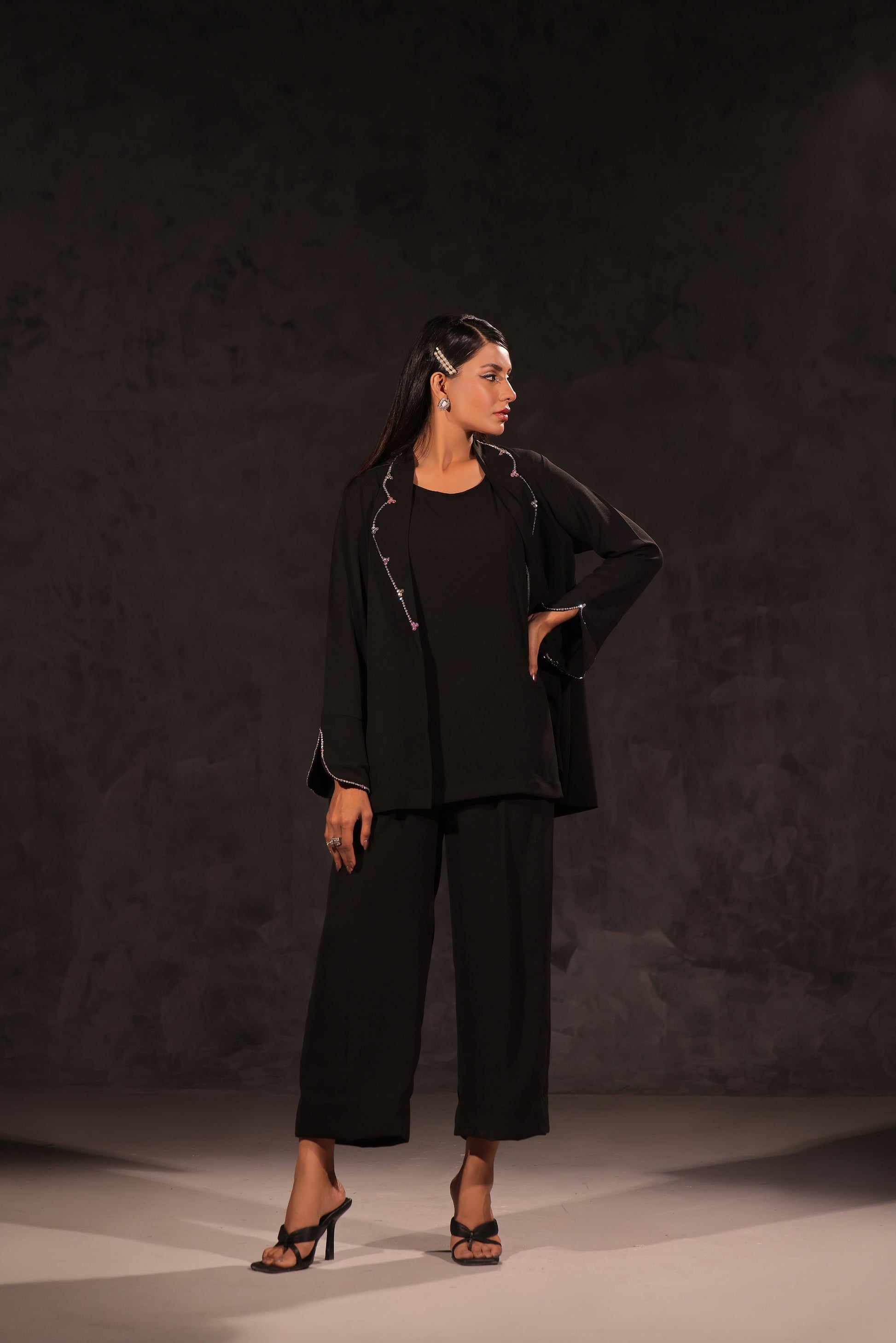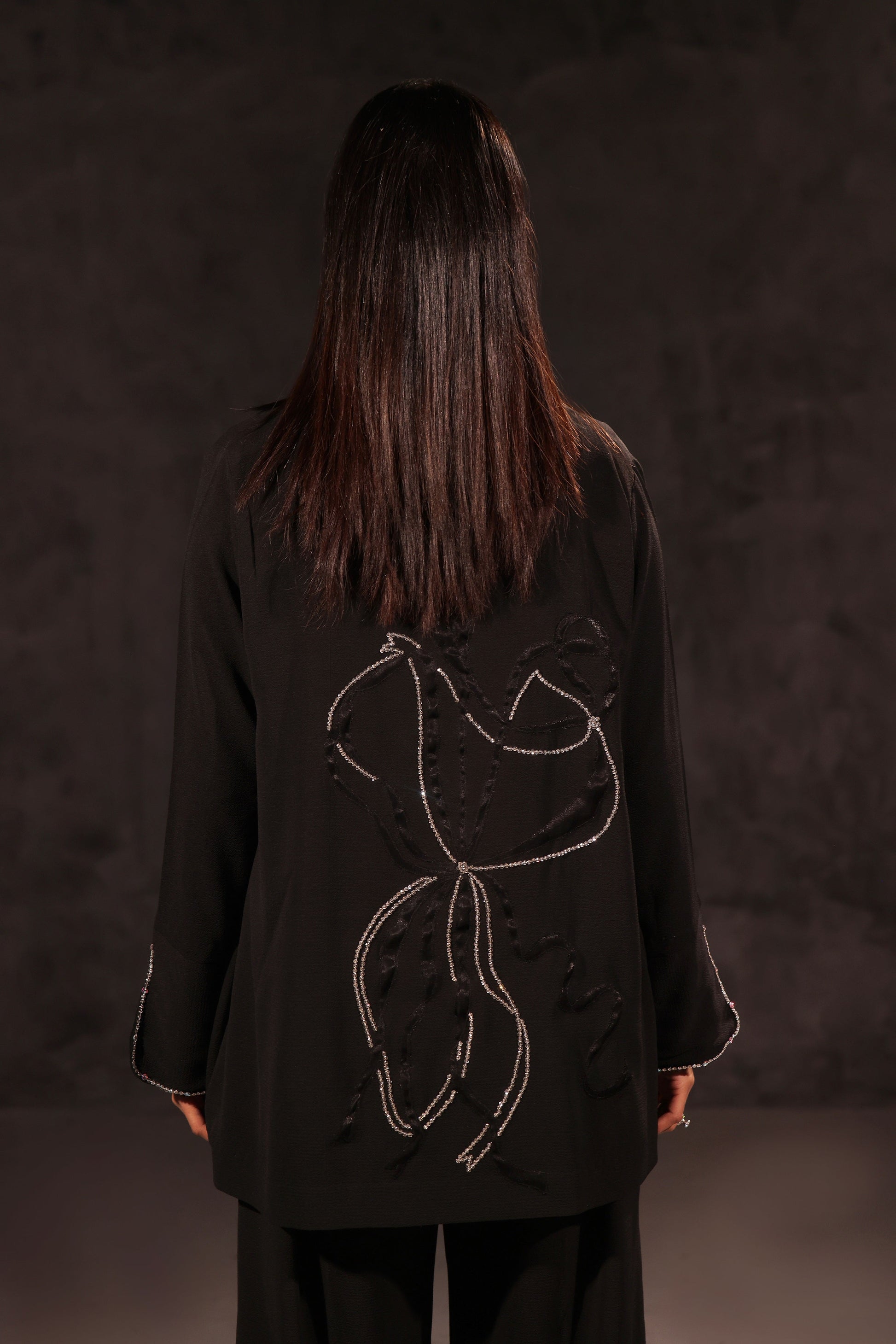 Elevate your wardrobe with Nyra's three piece black georgette jacket. Featuring a napail style neckline and delicate hand embellishments of swarovskies, it effortlessly adds a touch of glam. The back is appliqued with self silk and embellished with even more swarovskies. Perfect for any formal occasion.