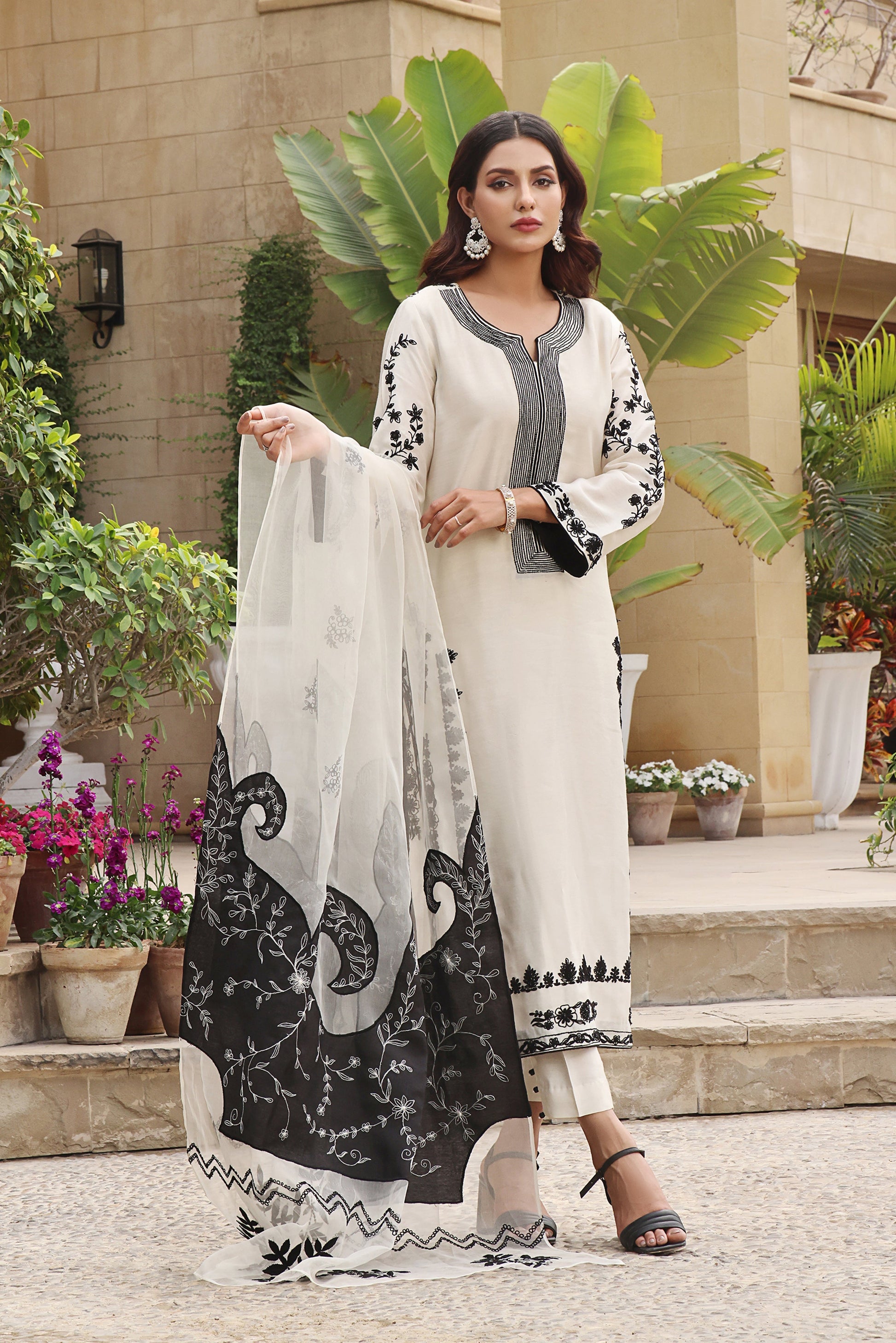 Introducing 'ð��™Ã°��šÃ°��«Ã°��¨Ã°��¨Ã°��§' - a vision of sheer elegance crafted from pure sheesha shaded silk, adorned with exquisite diamonte work spread across the front. Minimal edging on the neckline and sleeves adds a touch of sophistication, while delicate machine embroidery enhances the back. Complete your look with a pure organza dupatta adorned with stone spray, paired with a straight shalwar featuring intricate cutwork.