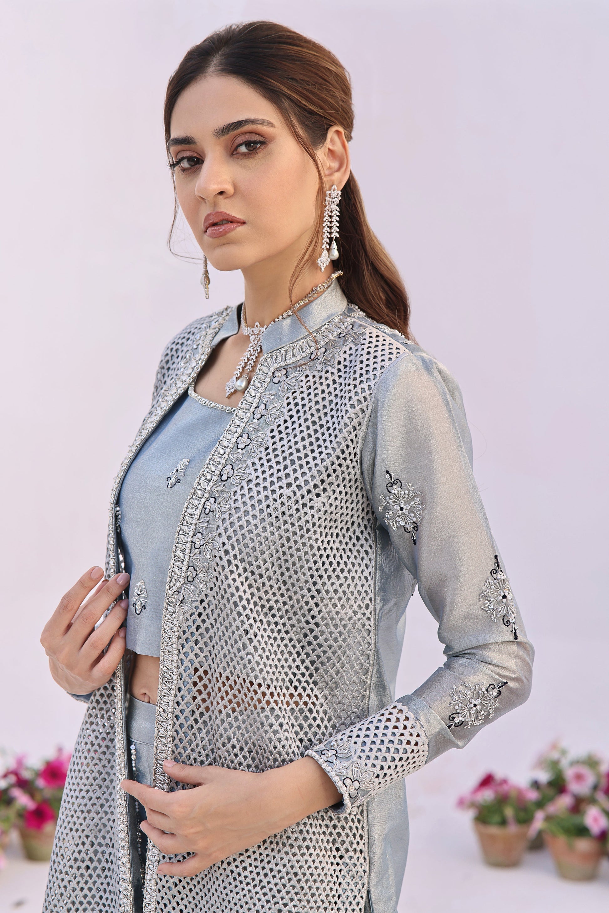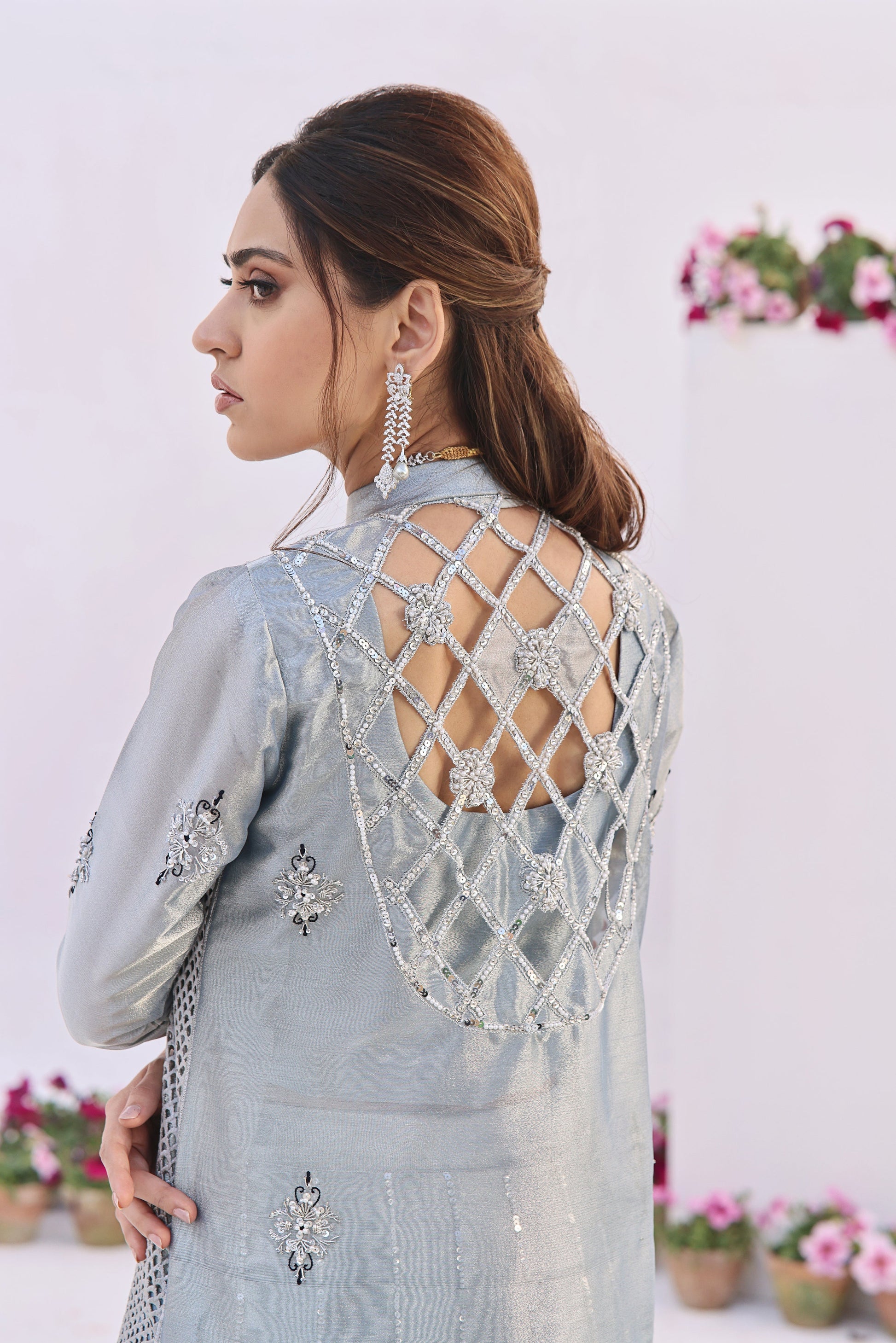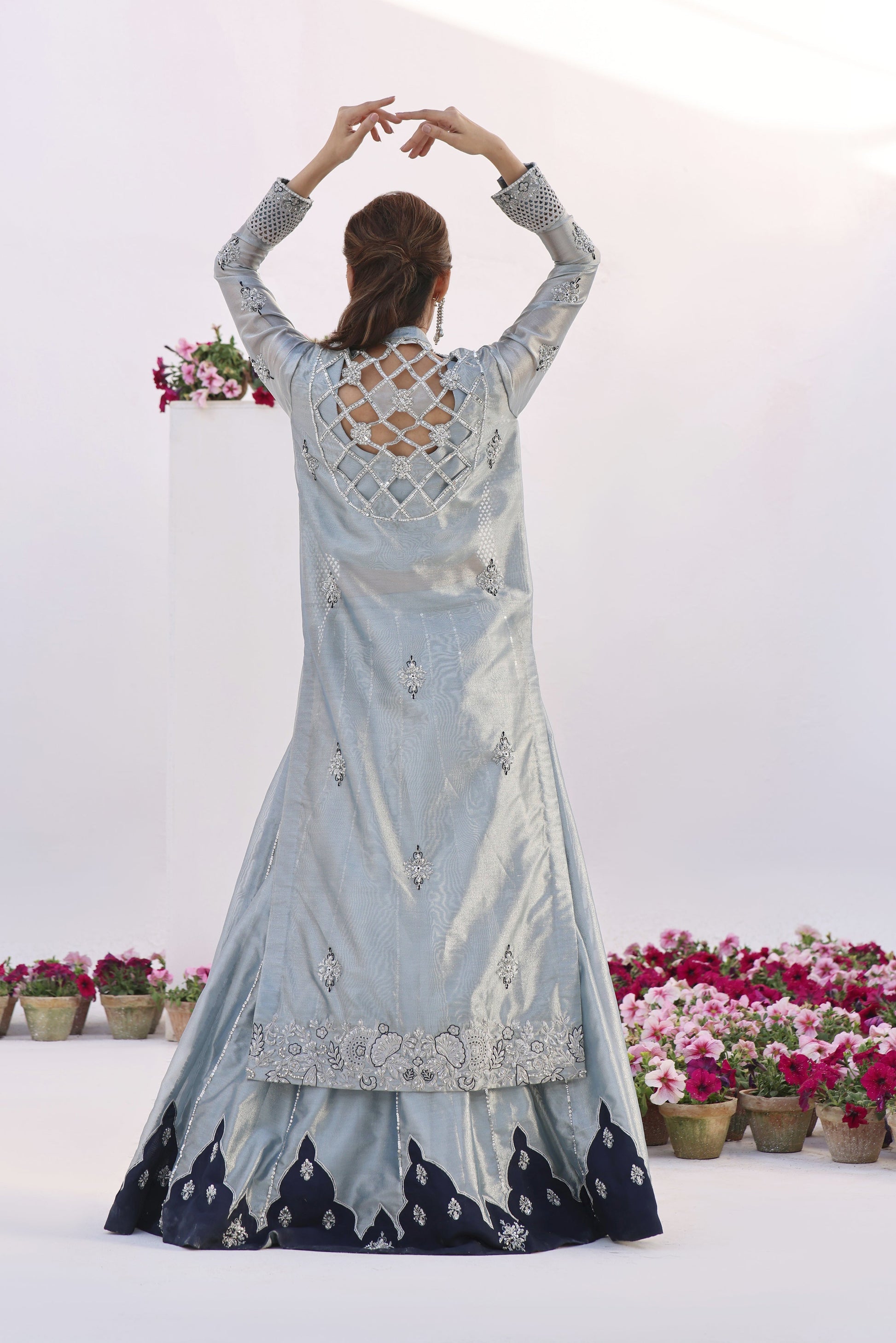 Introducing 'ð��’ð��šÃ°��§Ã°�� ð��«Ã°��¢Ã°��š' - a captivating blend of warmth and vibrancy! The burnt orange kora net ensemble is adorned with intricate kamdani motifs, complemented by turquoise rehsam and hand zardozi antique gold work in an enchanting angarkha style. Paired with sheer lamba chiffon Dhaka pants, this ensemble exudes grace and sophistication. Complete your look with the ethereal kora net dupatta, adorned with a shimmering sequence chan.
