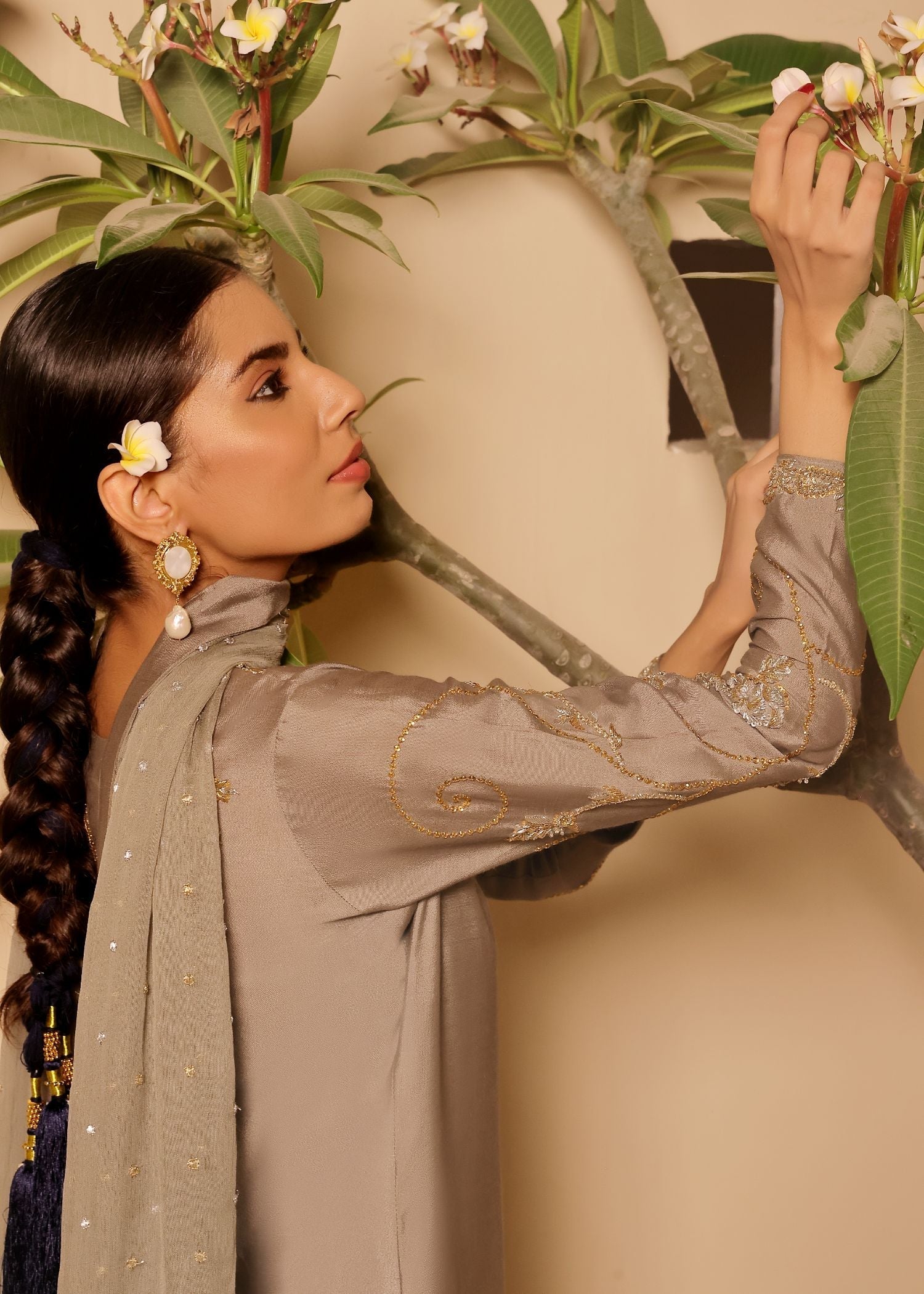 Introducing Mona Imran's exquisite short panelled shirt ensemble, a celebration of traditional artistry and modern style. This stunning shirt features intricate Kashmiri handwork on the neckline, daman, sleeves, and back, creating a richly detailed and elegant look.