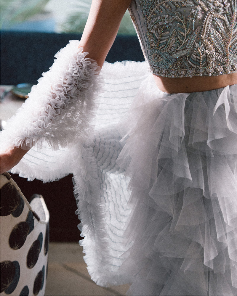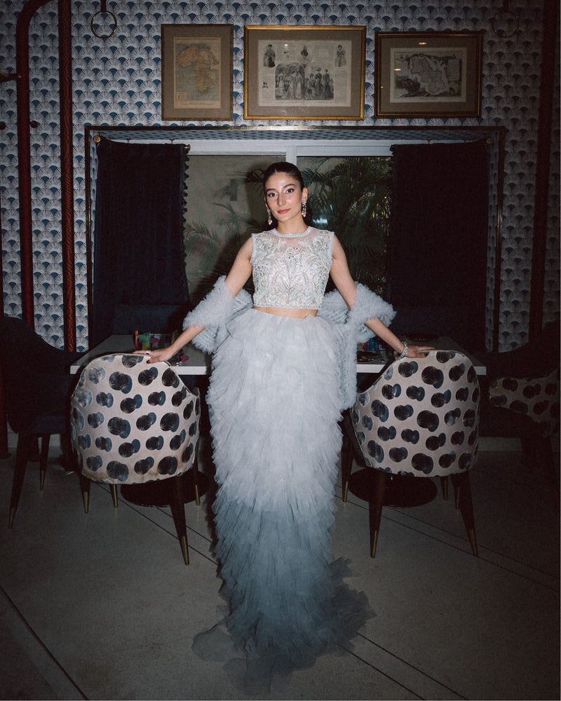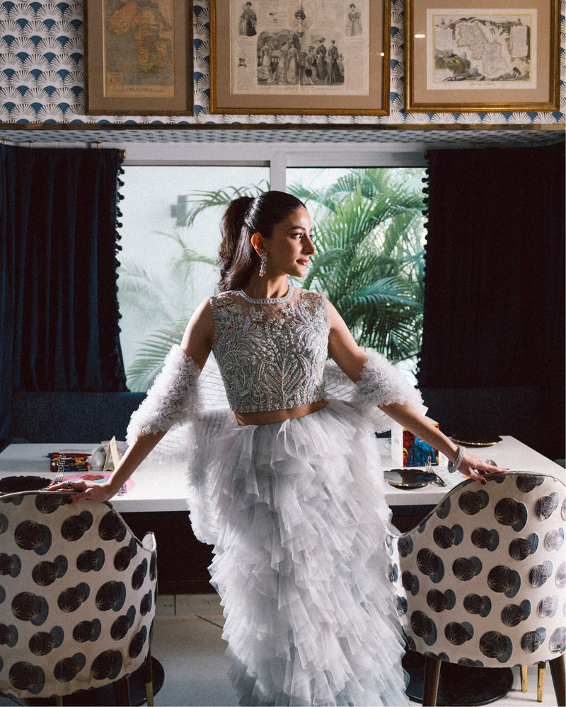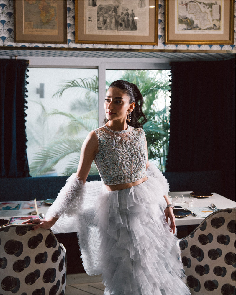 The amber-hued net tulle ruffled skirt of this stunning costume exudes elegance and movement with each stride. The skirt is a statement of effortless elegance, perfect for creating a dramatic yet refined look. A gorgeous embroidered shirt with delicately worked sleeves completes the ensemble and adds a touch of artisanal detail to the skirt. The combination of textures and colors make this design ideal for Eid celebrations and festive soirees, oozing charm and refinement.