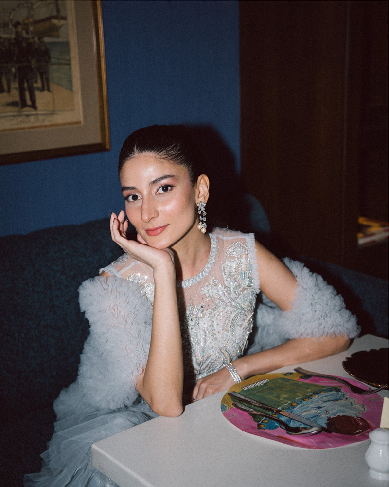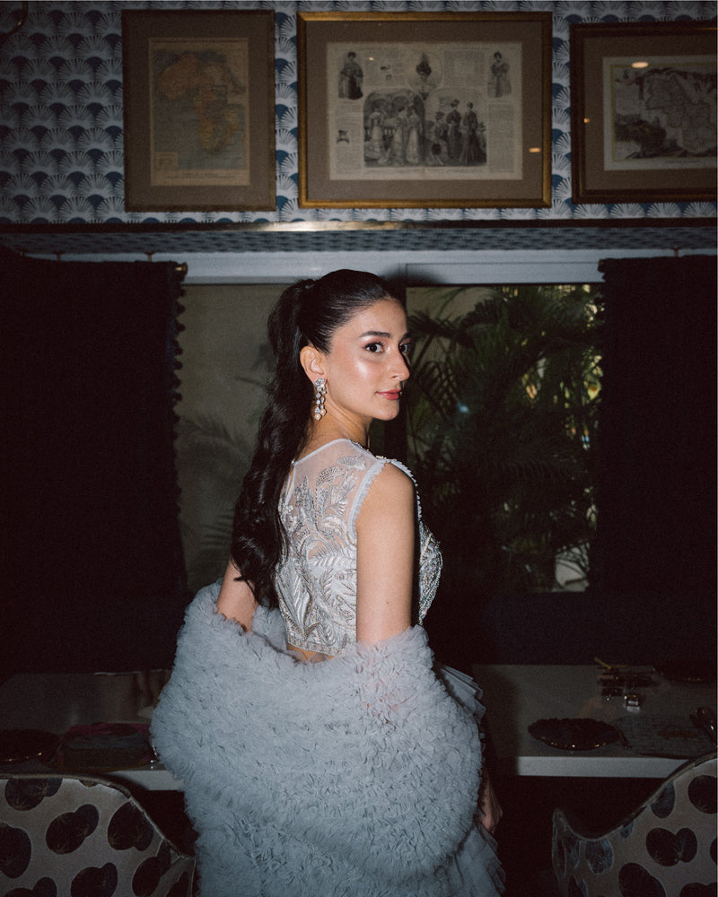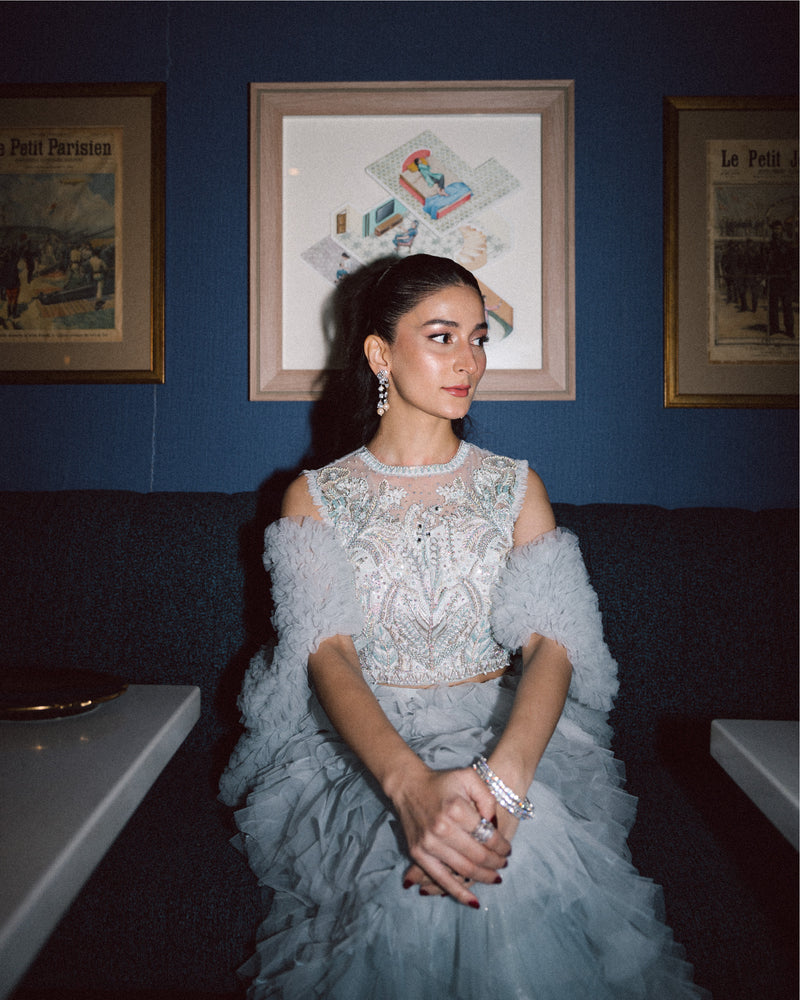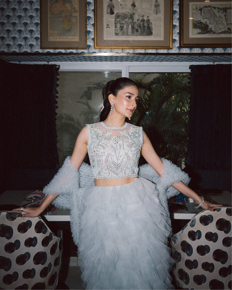 The amber-hued net tulle ruffled skirt of this stunning costume exudes elegance and movement with each stride. The skirt is a statement of effortless elegance, perfect for creating a dramatic yet refined look. A gorgeous embroidered shirt with delicately worked sleeves completes the ensemble and adds a touch of artisanal detail to the skirt. The combination of textures and colors make this design ideal for Eid celebrations and festive soirees, oozing charm and refinement.