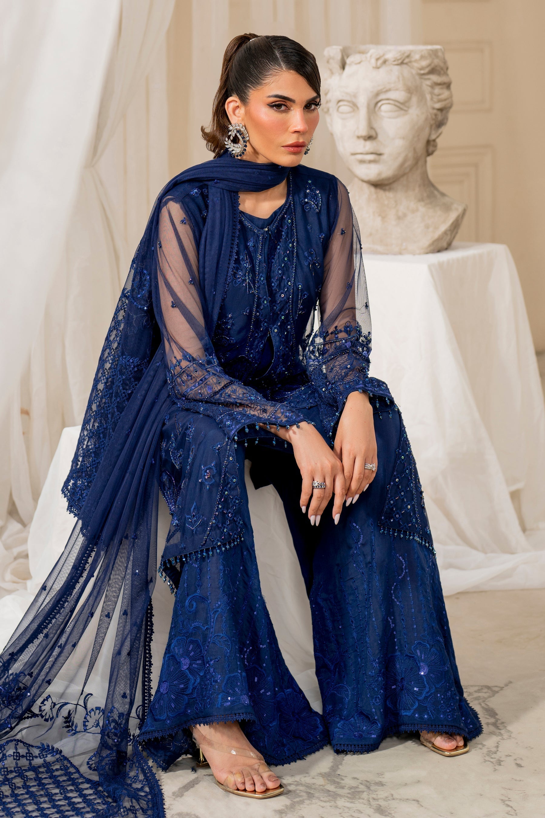 This navy-blue ensemble has a richly detailed gown comprising of same base adda embellishments, cut dana & crystal work, machine embroidery & sequin work. Handmade hangings along with textured pattern in the mid look ethereal. The bold floral motifs make the statement on the front. The sleeves of Nayal are adorned with heavy embellished border with scrolling work, crystals & sequin with thread embroidery. Paired with dramatic flared culottes adorned with same as base embroidered floral motifs & line texture along with sequin work. Topped with heavily embroidered dupatta with mini motif spray, four sided trims & two-sided heavy geometrical patterns embroidered pallu with sequin work, finished with lace, Nayal comes with PK raw silk inner.
