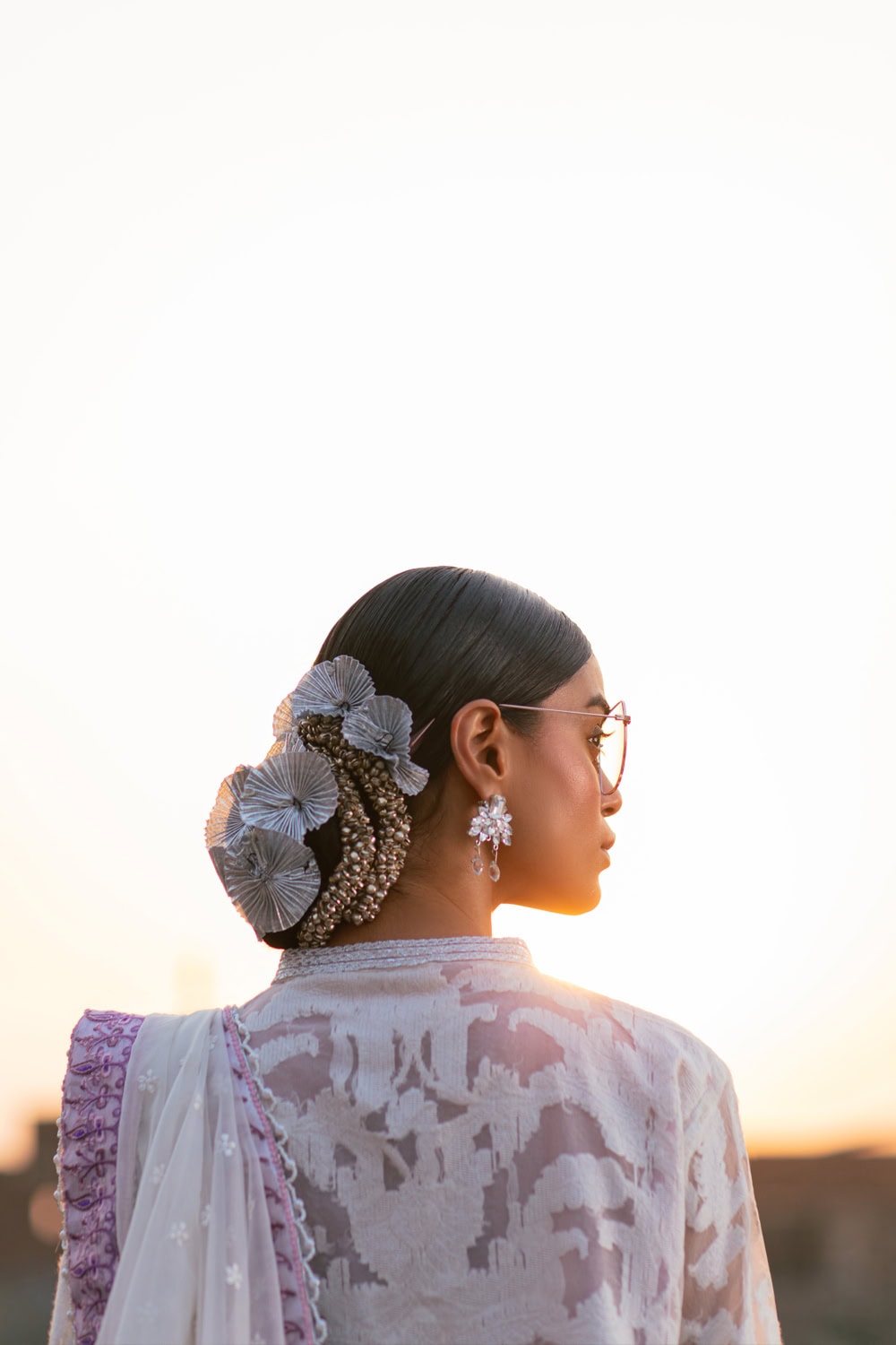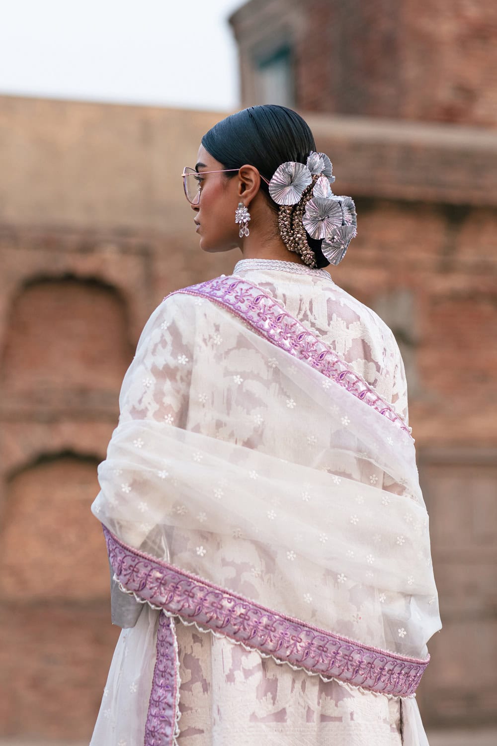 Immerse yourself in the captivating allure ofADIRA, a stunning ensemble exuding timeless elegance. The immaculate white self-organza shirt, adorned with silk thread embroidery, silver lappa, and gota braids, stands as a true masterpiece of artistry, enhanced by pearl and diamante accents. This ensemble epitomises heritage and sophistication. The celestial organza dupatta, featuring silk thread embroidery, silver lappa, and a delicately embroidered border, adds a celestial touch to the attire. Complementing the ensemble is a pure raw silk tulip shalwar, embellished with embroidered scallops.Adira seamlessly combines tradition with modern allure, appealing to all generations.