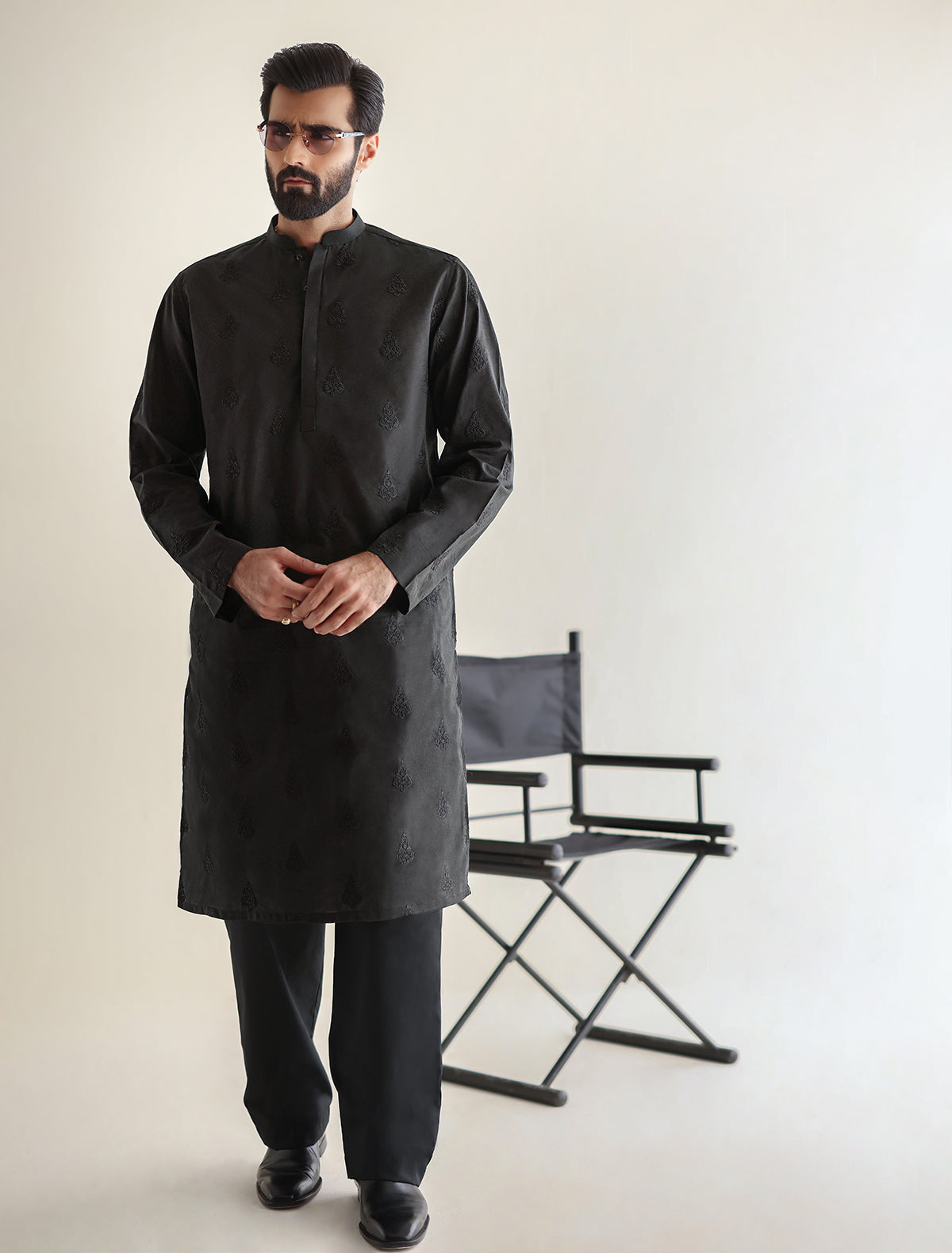 Pakistani Menswear | Ismail Farid - BLACK EMBROIDERED KURTA