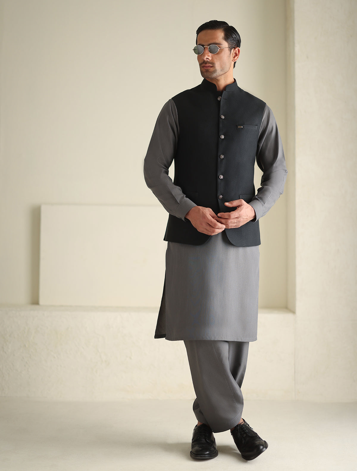 Pakistani Menswear | Ismail Farid - BLACK TEXTURED WAISTCOAT