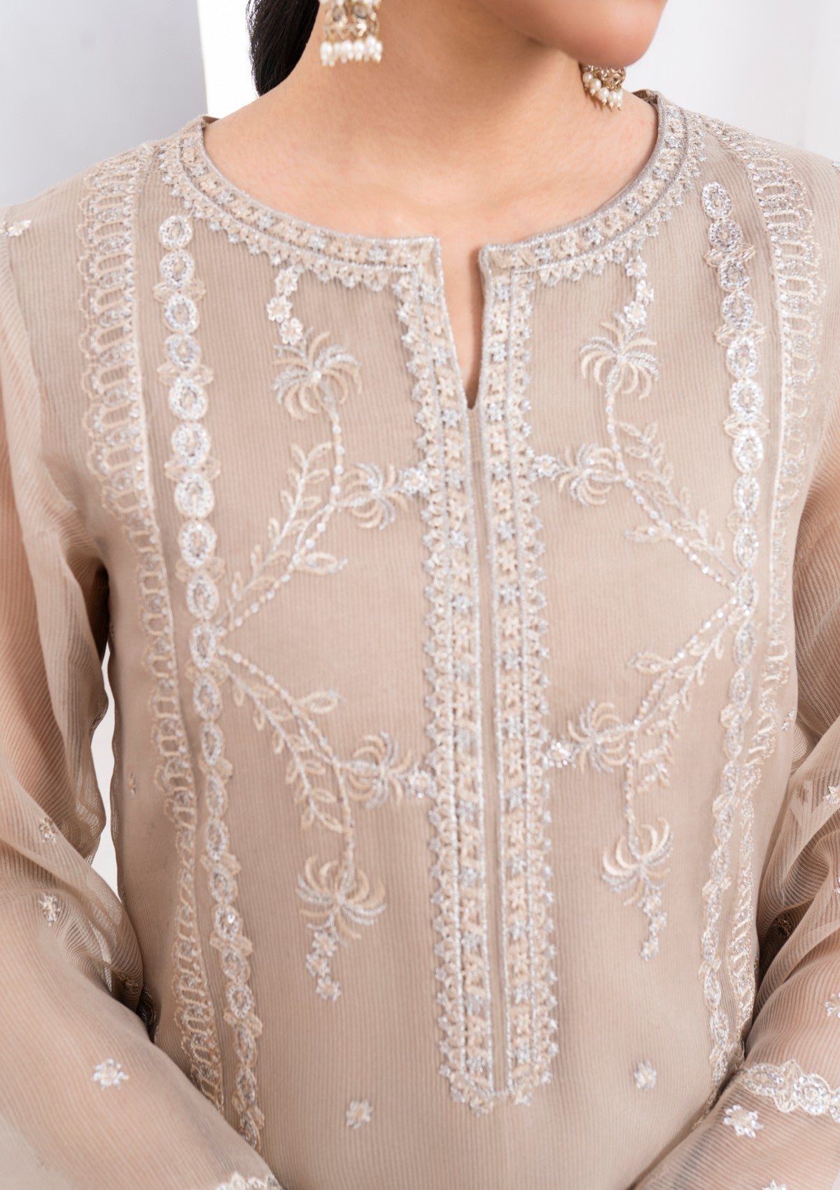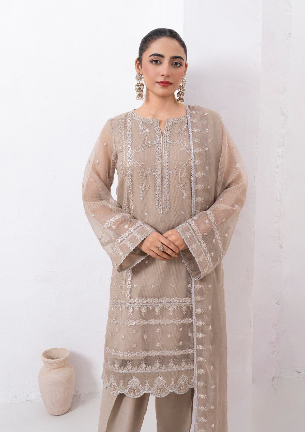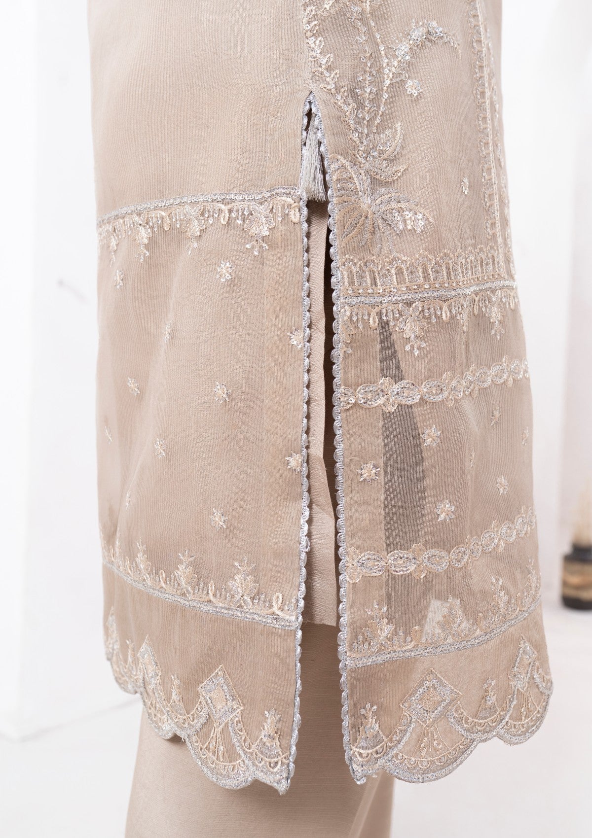 This exquisite 4-piece beige cambric organza set is adorned with delicate silver tilla embroidery, a touch of elegance. The soft, beige organza fabric serves as a perfect canvas, beautifully highlighted by the intricate silver tilla work that embellishes the neckline, cuffs, and hemline. It has Pk raw silk shalwar and inner with chiffon dupatta which has silver tilla embroidery all around borders with lace detailing. The embroidery features palm trees patterns and motifs that enhance the luxurious appeal of the ensemble. A versatile choice from formal events to festive gatherings.