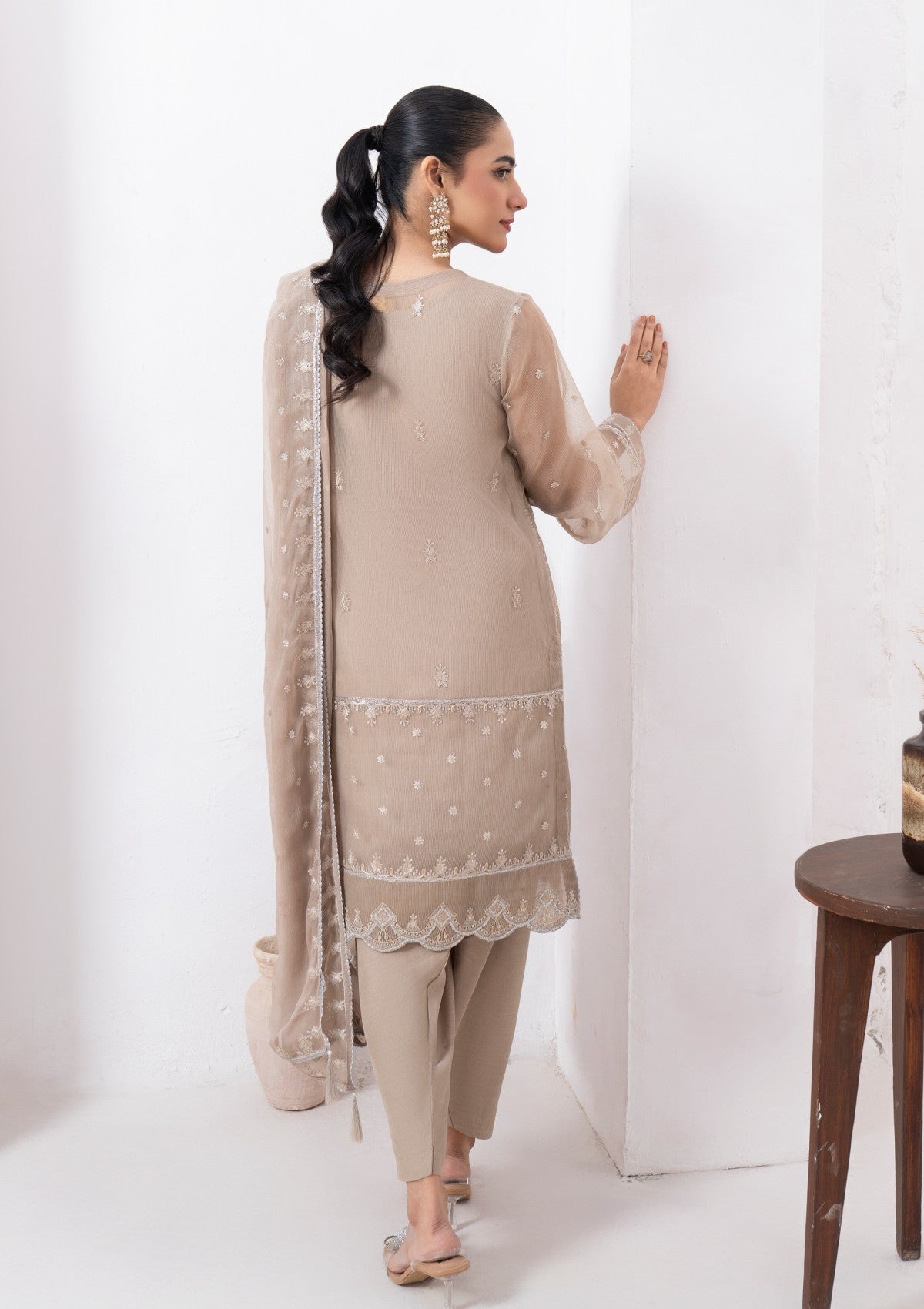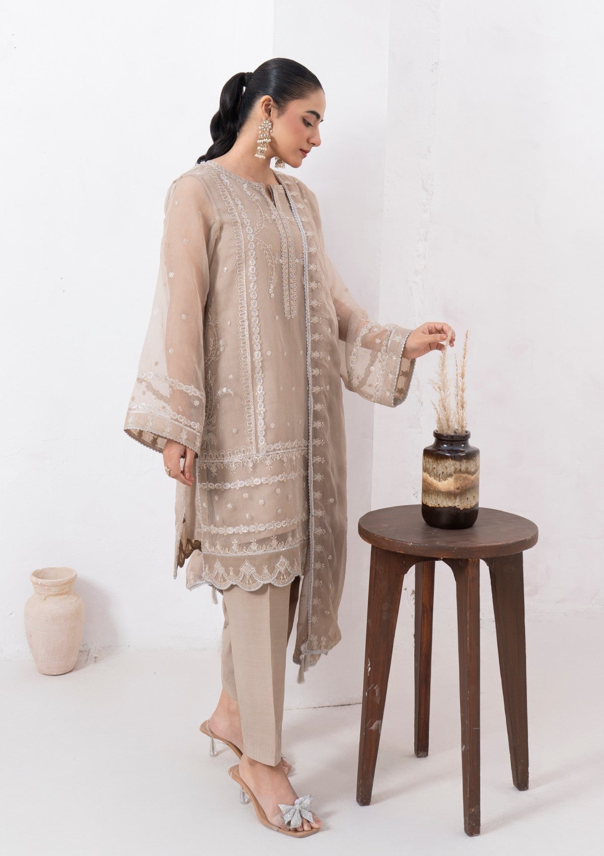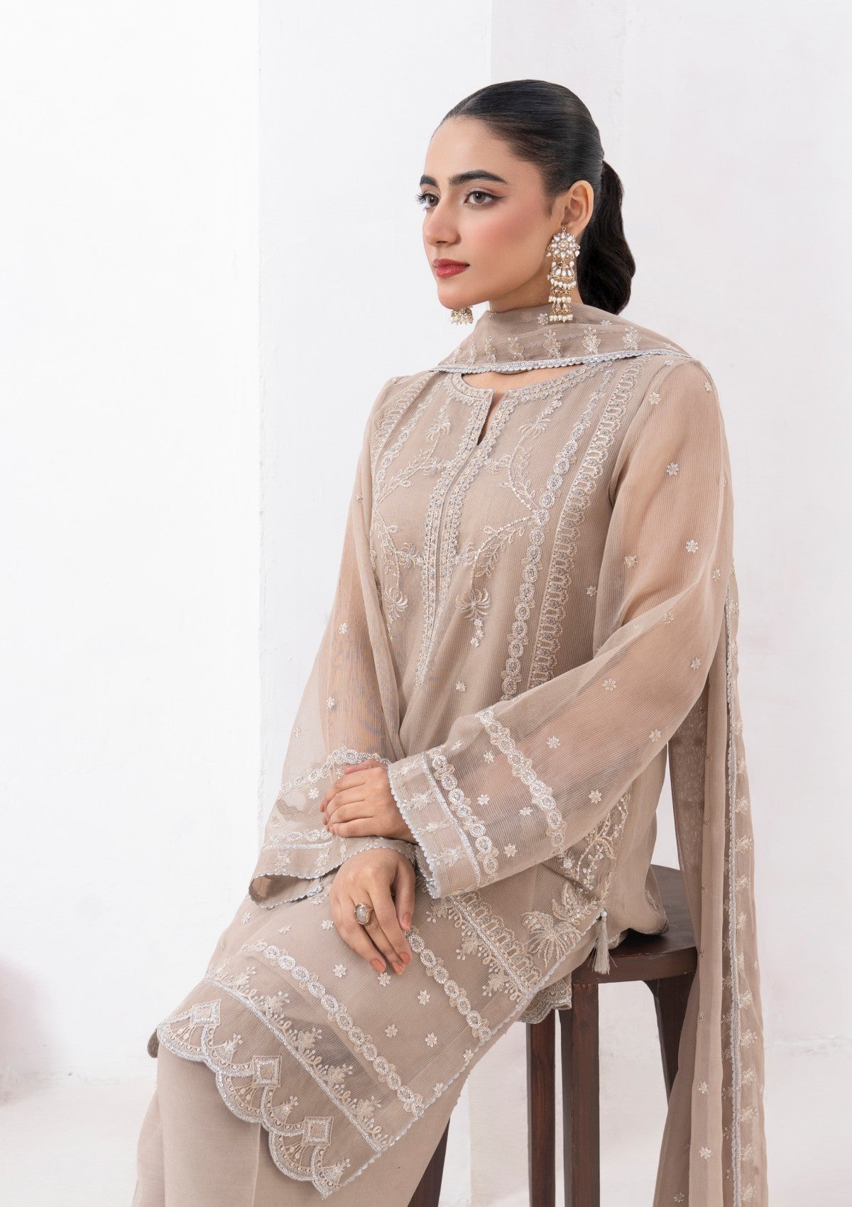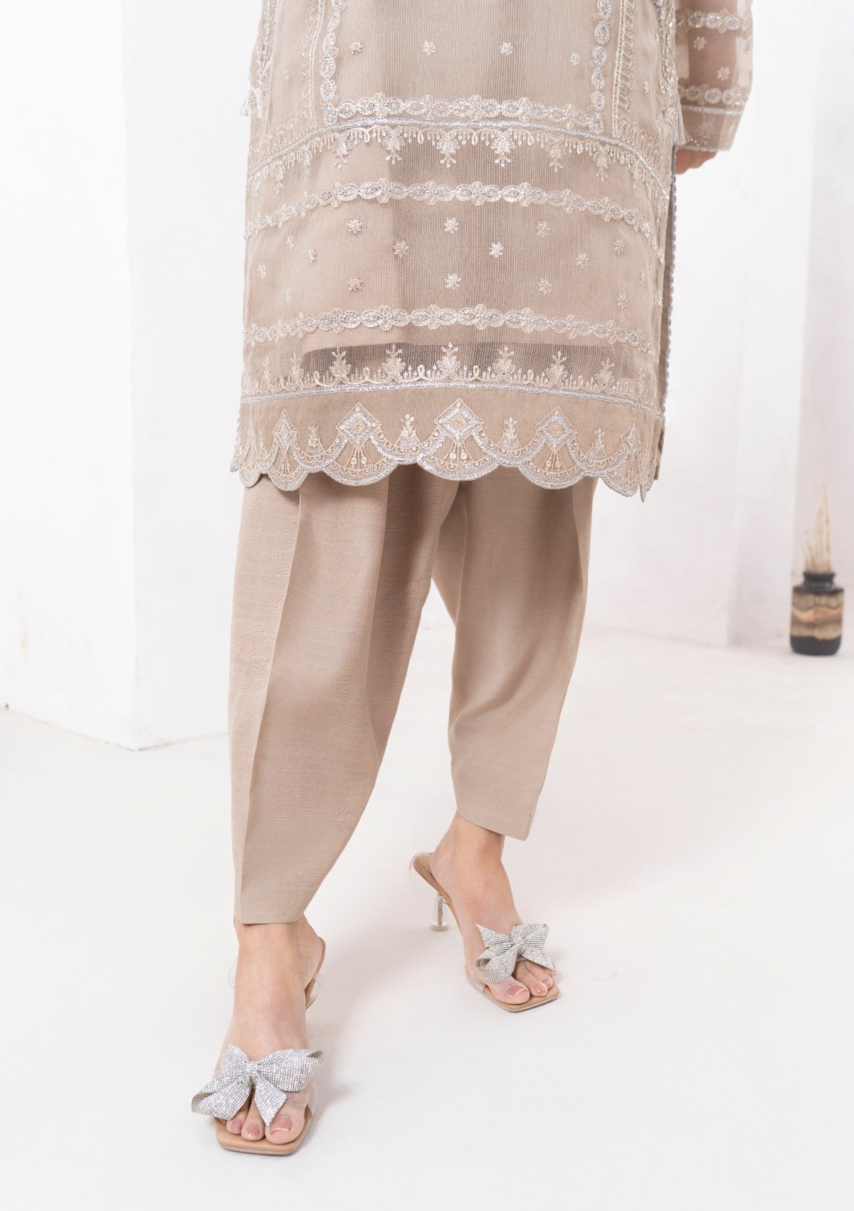 This exquisite 4-piece beige cambric organza set is adorned with delicate silver tilla embroidery, a touch of elegance. The soft, beige organza fabric serves as a perfect canvas, beautifully highlighted by the intricate silver tilla work that embellishes the neckline, cuffs, and hemline. It has Pk raw silk shalwar and inner with chiffon dupatta which has silver tilla embroidery all around borders with lace detailing. The embroidery features palm trees patterns and motifs that enhance the luxurious appeal of the ensemble. A versatile choice from formal events to festive gatherings.