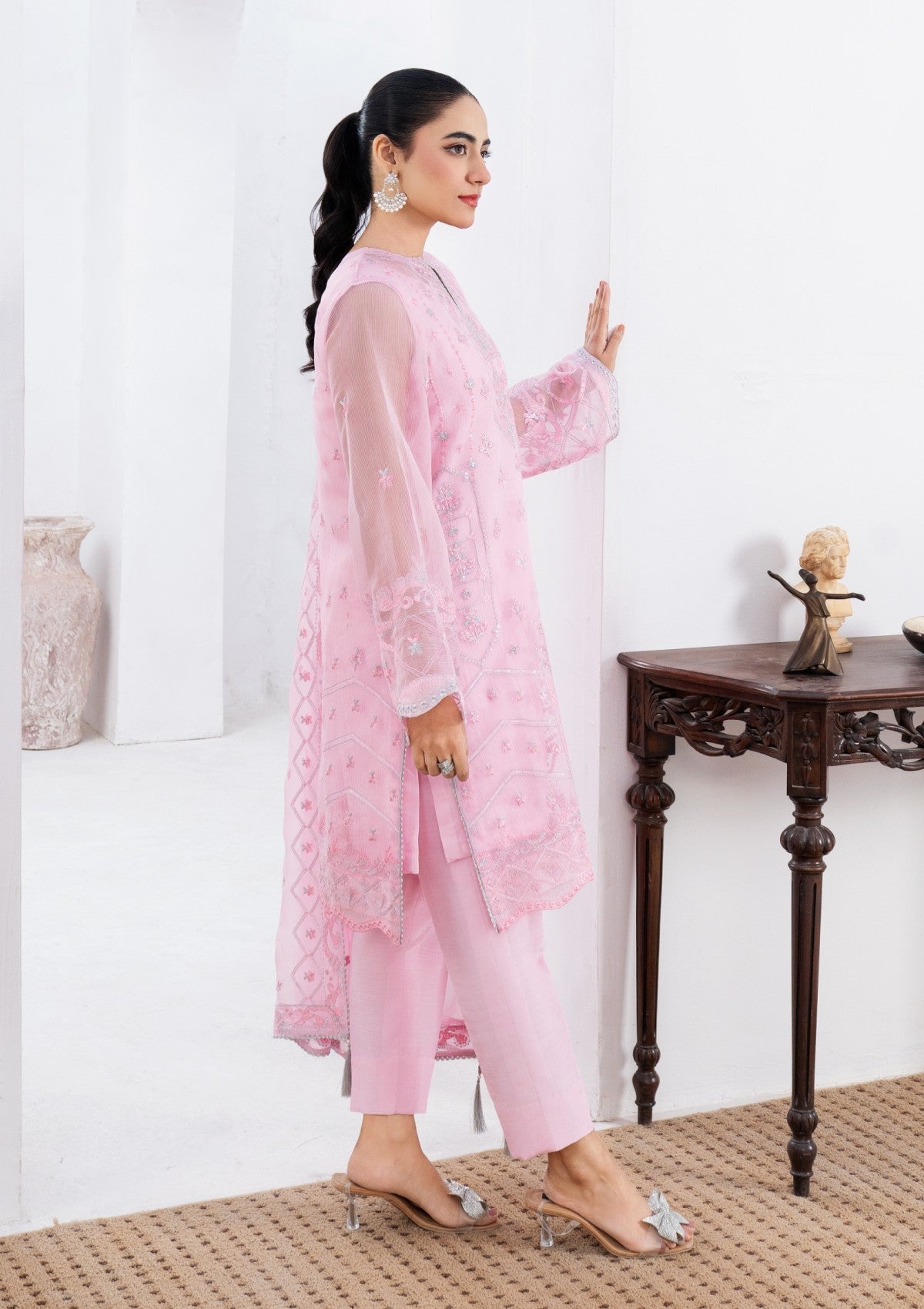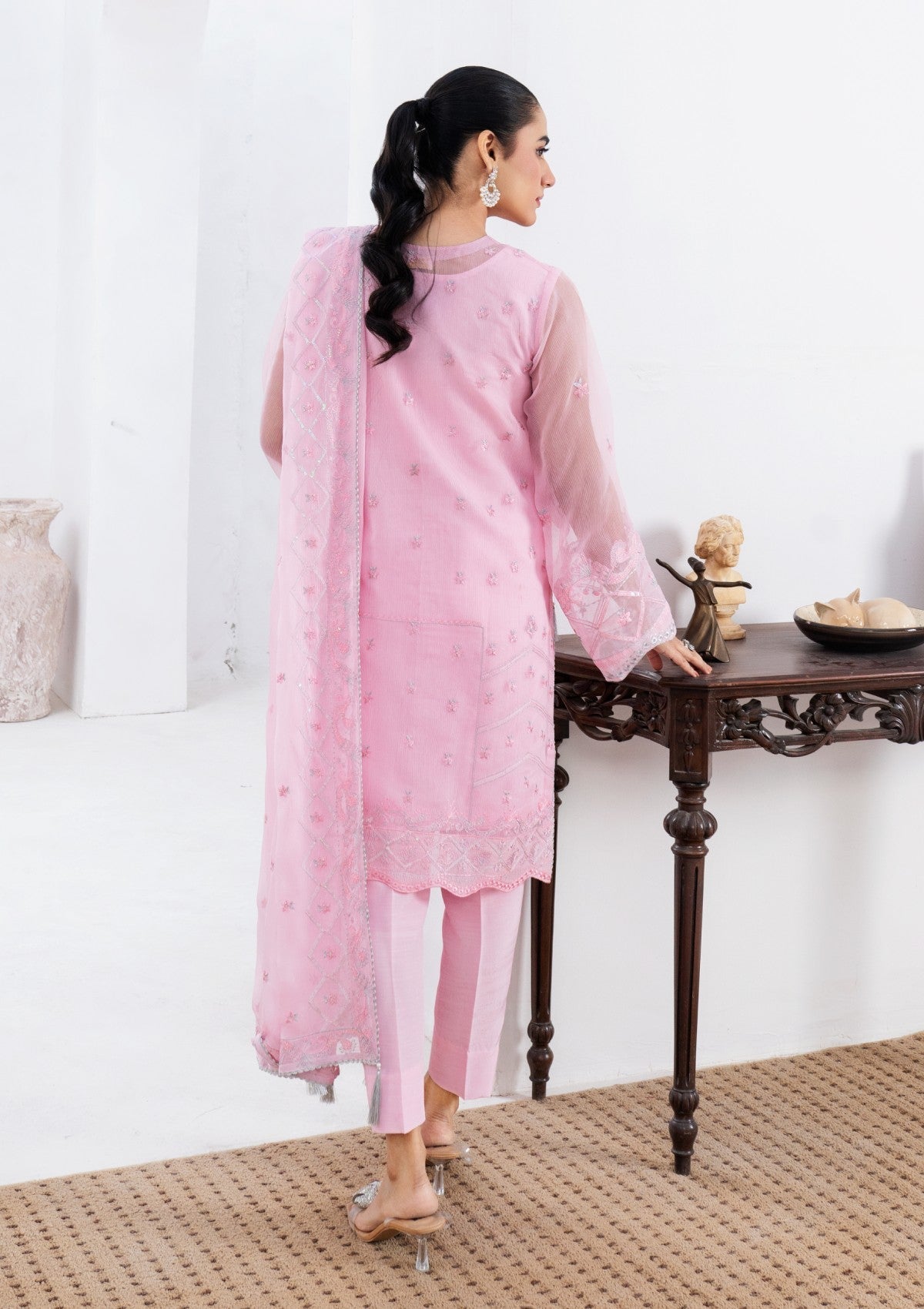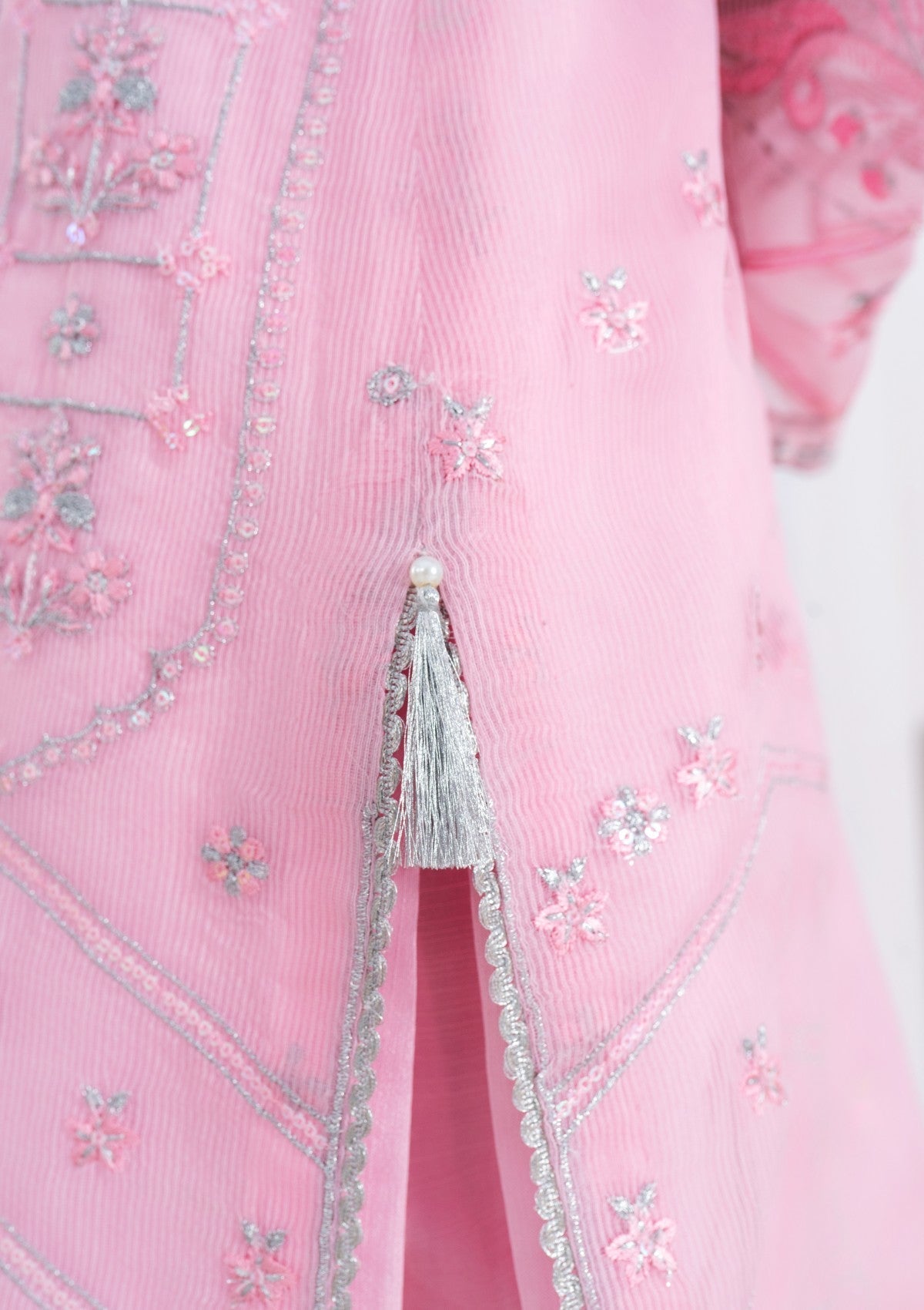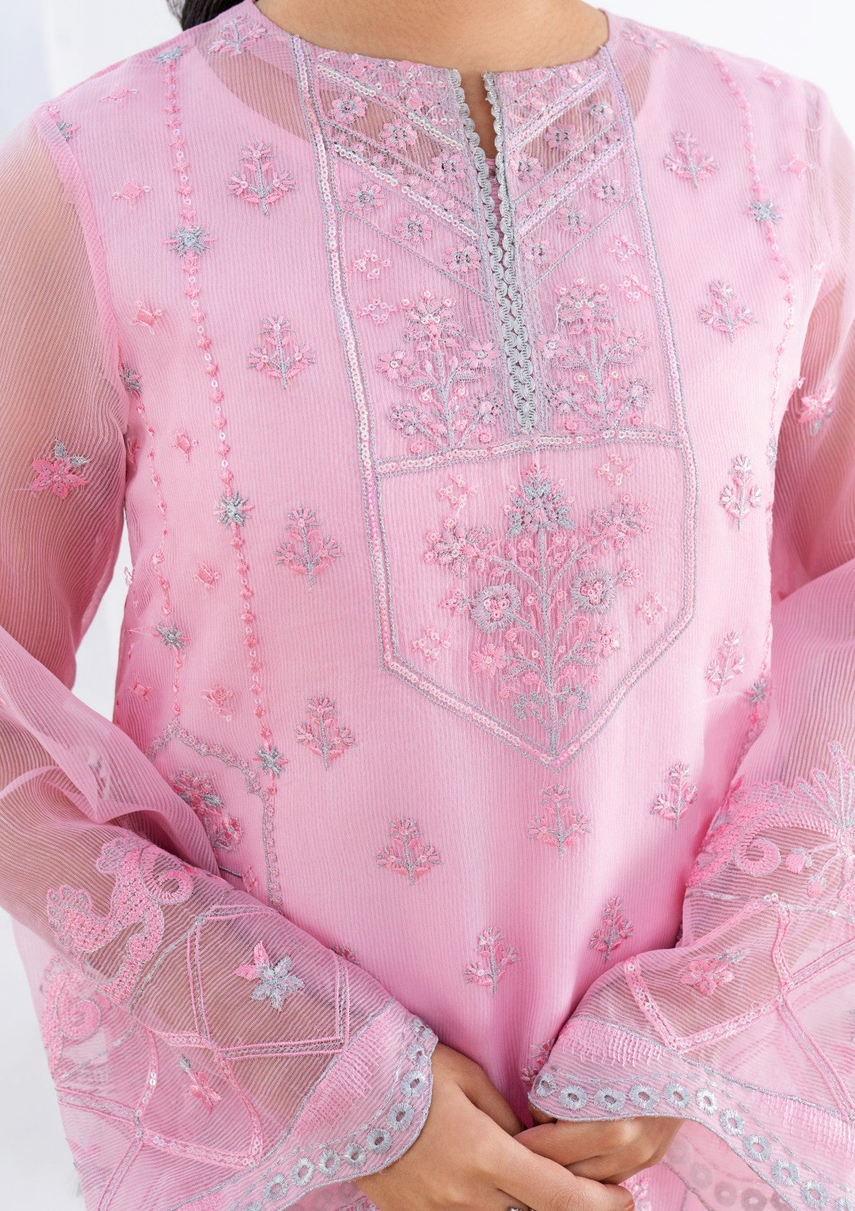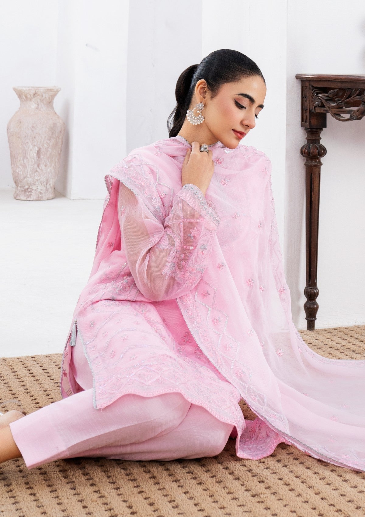 This enchanting 2-piece pink cambric cotton set is adorned with delicate silver tilla embroidery, exuding an air of refined elegance. The soft, pastel pink fabric with shimmering silver tilla work, which graces the neckline, sleeves, and hemline with delicate floral and vine motifs. It has Pk raw silk trouser and inner with chiffon dupatta which has silver tilla embroidery all around borders with lace detailing. The embroidery captures the light beautifully, creating a sense of ethereal sparkle make versatile addition to any wardrobe.