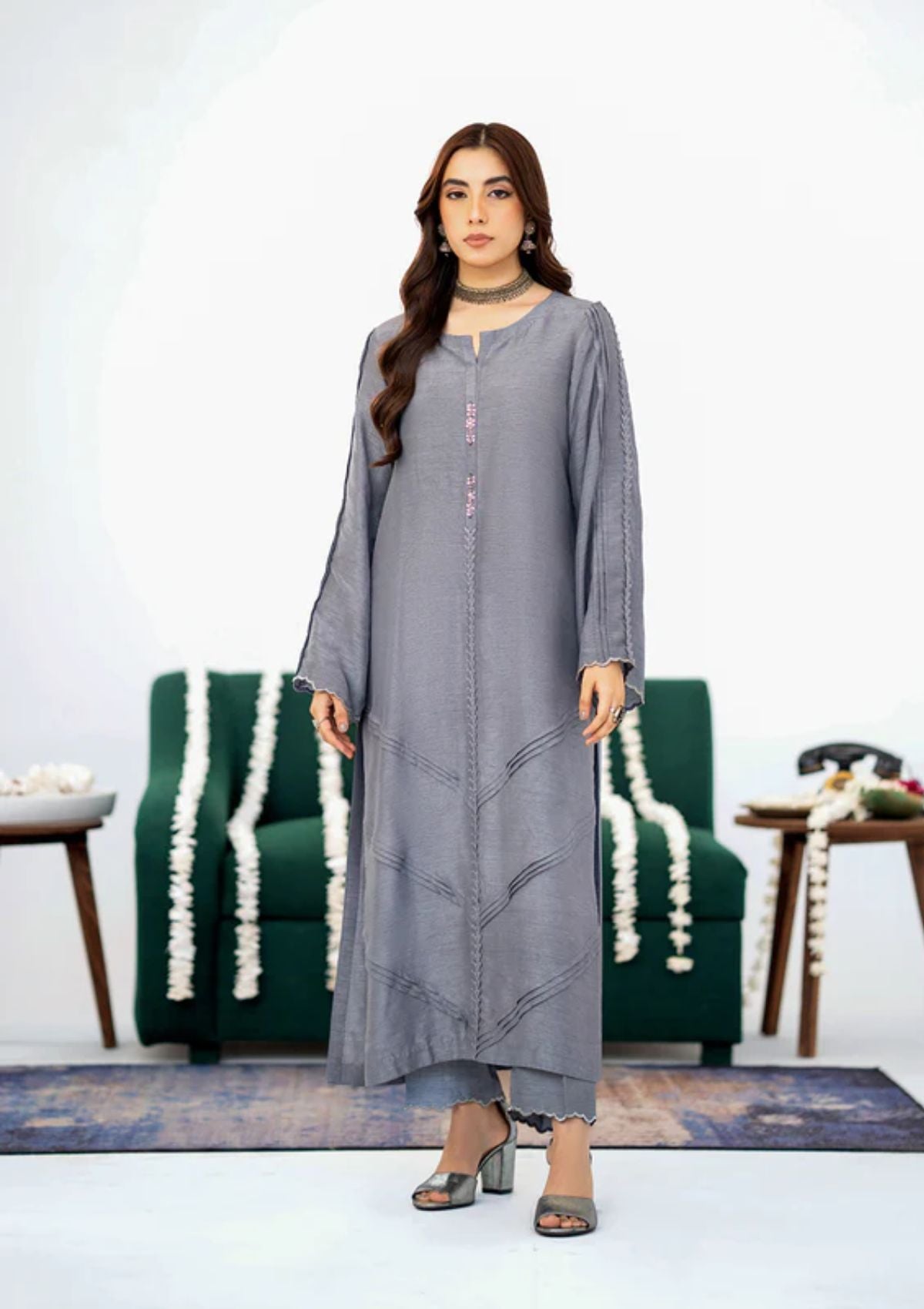 - Indulge in elegance with our grey silk ensemble: a sleek loose-fit shirt adorned with hand-embellished buttons on the neckline and pleated sleeves finished with tilla scallop details. Paired with classic izaar pants featuring tilla scallops, this ensemble exudes sophistication.