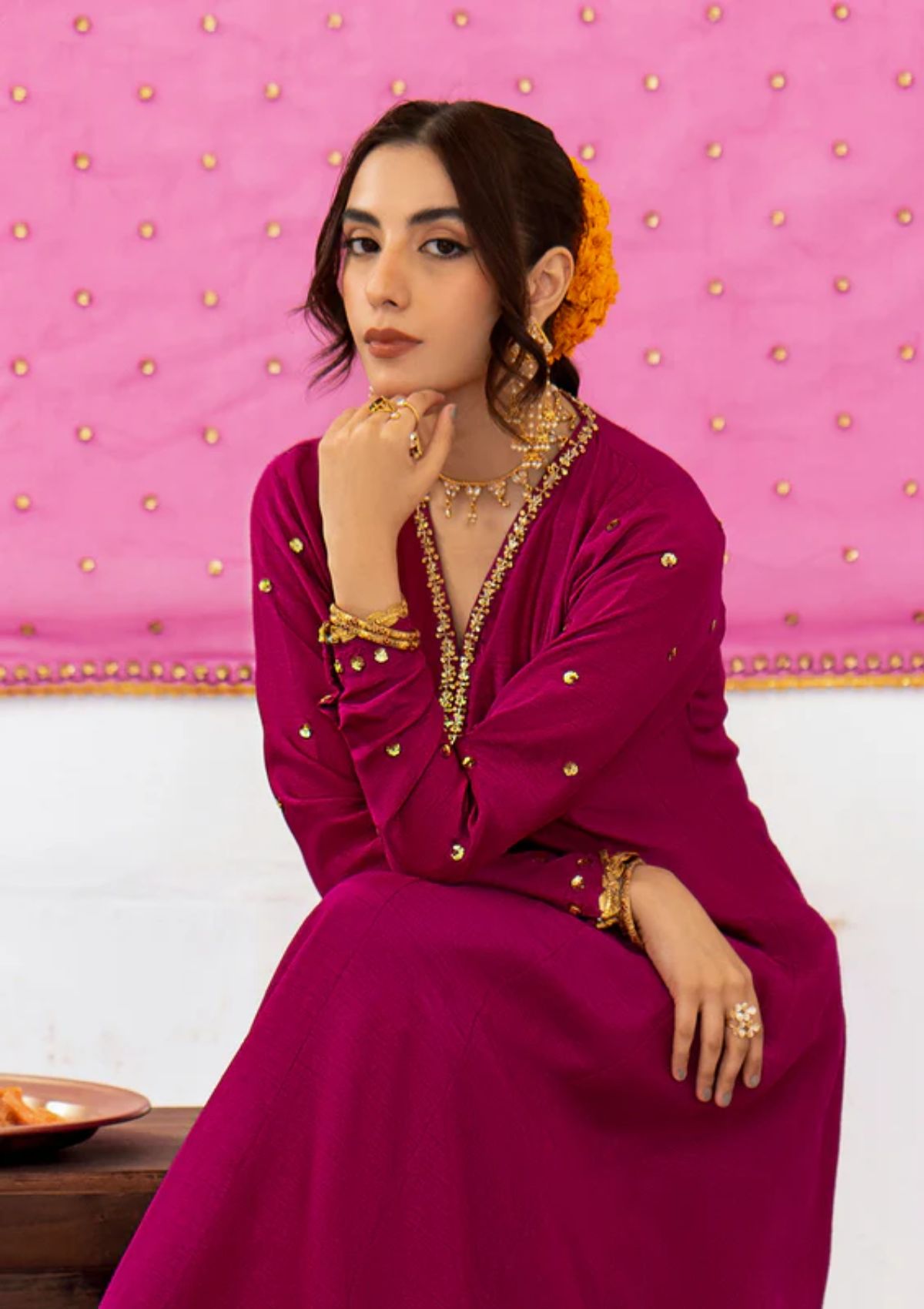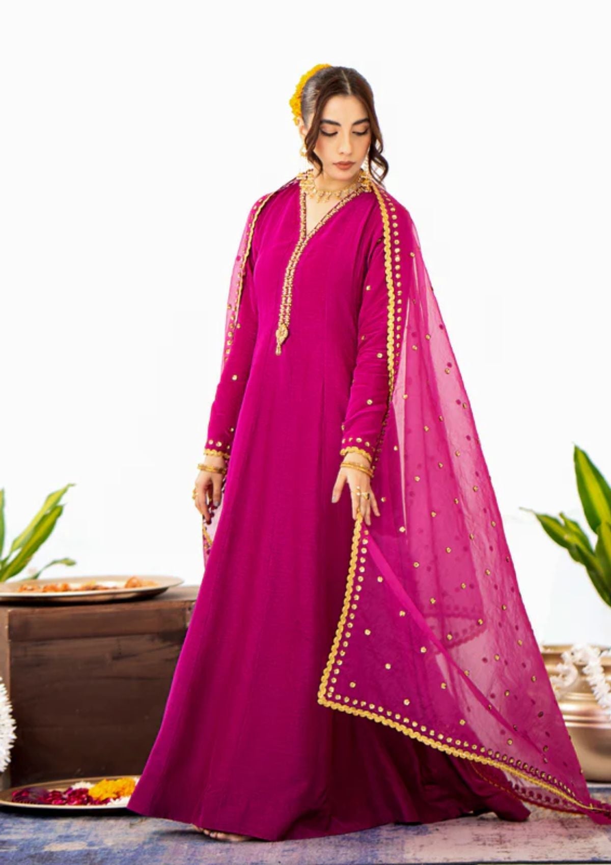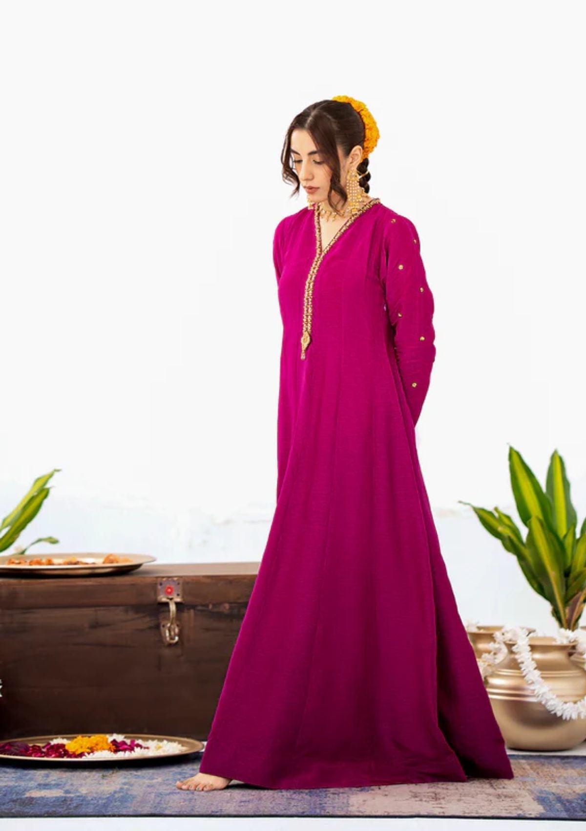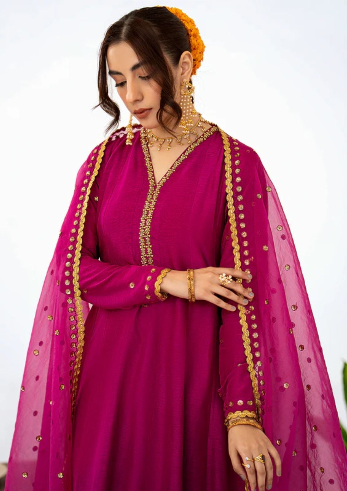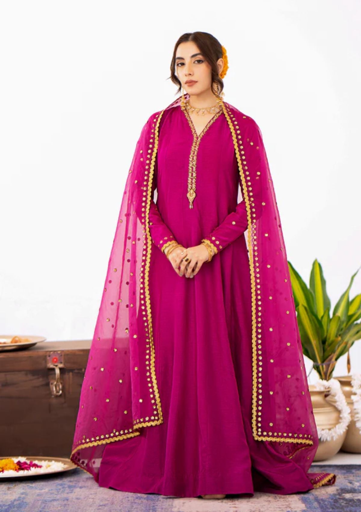 - Daneen - our exquisite magenta silk ensemble. Crafted from Korean silk, this ensemble features intricate adda work neckline and embroidered spray on the sleeves, exuding elegance. Complete your look with the flowy organza dupatta adorned with embroidered sequin spray and tilla lace finish.