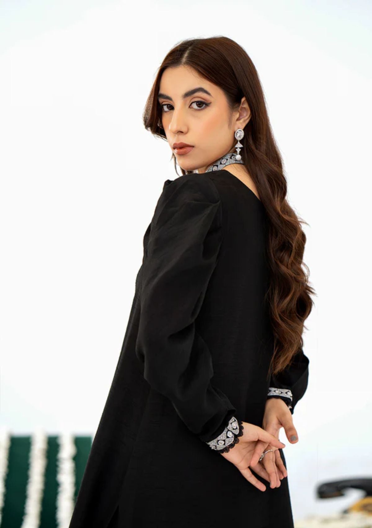 - Luxuriate in our "Zara" ensemble: a sleek black silk duo featuring a long shirt with embroidered and hand-embellished neckline finished with lace-accented sleeves, paired with pencil pants. Elevate your look with an organza dupatta featuring embroidered scallopfinishes.