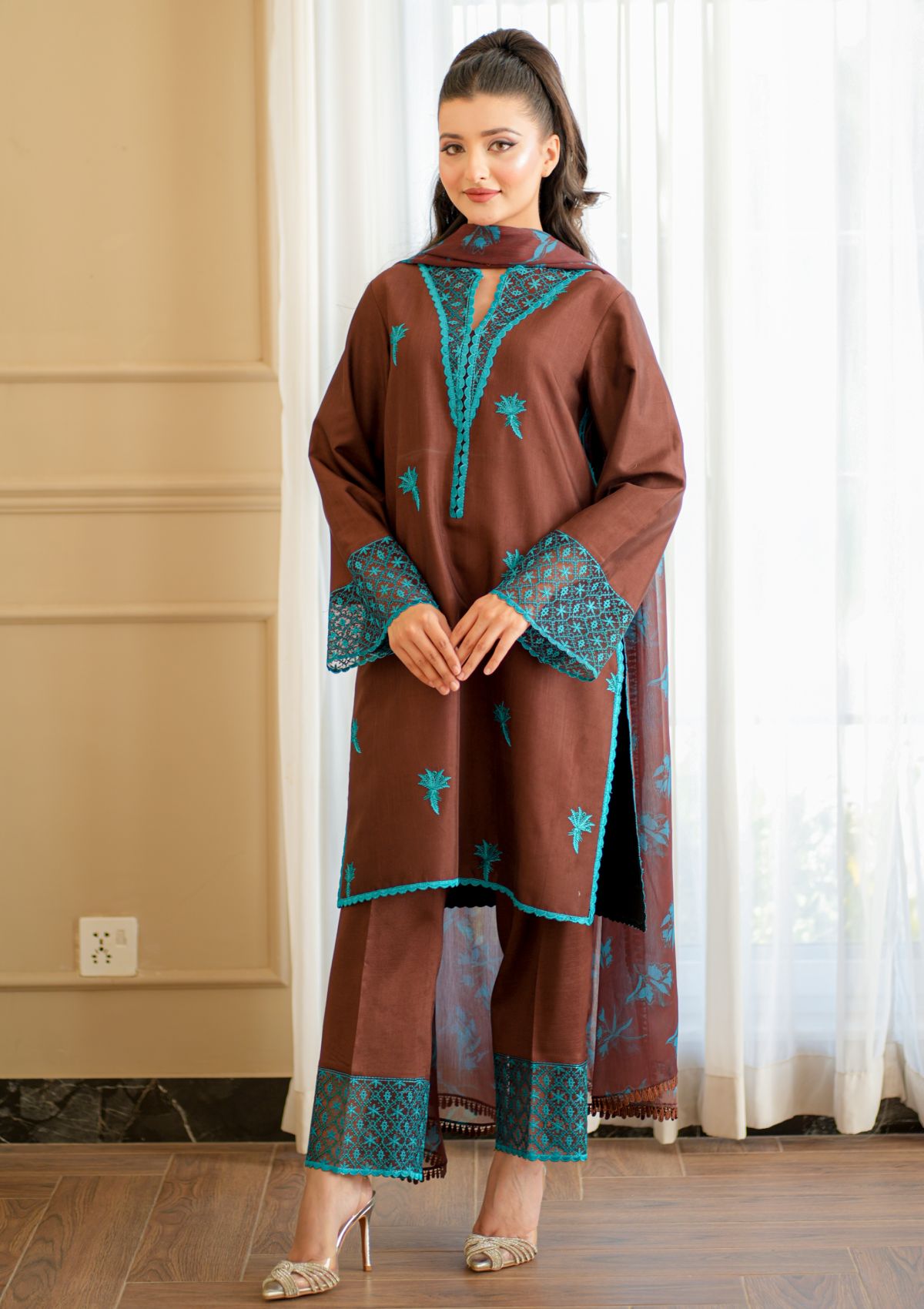 This brown 3-piece PK silk dress combines traditional elegance with modern flair. The intricately embroidered shirt and trousers create a sophisticated silhouette, while the printed chiffon dupatta adds a contemporary touch with its vibrant design. Ideal for casual occasions, this ensemble offers both luxury and comfort, making it a perfect choice for those who appreciate refined style.