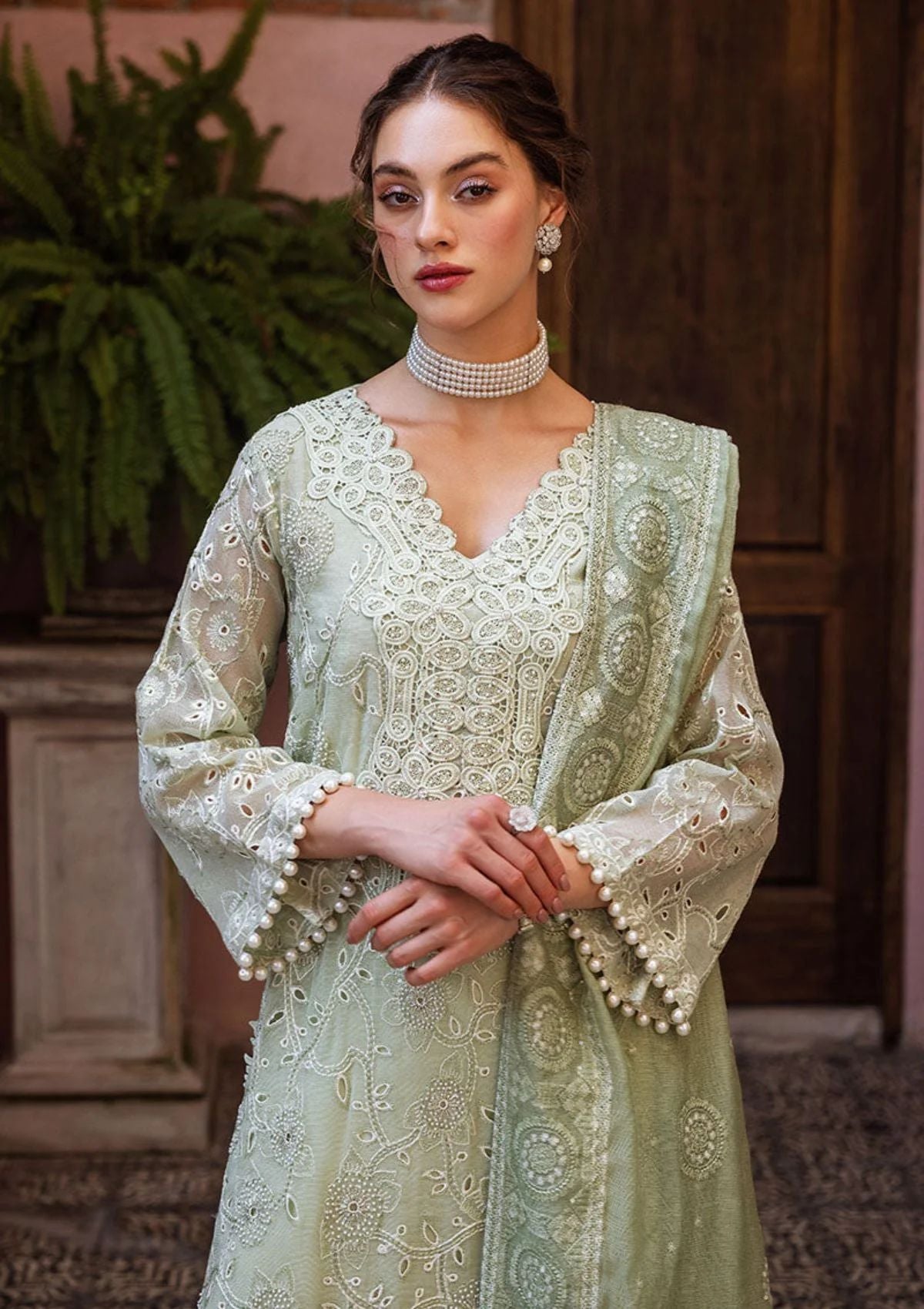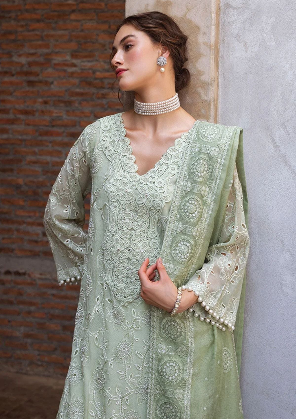 Dhara, a luxurious ensemble featuring a chikankari embroidered shirt adorned with a milky lace and pearl accents. The look is complete with a dupatta, featuring chikankari embroidery, light sequins, and pearl tassels thus adding a touch of elegance. This is a 3 pc outfit.