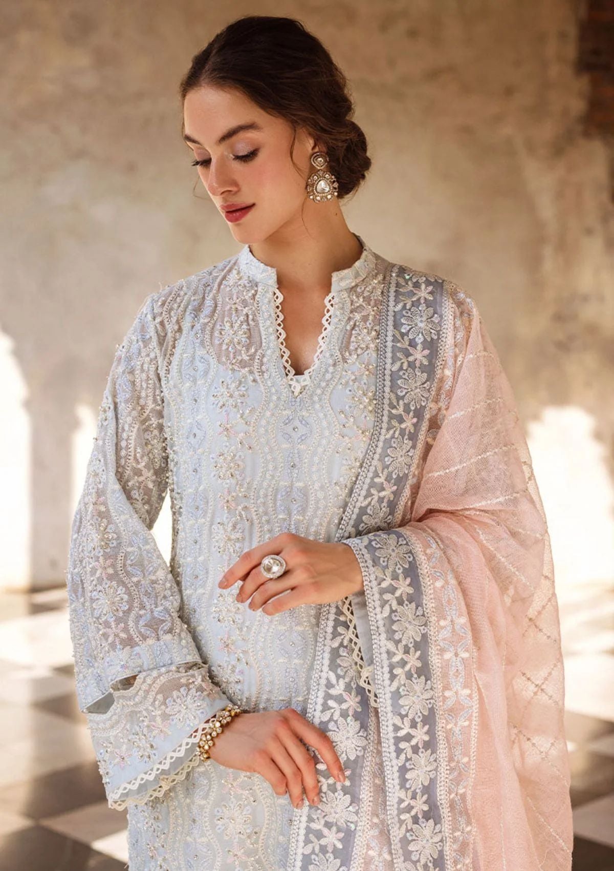 - Kiana features a khaadi cotton net, chikankari embroidered shirt adorned with light sequins, pearl embellishments, and crystals. The raw silk shalwar adds a touch of luxury, while the milky lace on the neckline and sleeves exudes elegance. The color-blocked dupatta, with chikankari borders on all four sides and handmade fabric hangings, completes this stunning look. This is a 3 pc outfit.