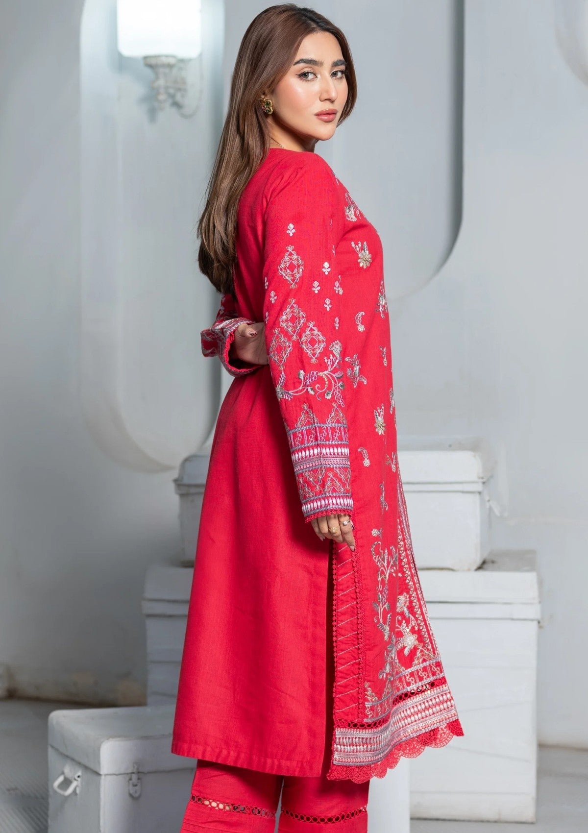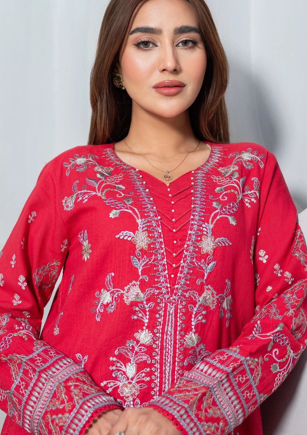 This is a classic Red Khaddar fabric dress that provides a canvas for multicolored embroidery to shine through in the form of delicate artwork. This dress is perfect for special occasions, with its heavily defined thread work.