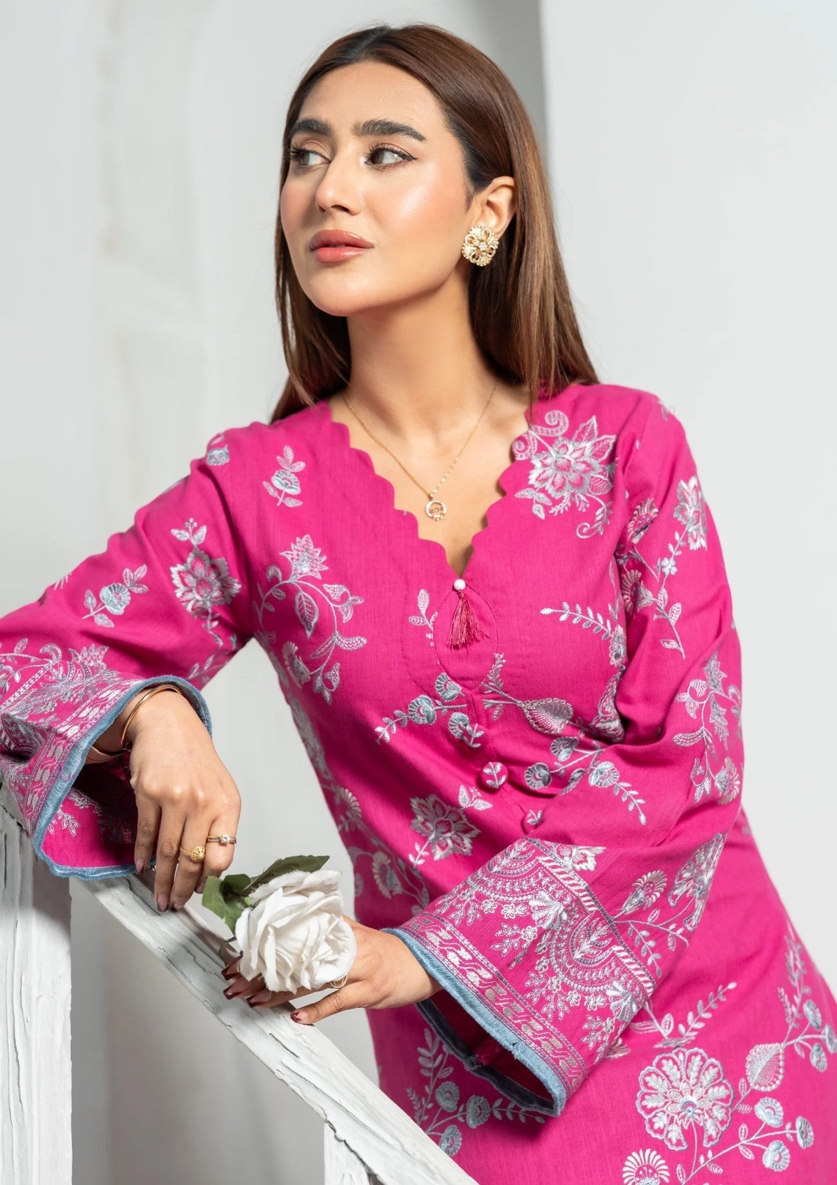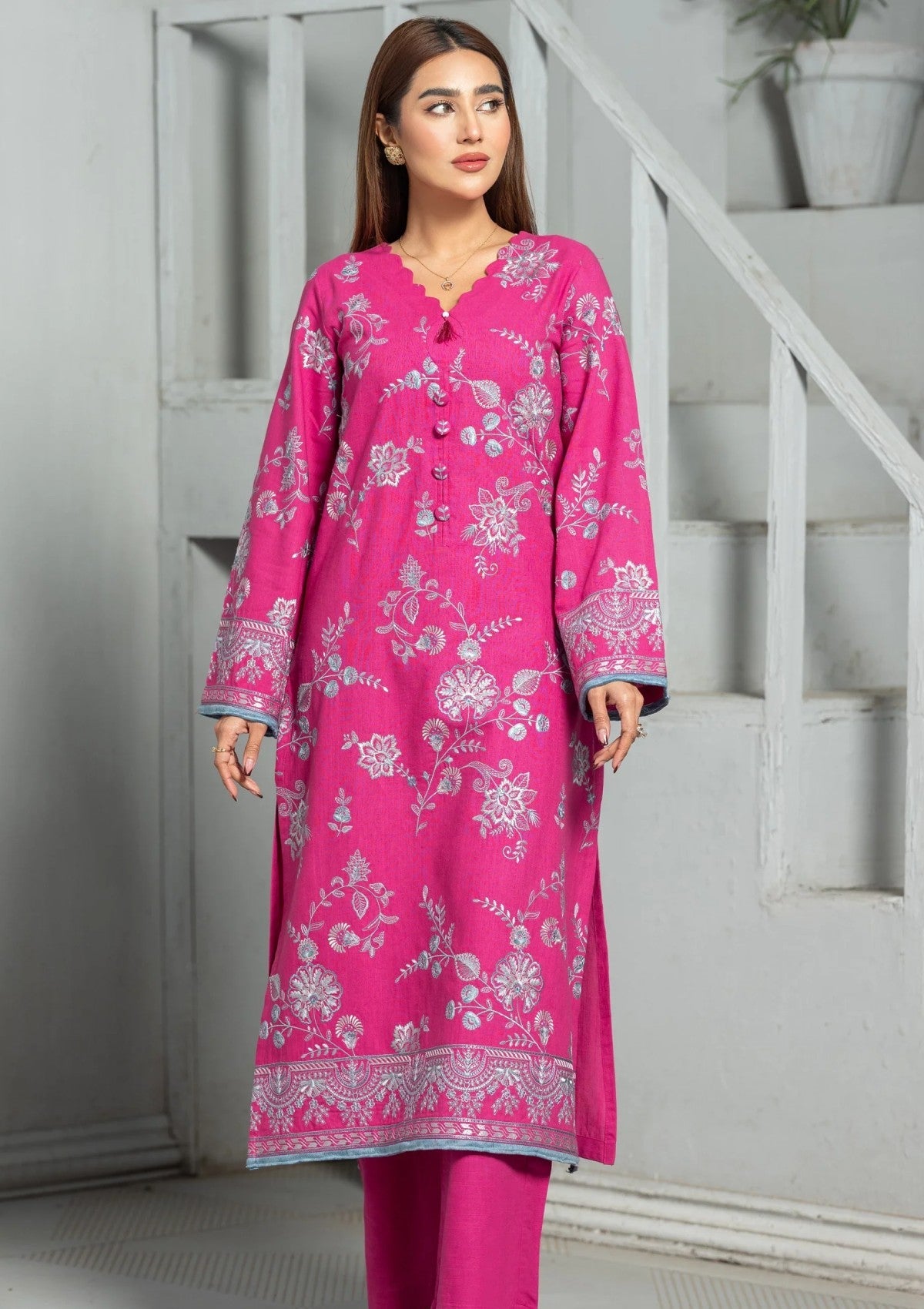 This is a classic Khaddar fabric dress that provides a canvas for multicolored embroidery to shine through in the form of delicate artwork.