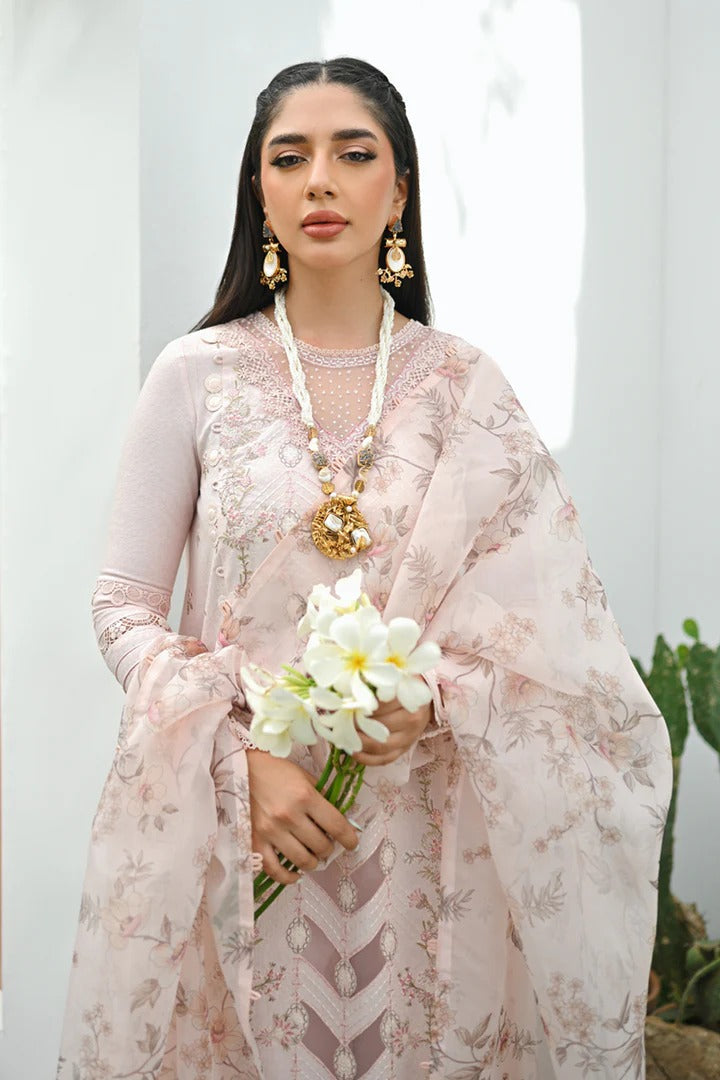 Cilia is summer perfection in pink. The jacquard-weaved shirt and delicate organza dupatta offer cool, airy comfort for the hottest days while intricate details keep you feeling put together. The cotton trousers finish the feminine, summery ensemble!