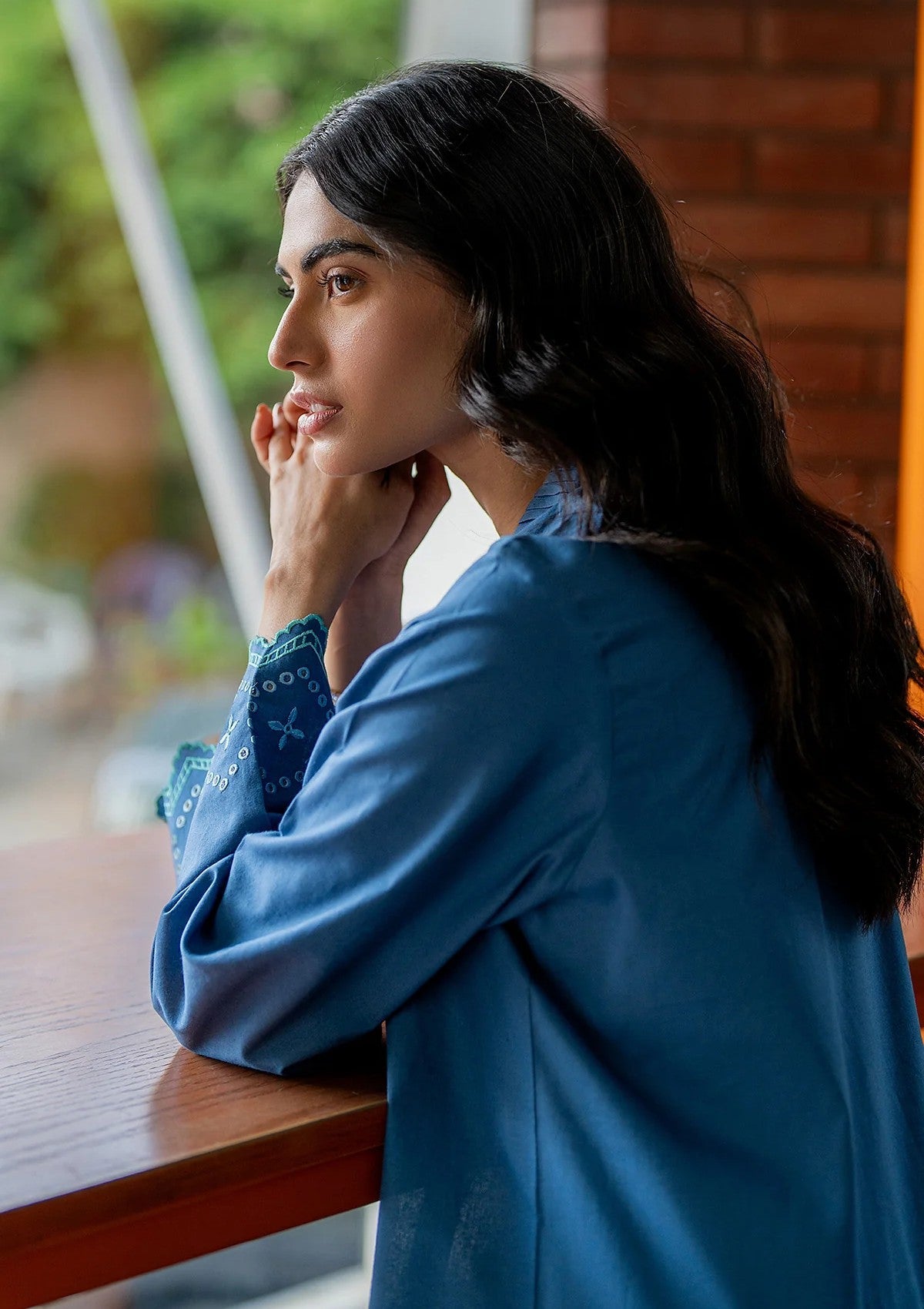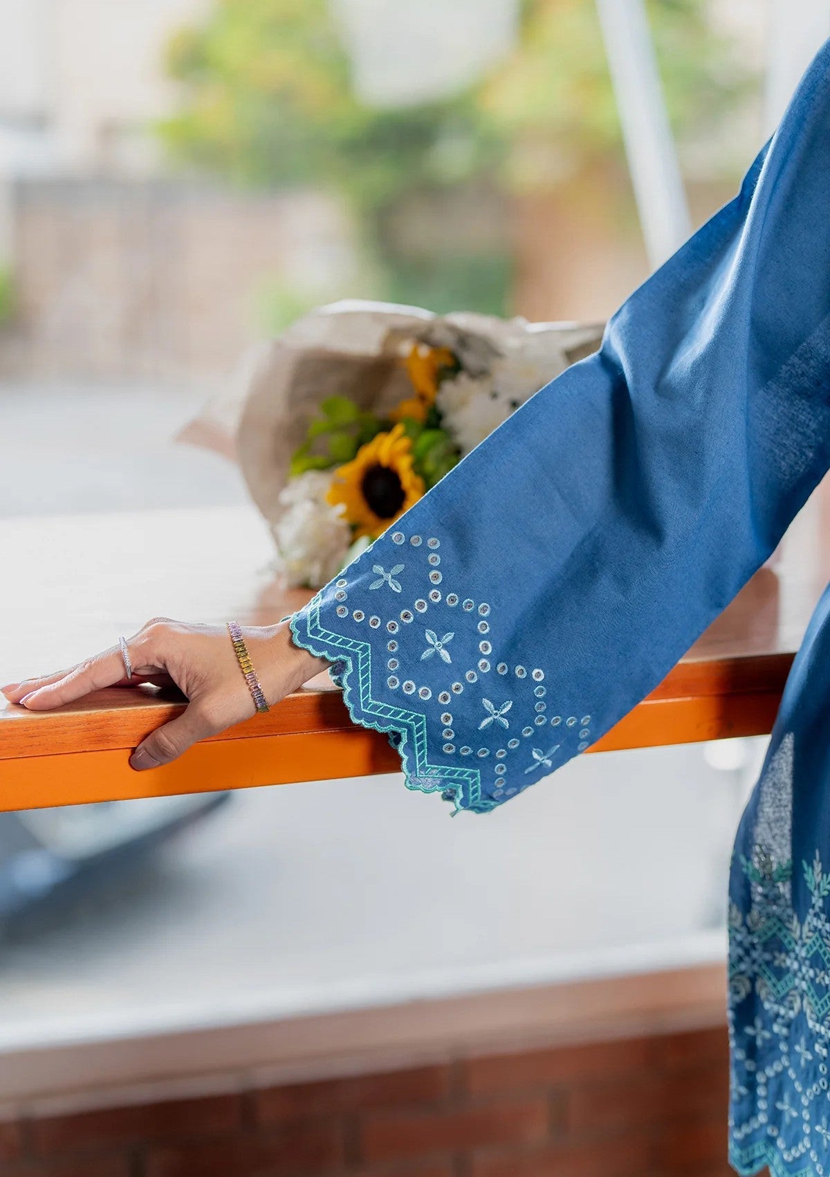 - This blue co-ord set features floral embroidery on the border, pintex details on the neckline, paired with straight pants.
