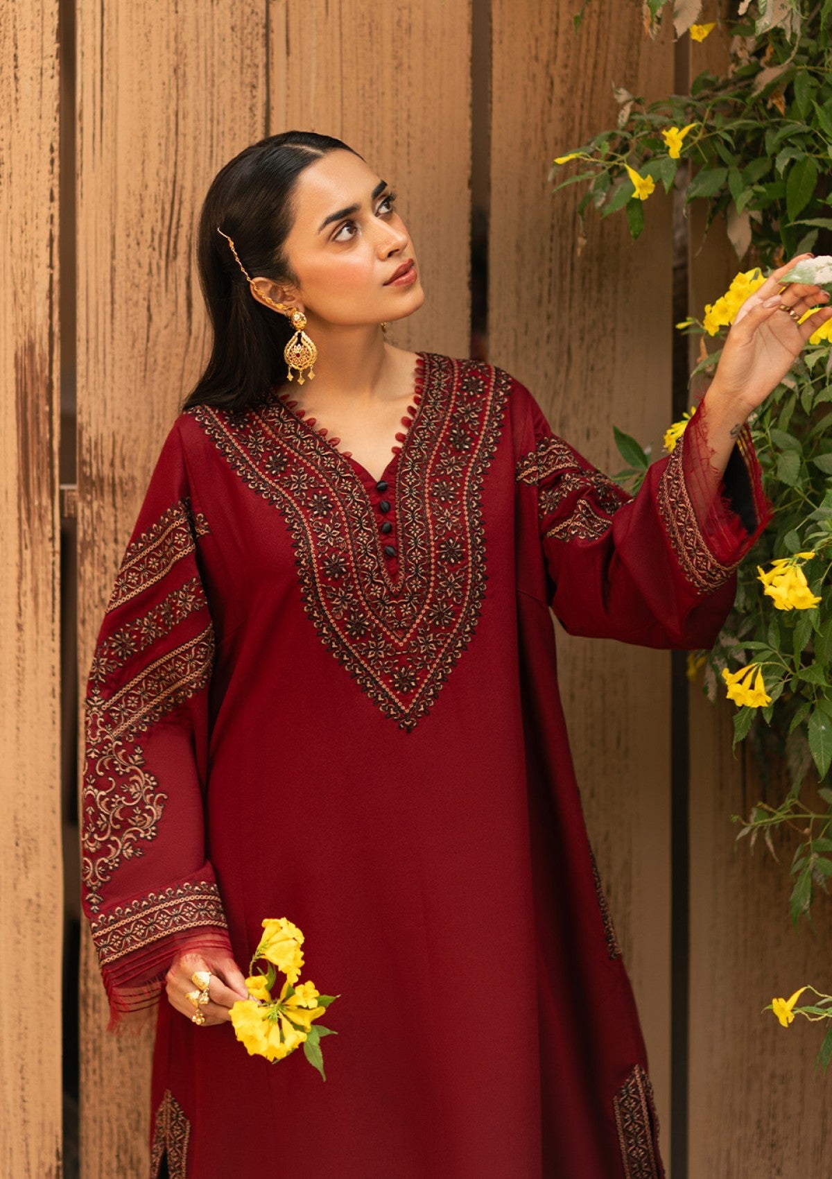With the arrivalof autumn,'Nazneen' beautifully captures the season's charm on a deep scarlet canvas, delicately adorned with Kashmiri Meena kari in soothing shades of warm rust, black and scarlet. The refined detailing along the neckline and borders reflects true craftsmanship, paired with a rosy garnetdigitally printed wool pashmina shawl, featuring an etched border on the pallu, adds a touch of elegance. Each stitch in 'Nazneen' tells the story of autumn's enchantment-crisp mornings, vibrant leaves, and the fleeting beauty of the season. It's a perfect fusion of warmth and sophistication, embodying the timeless allure of fall's transition.