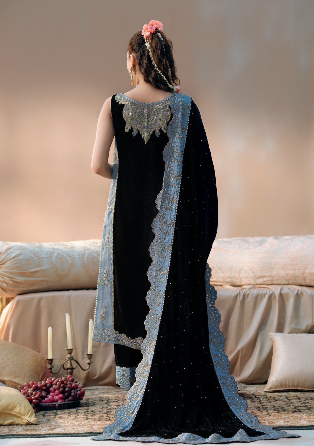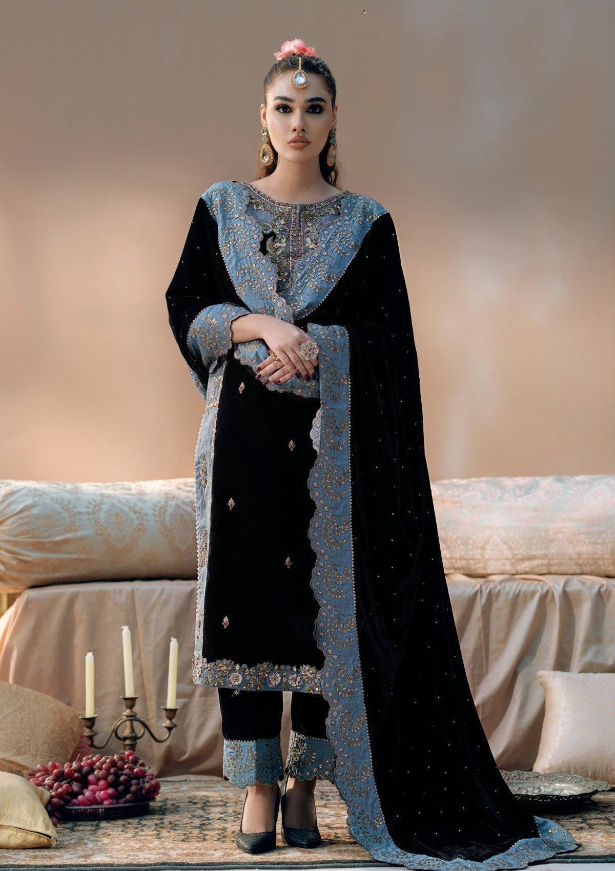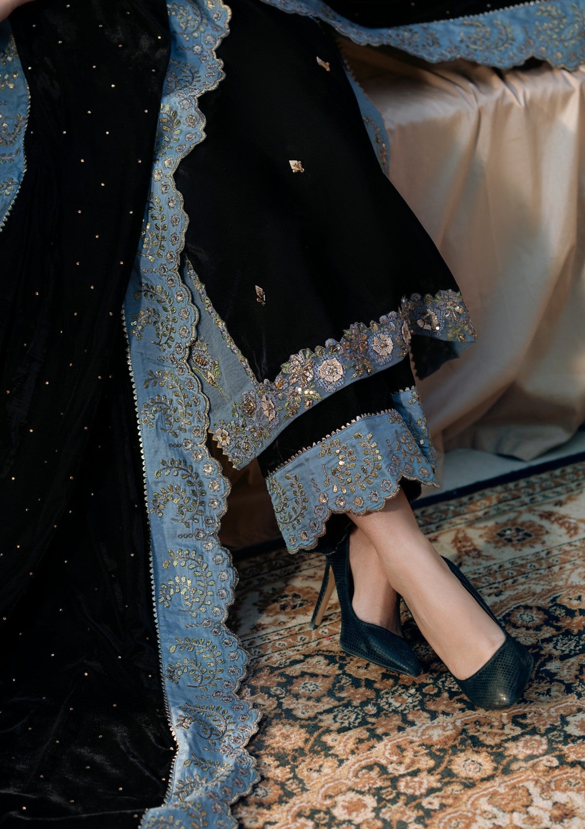 - This captivating dress in black and grey-blue is a stunning fusion of elegance and drama. Crafted with rich fabrics, the outfit features intricate embellishments that shimmer subtly across the bodice and sleeves, adding depth and sophistication. The black base is beautifully contrasted by soft grey-blue accents, creating a modern, refined palette.
