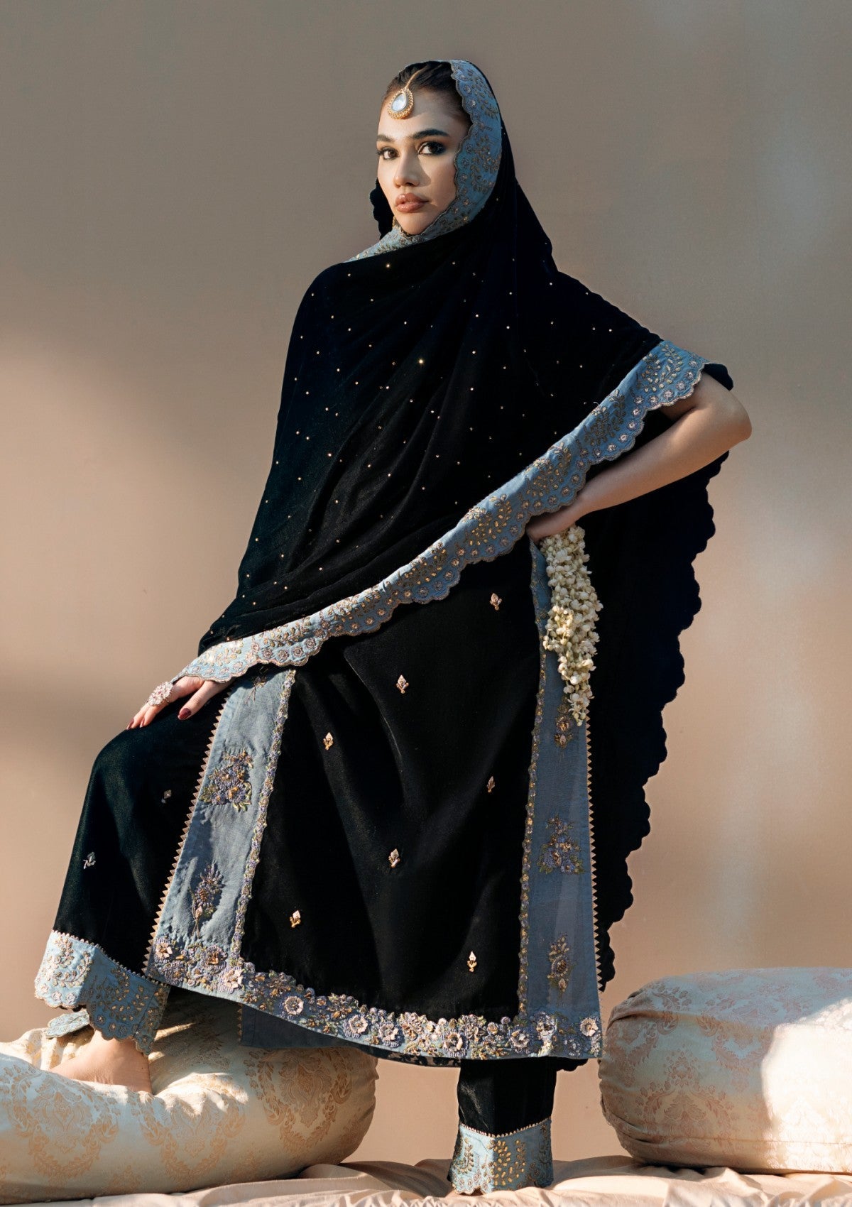 the highlight of the ensemble is the luxurious pk silk dupatta, adorned with heavily embellished borders. Intricate threadwork, sequins, along the edges give it a regal finish, perfect for turning heads at weddings, festive gatherings, or evening events. This ensemble effortlessly blends traditional craftsmanship with contemporary style, making it a standout choice for any special occasion.
