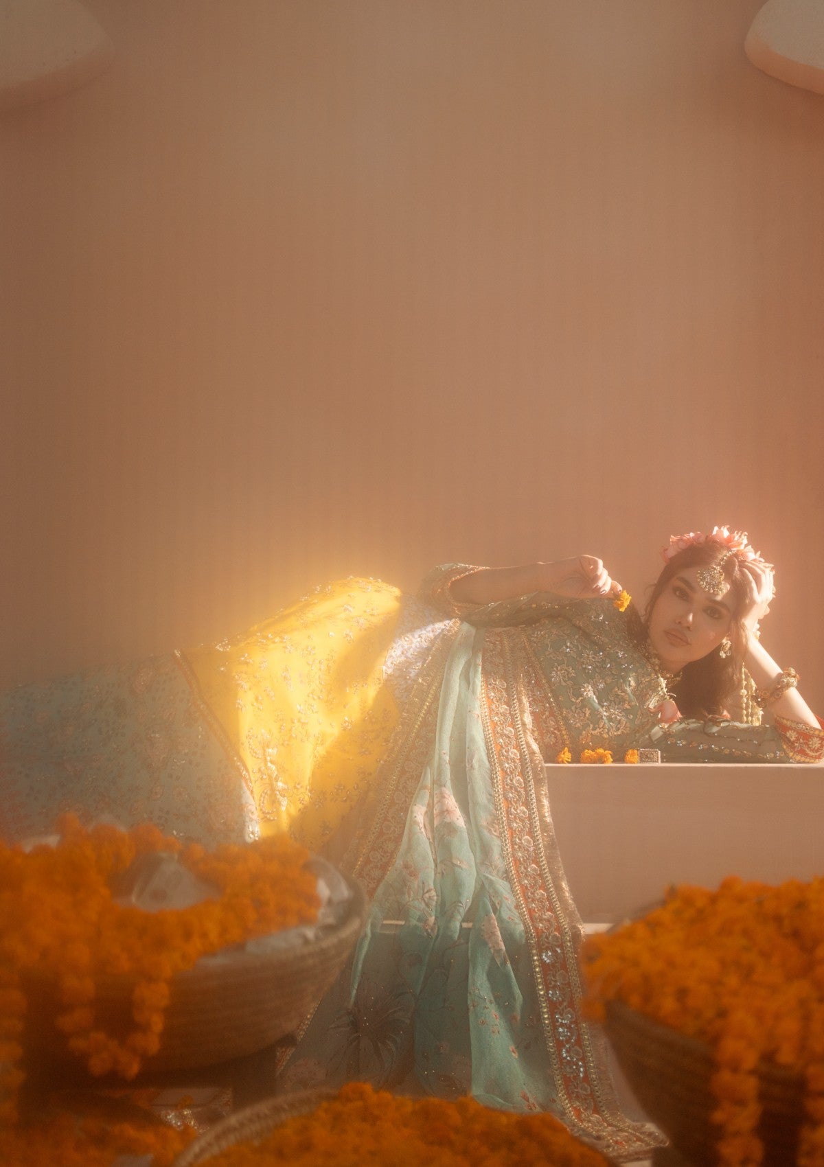 - Radiate elegance and festive charm in ourSea Green, Yellow, and Orange Embellished Lehenga, designed to make a statement at any celebration. The lehenga features a vibrant mix of colors âÃÂàrichSea Green, bright yellow, and warm orange âÃÂàeach thoughtfully blended to create a striking, joyful effect. Adorned with intricate embellishments including sequins, beads, and delicate embroidery, the lehenga shimmers with every movement, exuding a sophisticated yet playful allure.