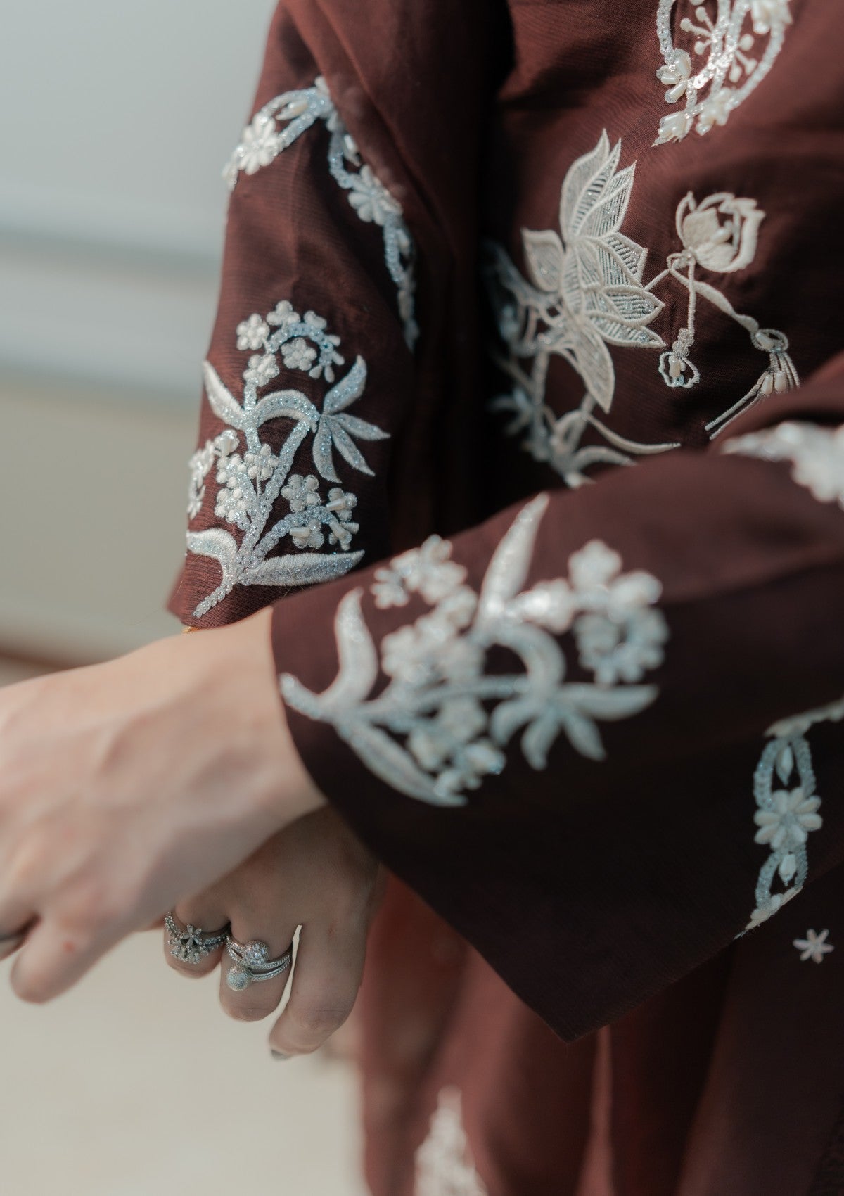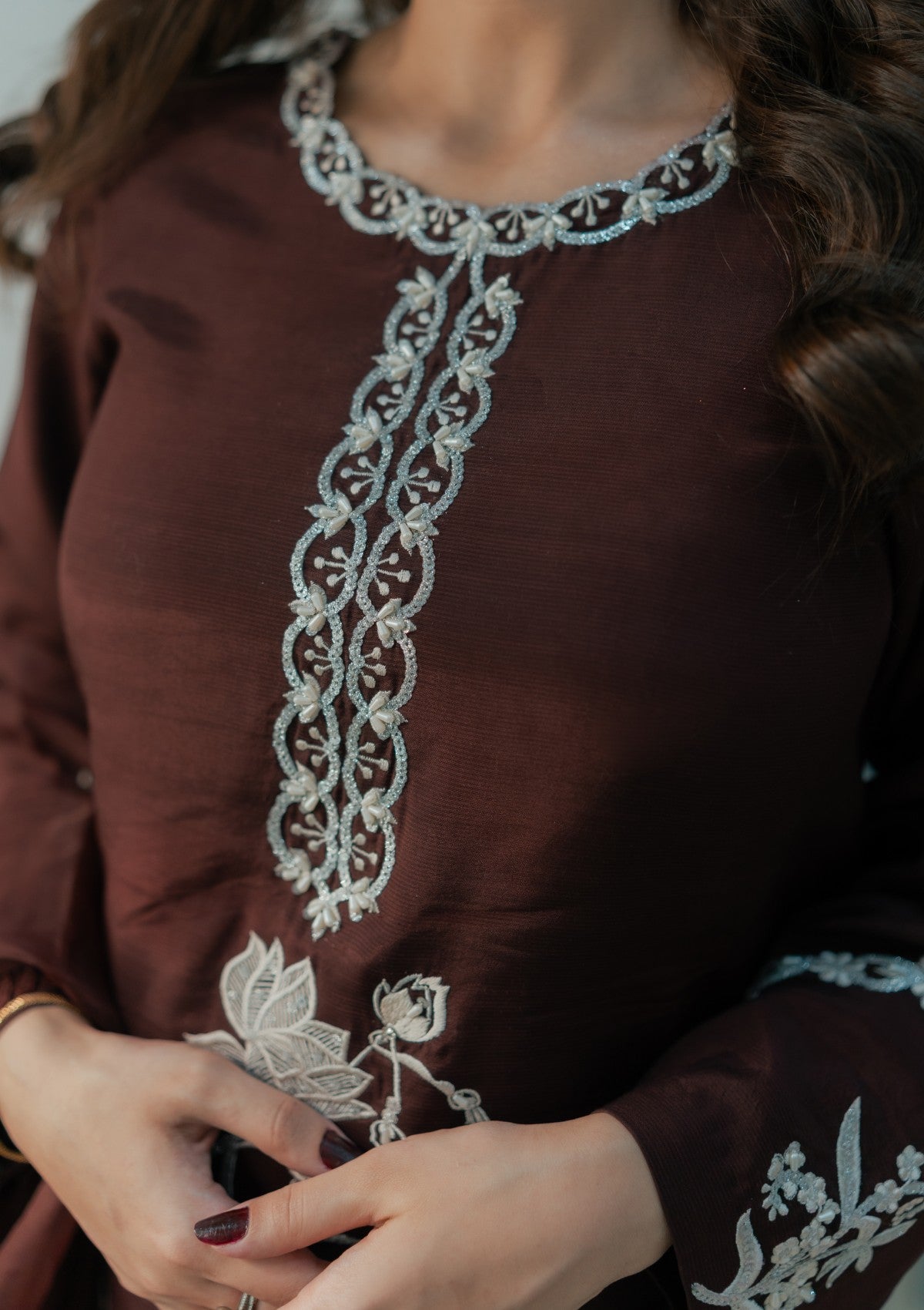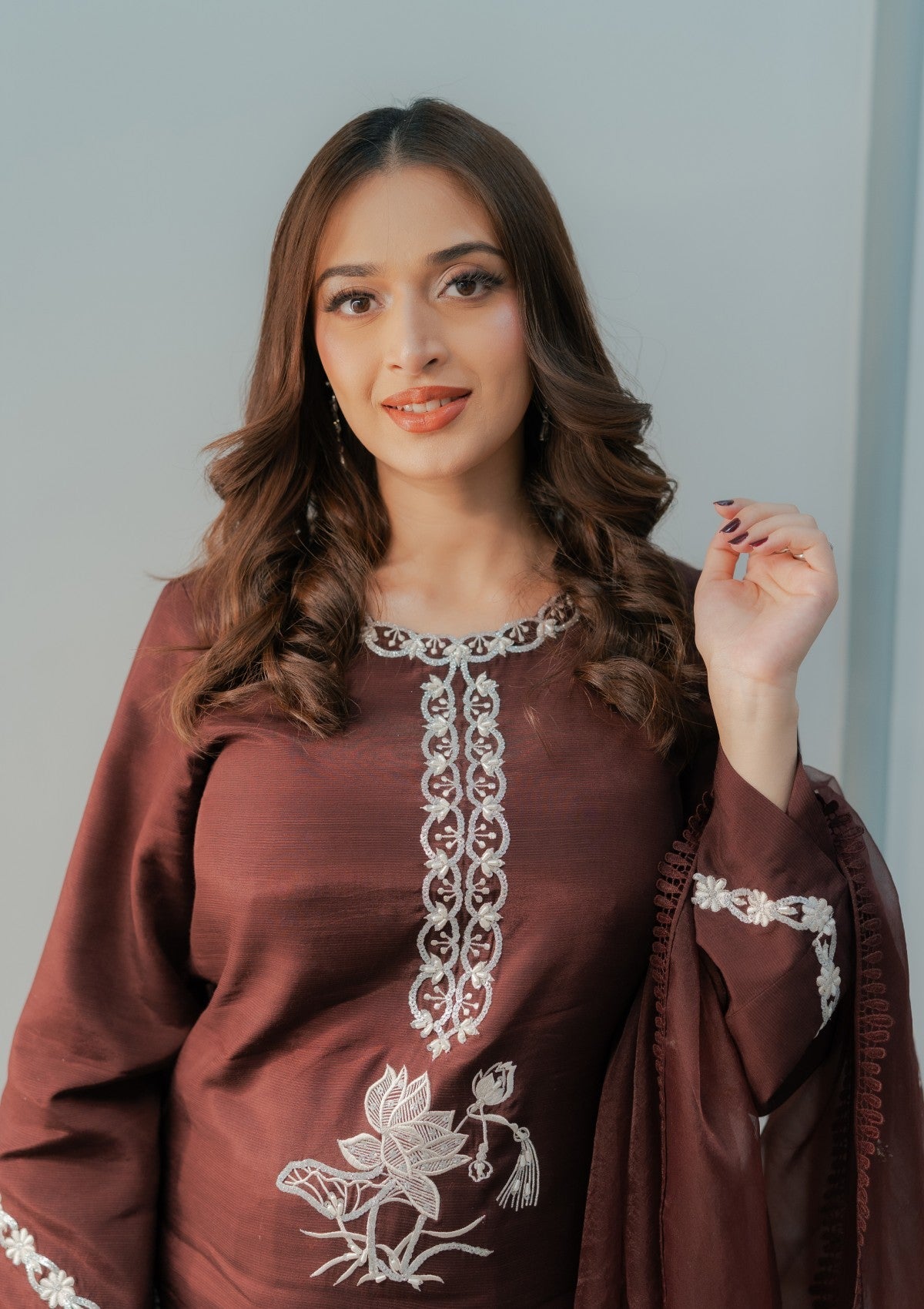 This 3-piece brown embroidered silk dress with an organza dupatta is the epitomeof timeless elegance. The deep brown silk shirt is beautifully adorned with intricateembroidery, adding richness and texture to the ensemble. Paired with matching silktrousers for a seamless silhouette, the outfit is completed with a delicate organzadupatta that brings a touch of lightness and sophistication. The contrast betweenthe lustrous silk and airy organza creates a perfect balance, making this outfit idealfor festive occasions, formal events, or evening gatherings. Classic yetcontemporary, it's a graceful choice for any refined wardrobe.