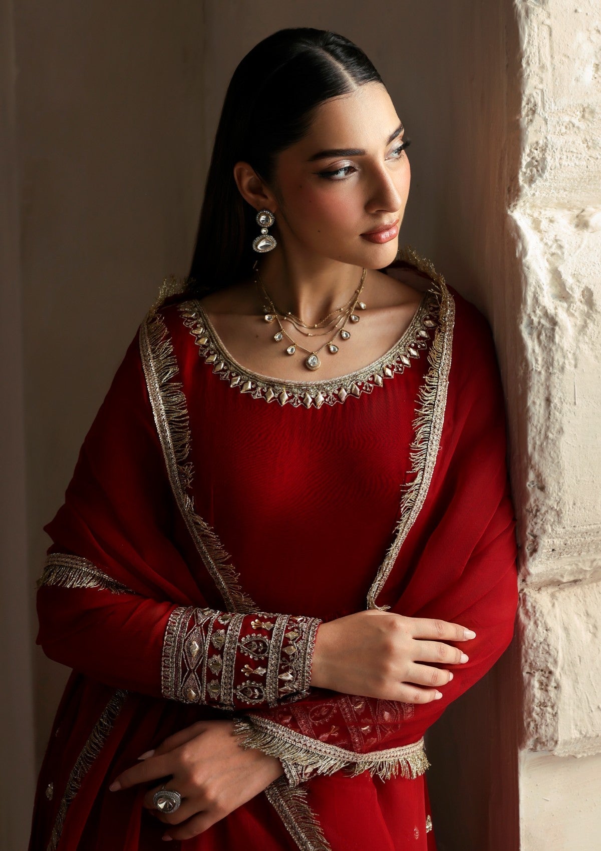 RICH RED ANARKALI ADORNED WITH DELICATE EMBROIDERY.SEQUINS. AND GOLD EMBELLISHMENTS. PAIRED WITH ASHEER DUPATTA FOR AN EFFORTLESSLY REGAL LOOK,