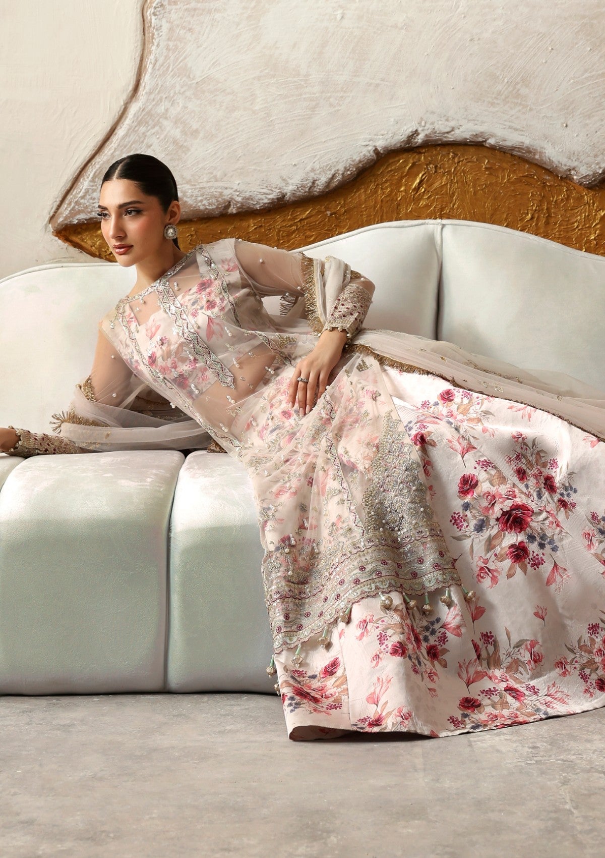 A GRACEFUL IVORY FLORAL HAND EMBELLISHED OUTFIT WITHINTRICATE SILVER AND PASTEL EMBROIDERY, PAIRED WITH ASOF FLORAL PRINTED FLARED LEHANGA. COMPLETED WITHA SHEER EMBELLISHED DUPATTA FOR AN ELEGANT FINISH.