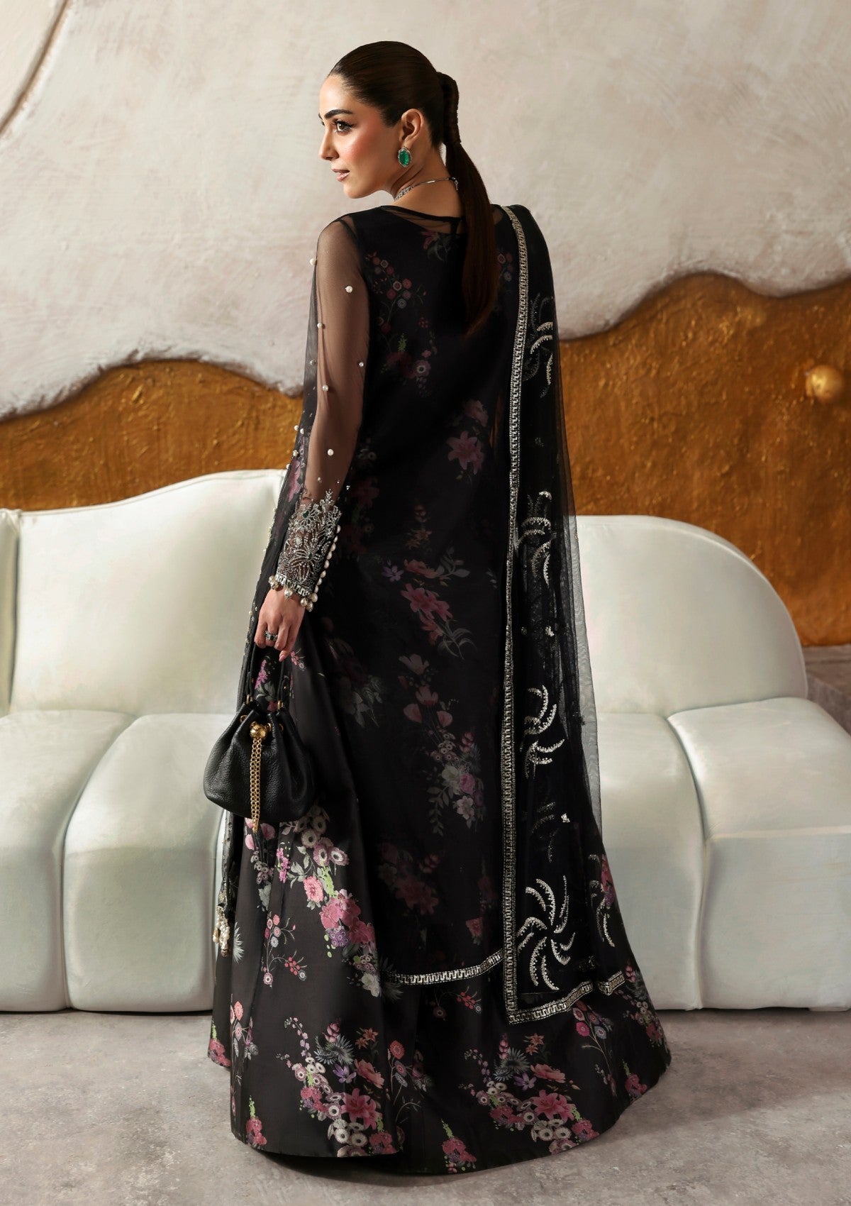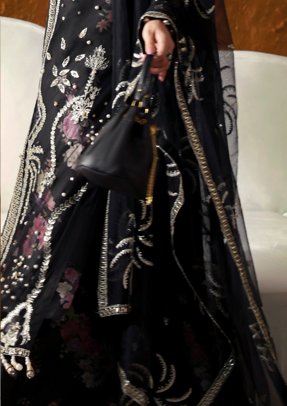 A STRIKING BLACK NET ENSEMBLE ADORNED WITH INTRICATESILVER EMBROIDERY AND HAND EMBELLISHED PAIRED WITHPRINTED FLORAL LEHANGA. THE LONG FLARED SILHOUETTEPAIRED WITH A MATCHING EMBELLISHED DUPATTA CREATESAN ELEGANT AND REGAL STATEMENT.