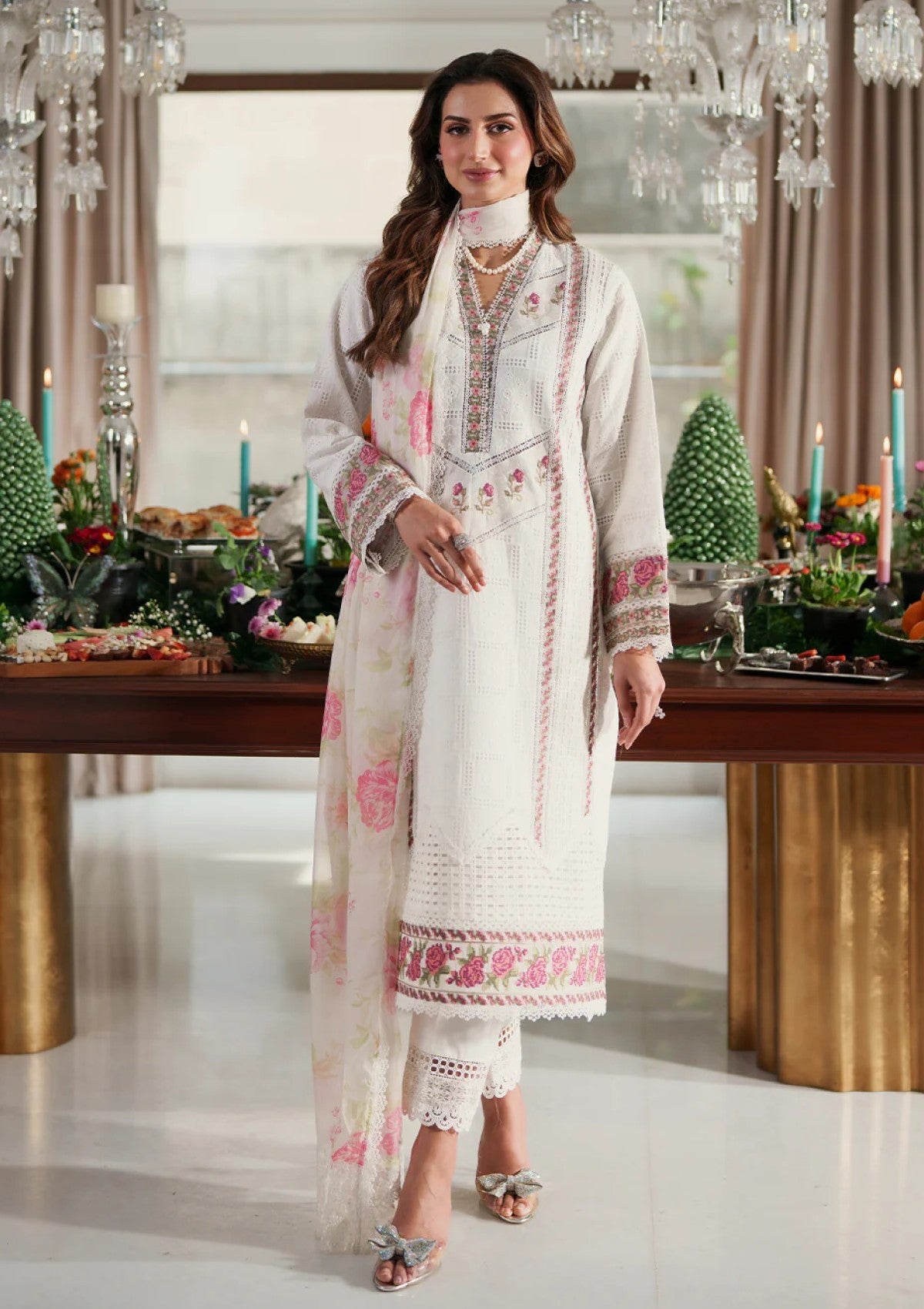 Add a touch of chic elegance to your wardrobe this season with this 'Clara' eyelet cotton tunic. Rendered in a beautiful hue of dove white, this ensemble is the ultimate luxe evening wear. The neck line of the shirt is thoughtfully enhanced with cross-stitch embroidered rosette borders enhanced with laces and hand embellished motifs. The hemline and sleeves are further adorned with beautiful embroidered cross-stitch borders. Pair this stunner with our signature pants with lace and embroidery inserts. To complete the look style it with digital printed dupatta finished with embroidered pallu and lace detailing.