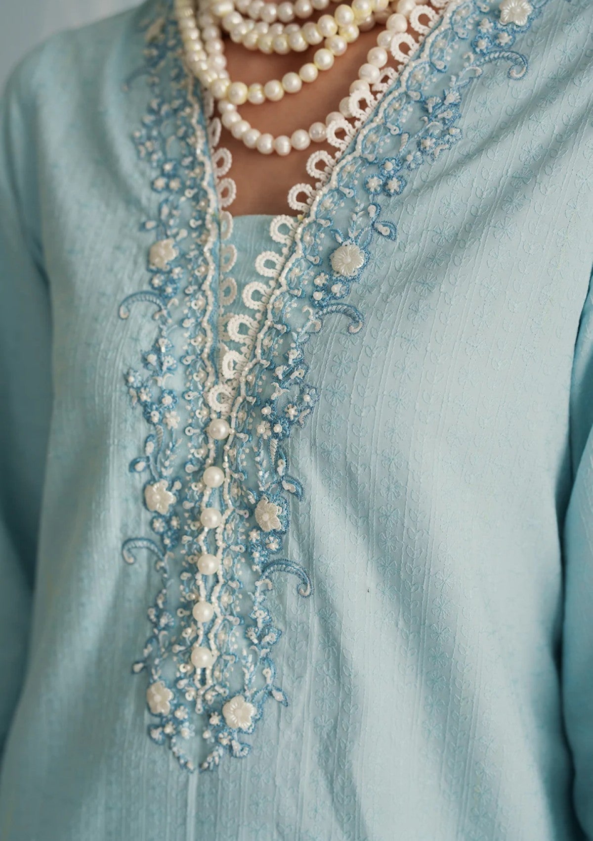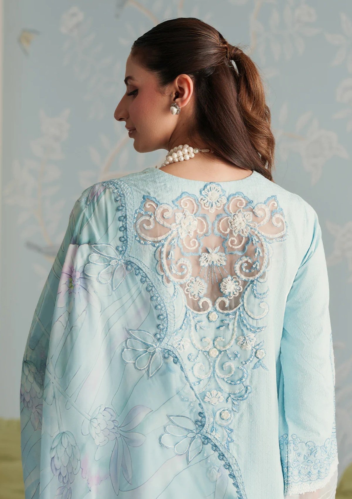 Introducing "ELYNA "- an ethereal masterpiece designed for the discerning fashionista. Draped in a sublime Maya blue canvas, this ensemble is adorned with delicate floral embroideries in tonal shades. The shirt's intricate floral schiffli detailing adds a mesmerizing touch, elevating the overall composition to a work of art. Can be paired with a breezy digital printed dupatta, exquisitely framed with dainty embroidered flora on all four sides, âÃÂÃÂELYNA' epitomizes effortless glamour. Perfect for summer soirÃÂées, this look captures the essence of understated elegance, making it a must-have for your seasonal wardrobe.