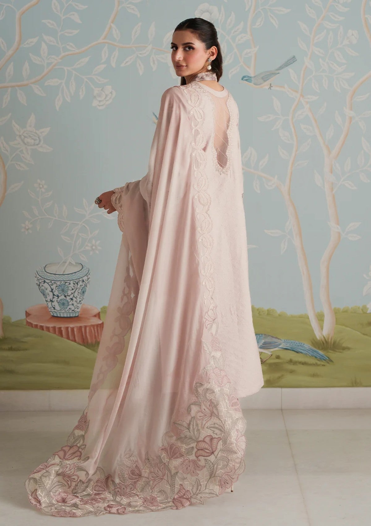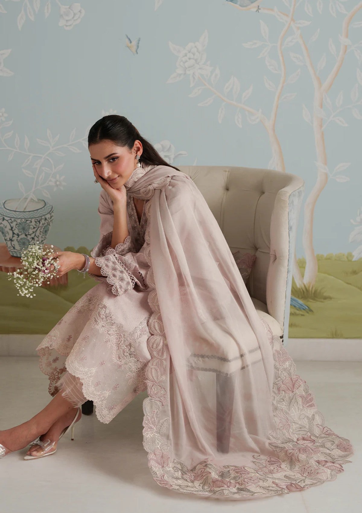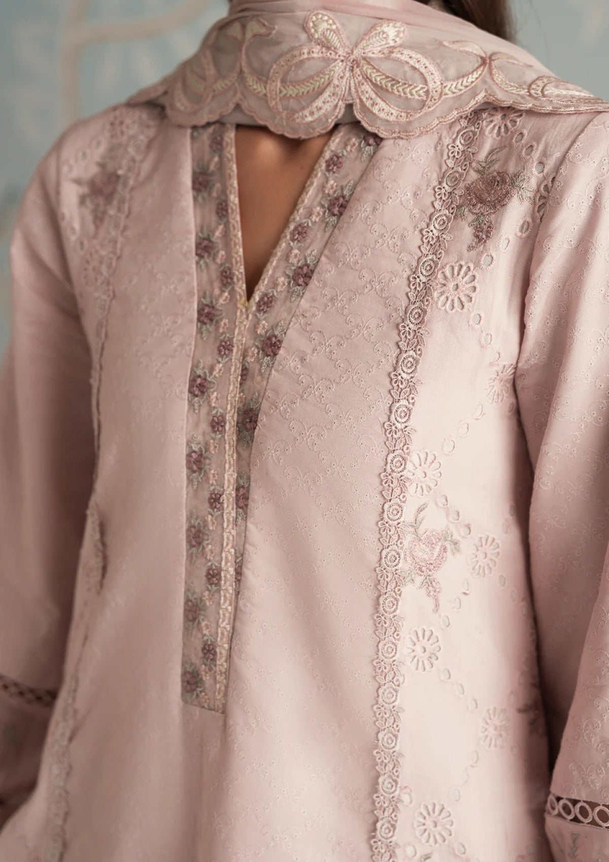 A classically elegant look 'AMBRE' features a beautifully adorned hemline and sleeves with intricate floral embroidery, cut from a beautiful shade of rose pink self-embroidered lawn, delicately adorned with eyelet panel decorated with hand embellished vintage floral rosettes. The neckline is enhanced with embroidery and delicate lace trimmings further embellished with hand crafted 3D organza flowers. The elegant tunic can be paired with cropped pants highlighted with lace trimmings. Complete the ensemble with a stunning dupatta adorned with an embroidered garland of floral embroidery, this design captures the essence of a vibrant and joyful summer celebration.