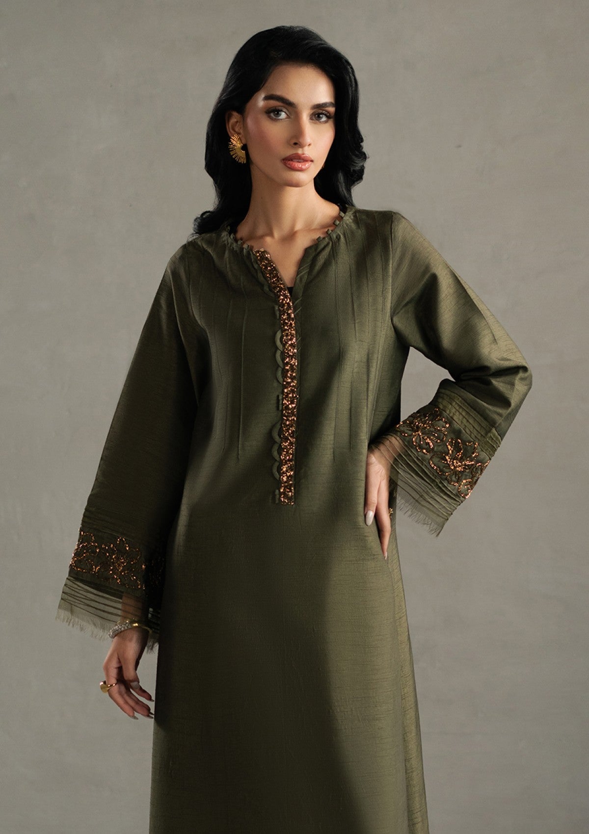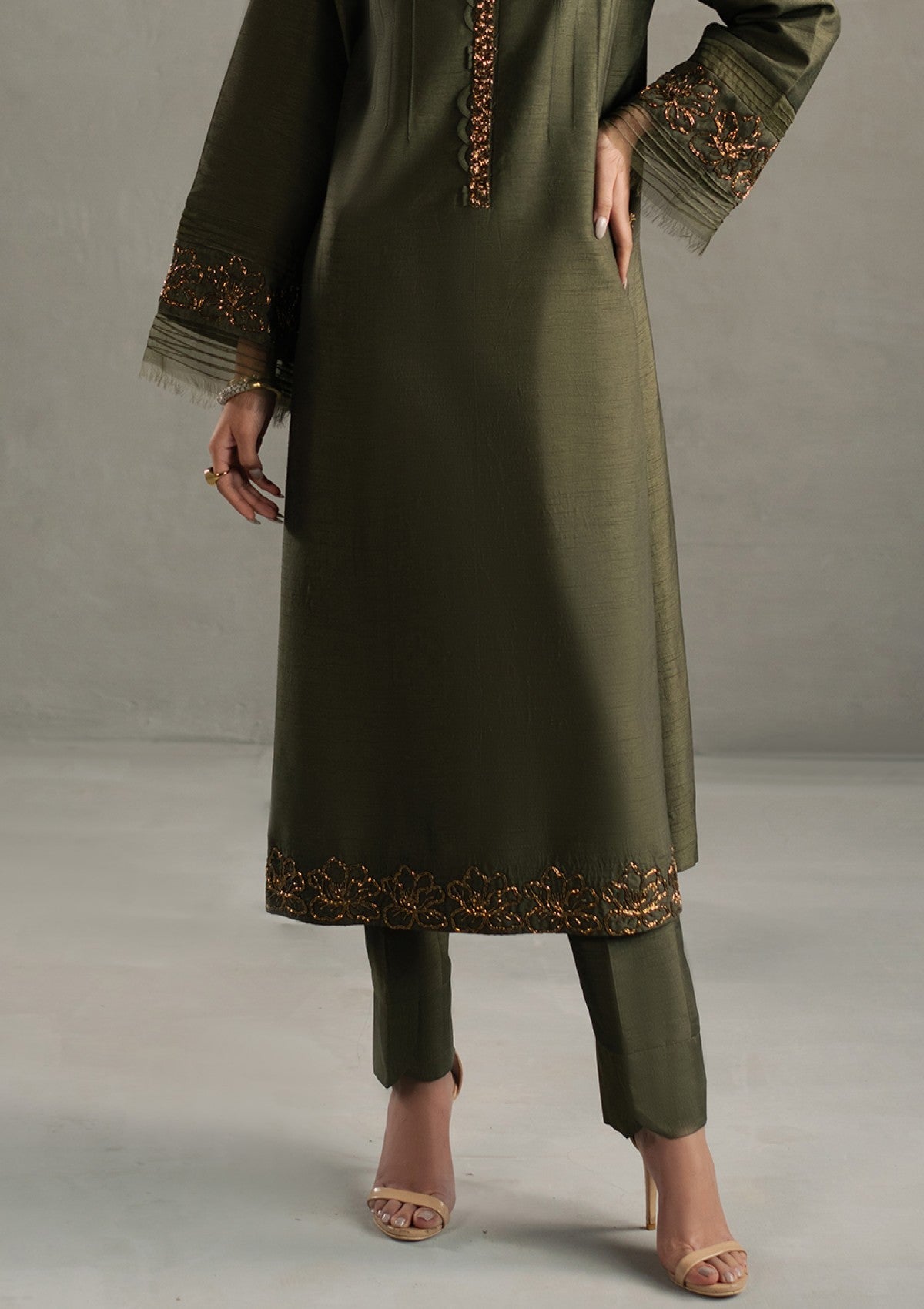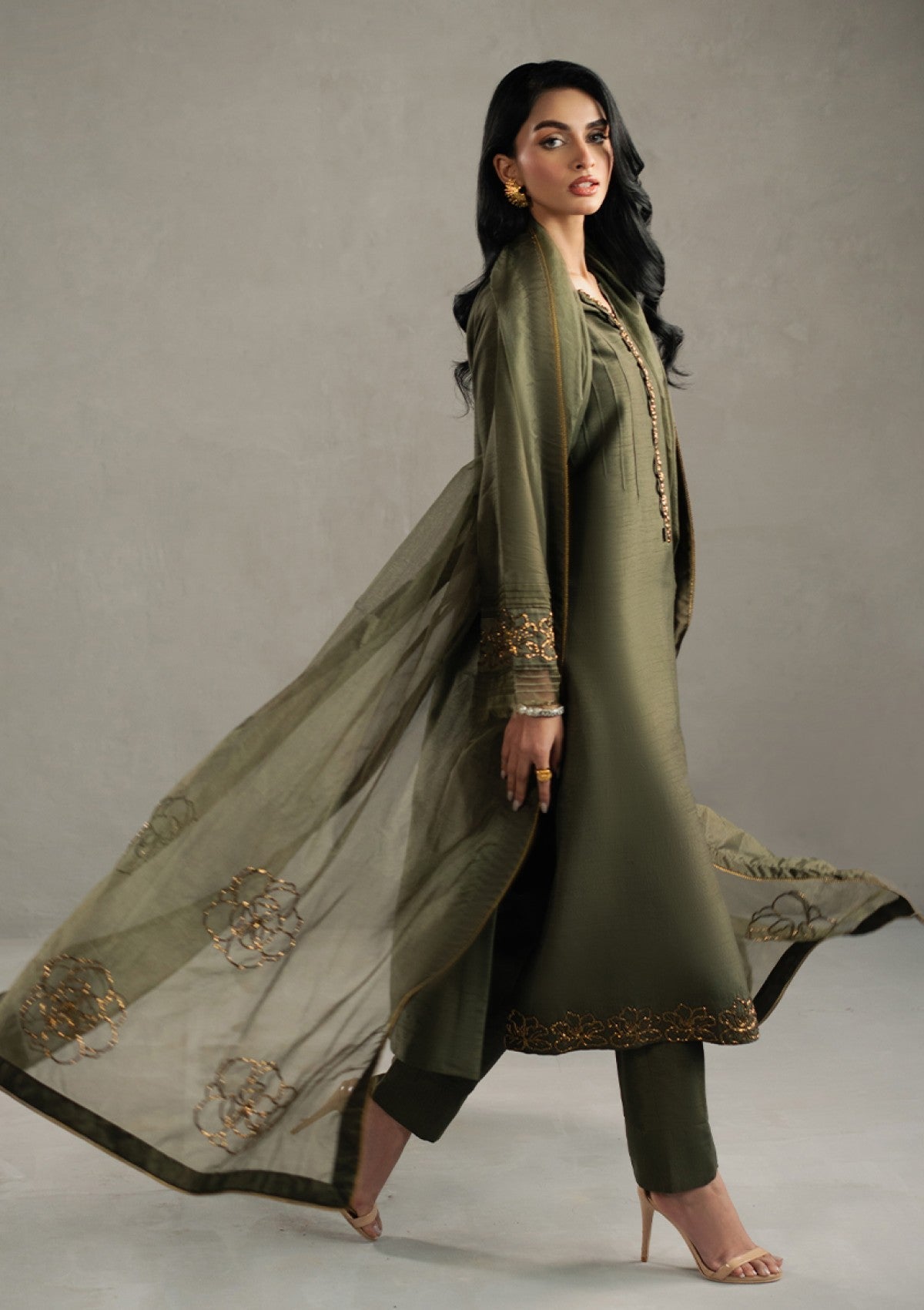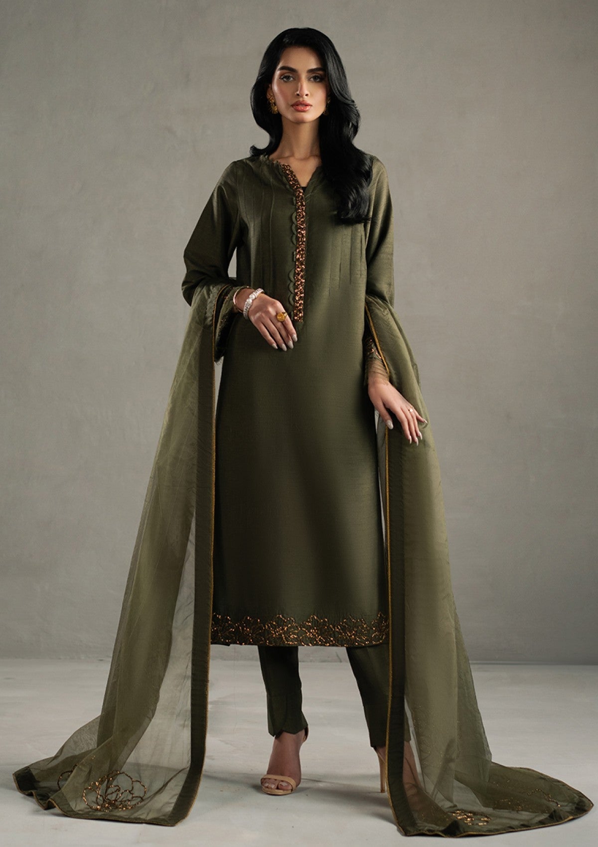 Immerse yourself in unparalleled opulence with ARIA a breathtaking masterpiece adorned in a symphony of radiant beads and intricately crafted cut Dana rosettes. This ensemble reveals a refined, elongated silhouette, with a shirt that is impeccably tailored to evoke an aura of regal grandeur. Paired with flawlessly sculpted tonal trousers, every meticulously curated detail of this silhouette speaks to an unmatched level of sophistication. A moss green organza dupatta lavishly detailed with hand-embellished intricacies, drapes effortlessly. 'ARIA" is not just an ensemble, but a statement of enduring elegance and exceptional luxury.