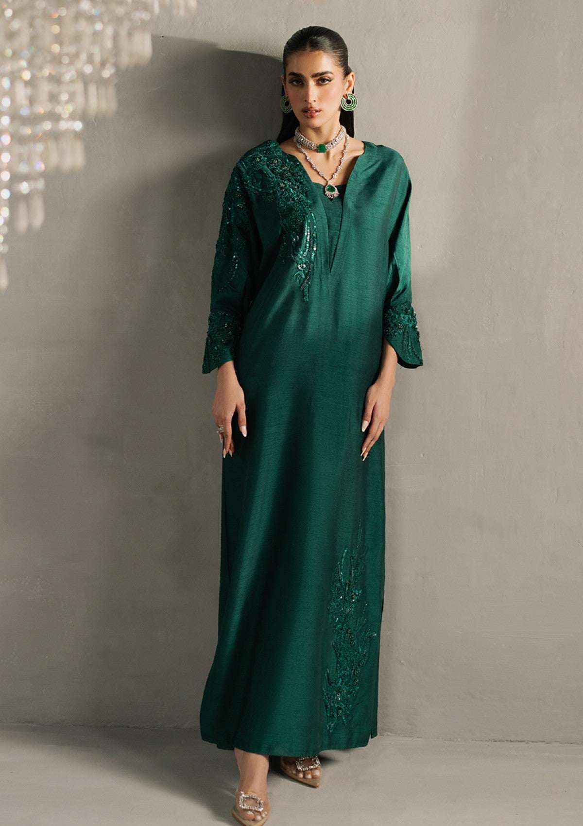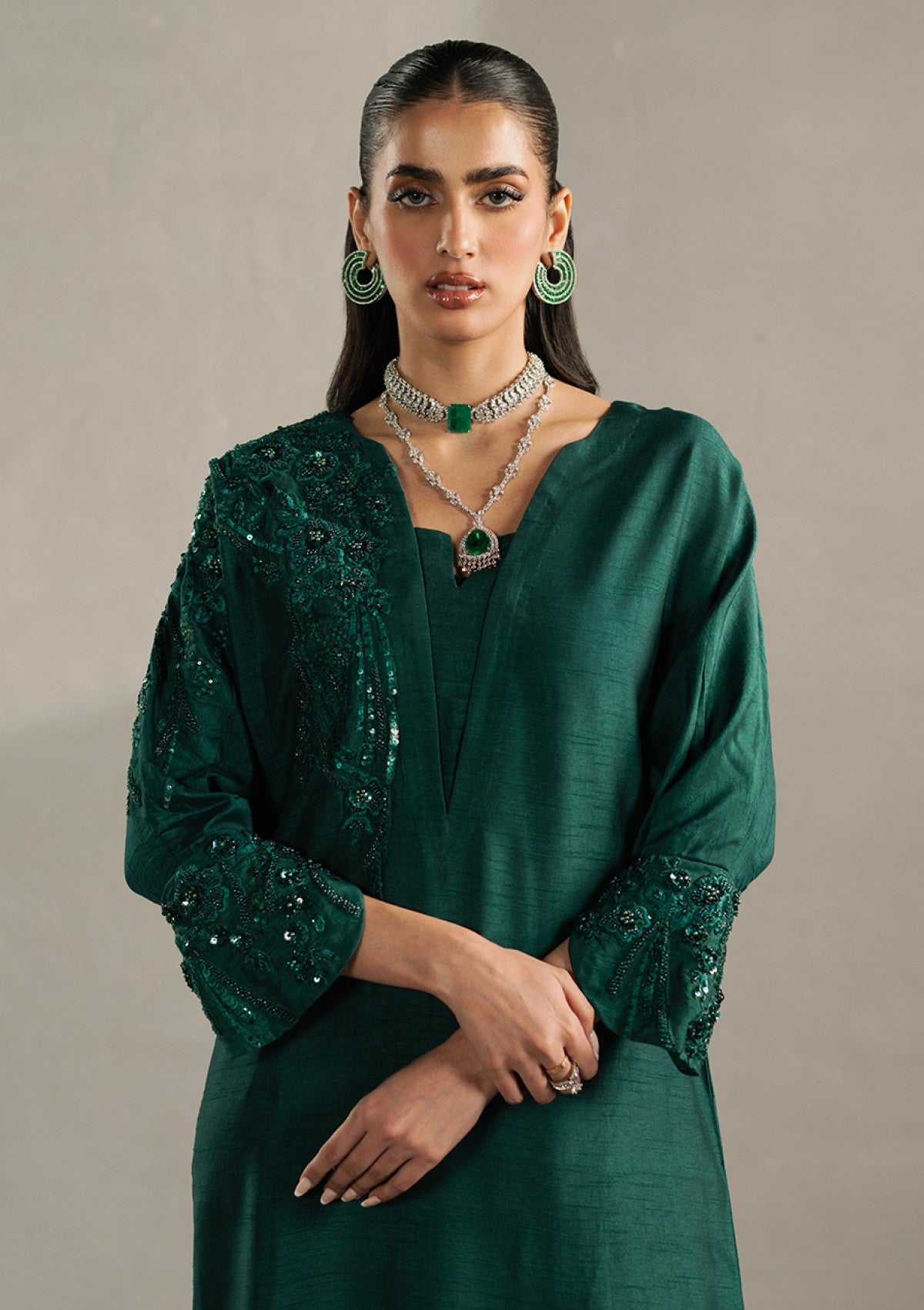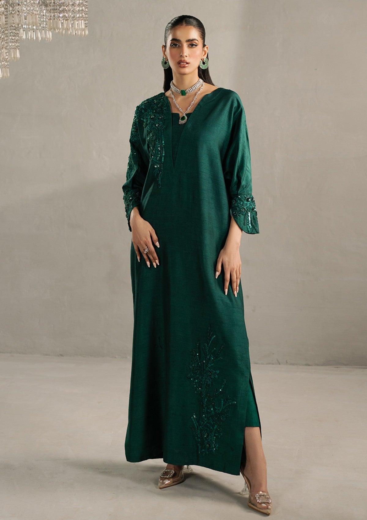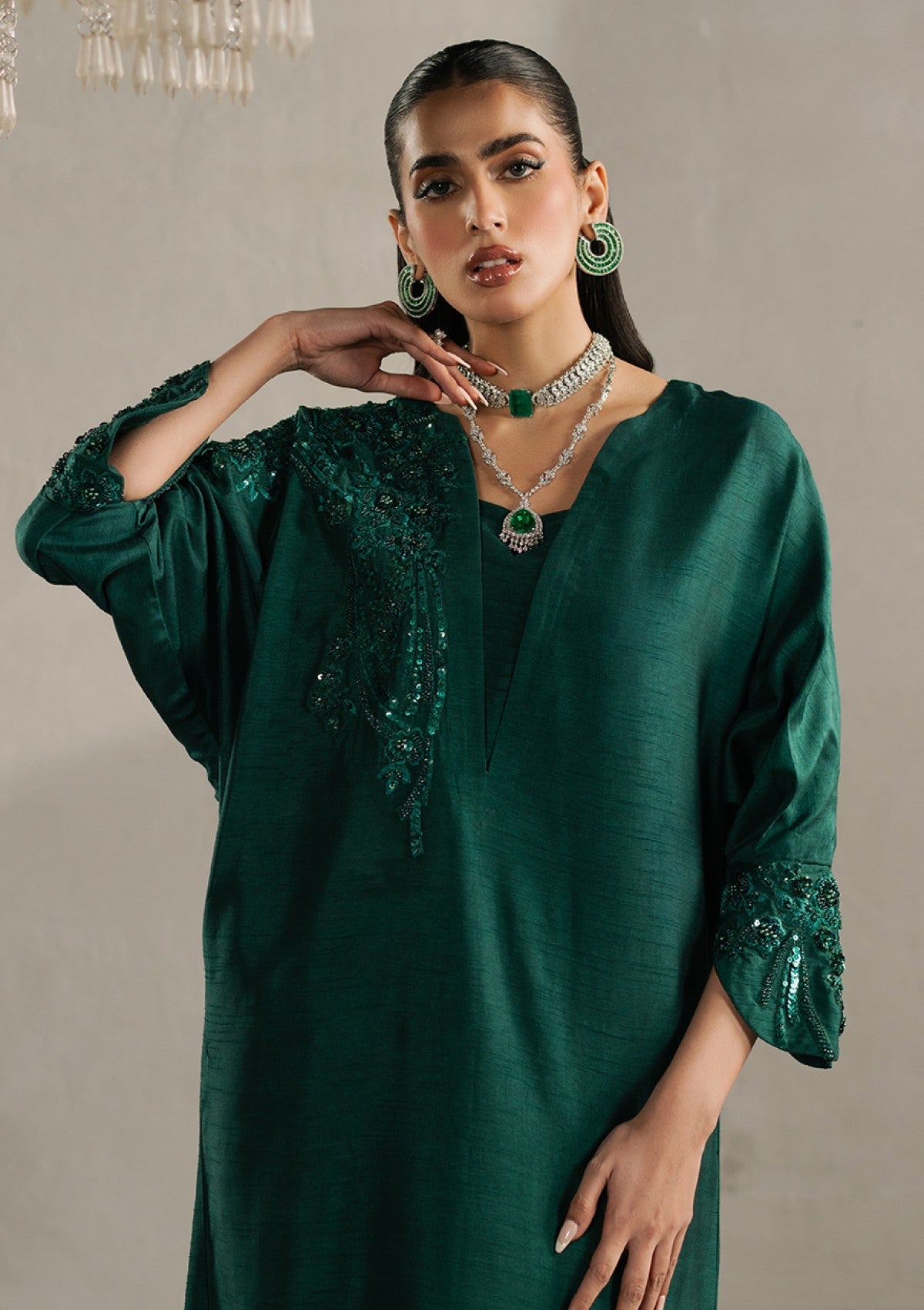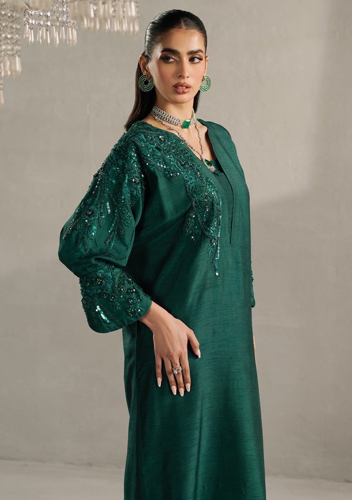 Enter a realm of sublime luxury with âÃÂÃÂIZEL'; an Emerald Green creation that masterfully redefines regal elegance. This breathtaking drop-shoulder, long-shirt silhouette is a testament to refined craftsmanship, adorned with opulent accents, where each floral motif is brought to life with dazzling sequins, delicate beads, and shimmering crystals. Paired with tonal trousers. Perfect for the upcoming wedding season. 'IZEL" is not just an ensemble, but a statement of enduring elegance and exceptional luxury.