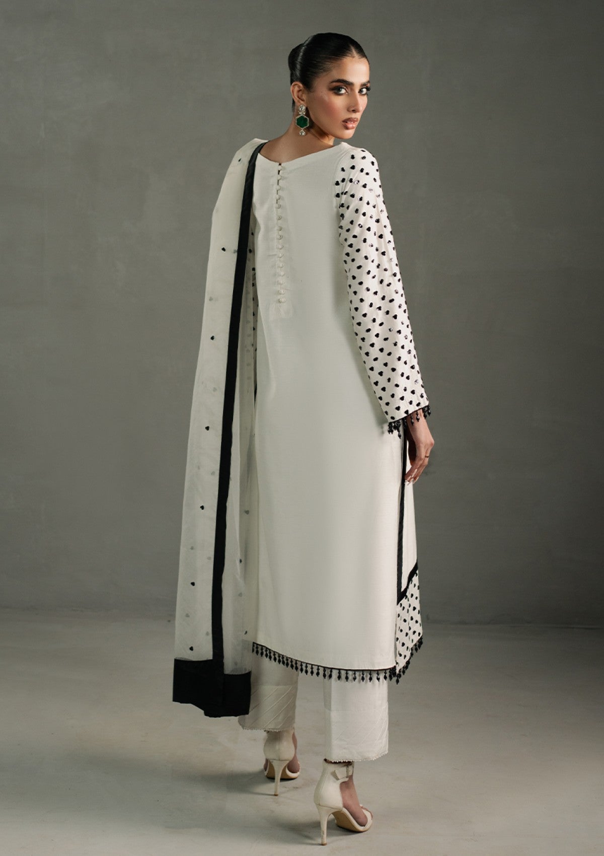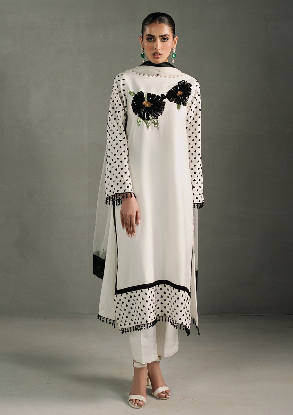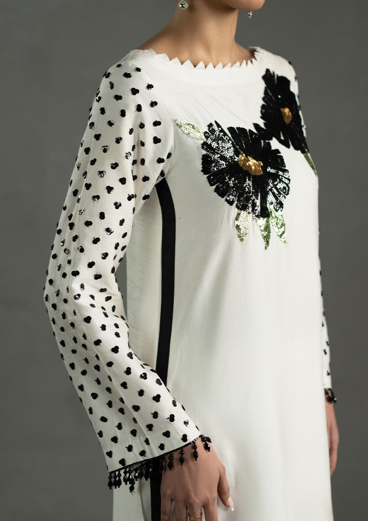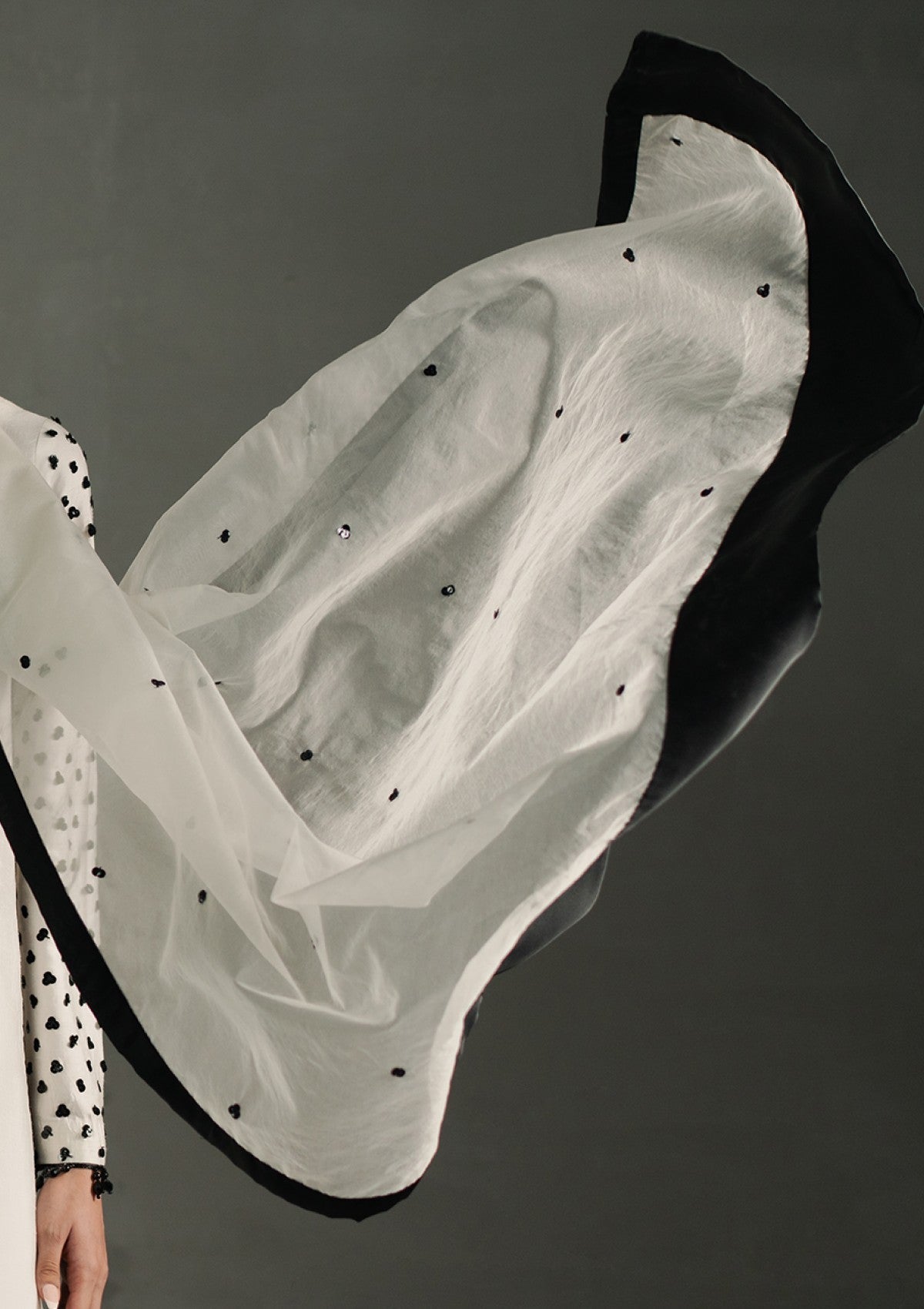 Embodying the spirit of minimalism, "ESTELLAâÃÂÃÂ, is a stunning example of refinement, crafted from a luxurious ivory raw silk fabric. The ensemble is enhanced by intricate ebony sequins embroidery, adding depth and elegance to its design. Paired with a dupatta featuring a four-sided silk border and delicate ebony sequins work, along with matching tonal trousers, this timeless creation effortlessly blends sophistication with enduring style.