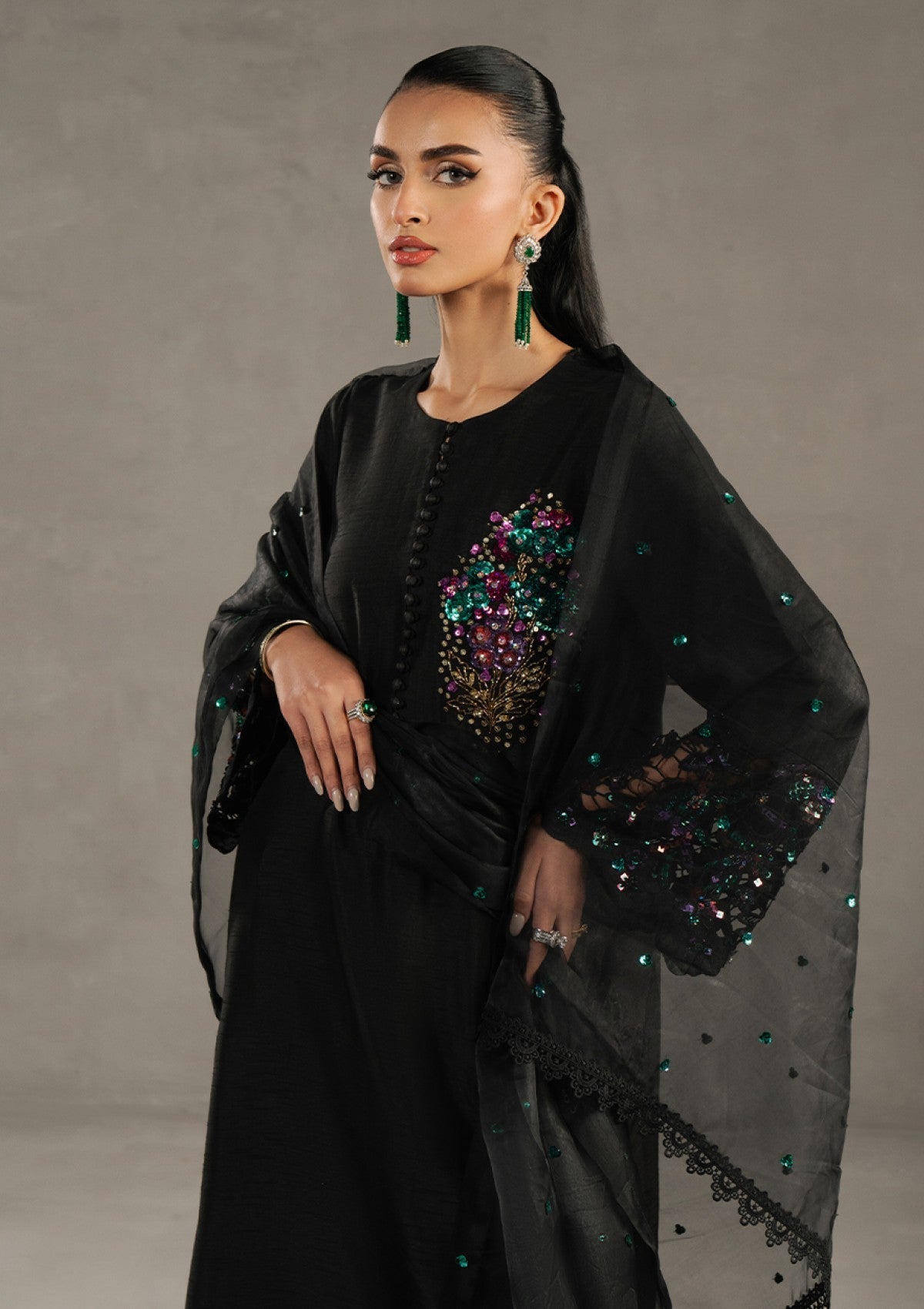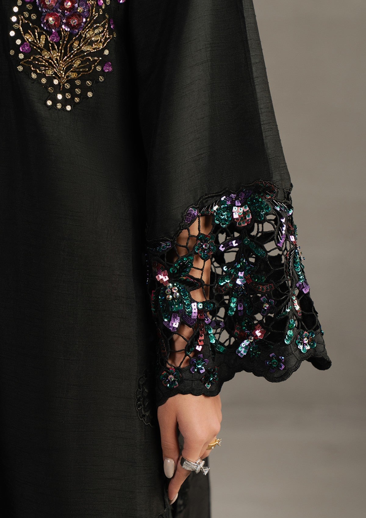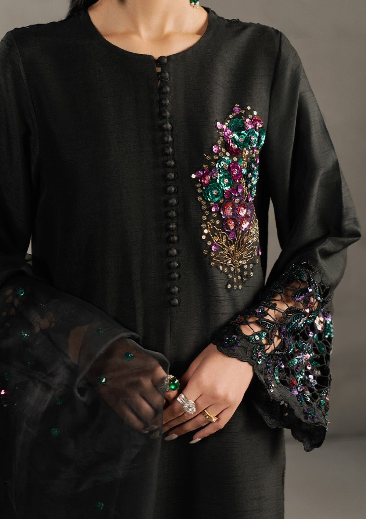 'DELLA' a creation adorned with luminous shimmering sequins and intricate cutwork. The ensemble showcases a refined, elongated silhouette with a tailored shirt, lavishly embellished with artisanal sequins and delicate bead work, evoking a sense of regal magnificence. Paired with impeccably tailored trousers and a gossamer organza dupatta enriched with ornate sequins detailing, this ensemble exudes a timeless elegance and celestial radiance, capturing the very soul of luxury.