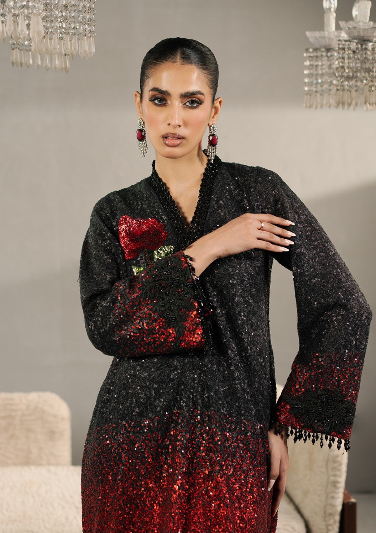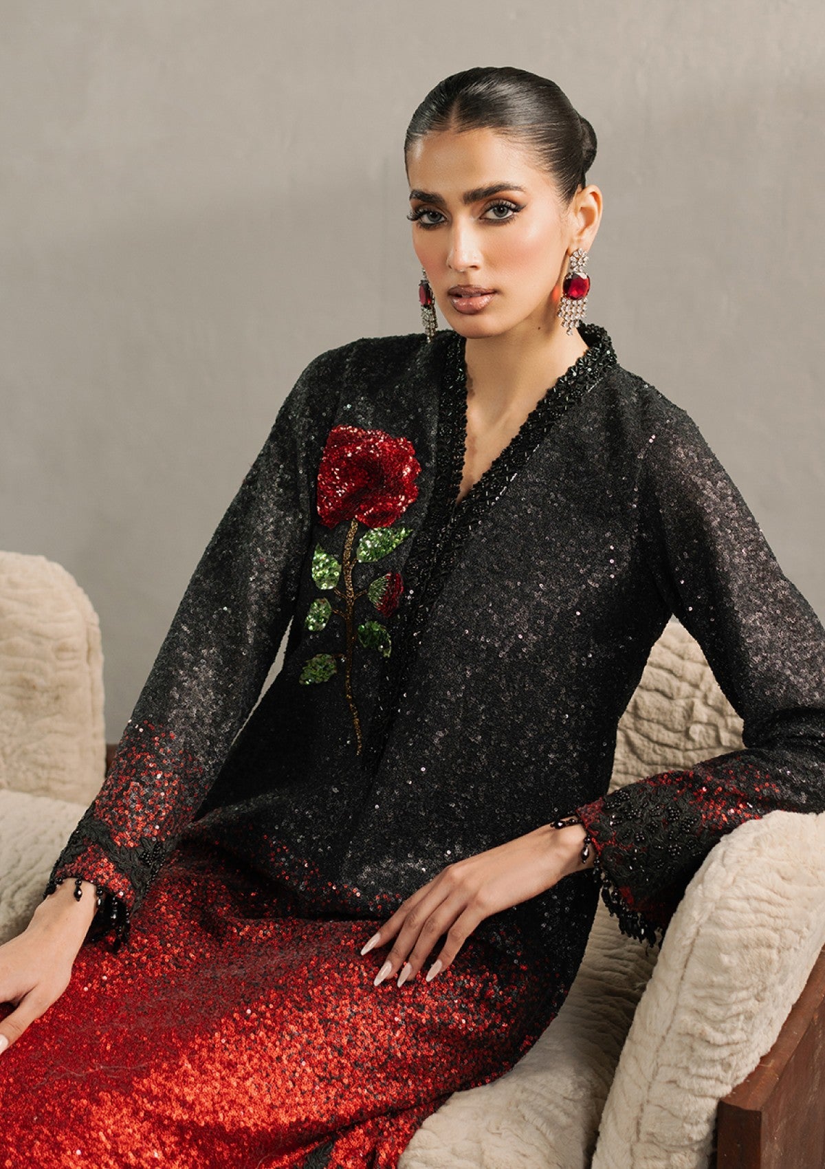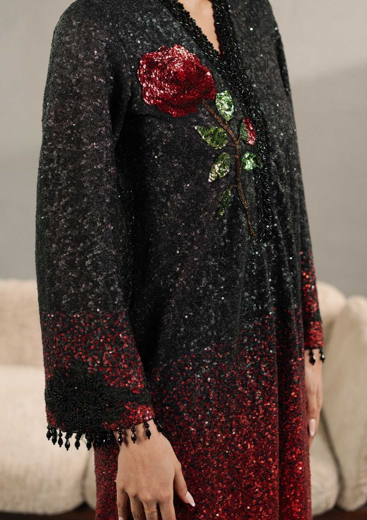 Immerse yourself in unparalleled opulence with AMBER -a breathtaking ombrÃÂé masterpiece adorned in a symphony of radiant shimmery sequins. This ensemble reveals a refined, elongated silhouette, with a shirt that is impeccably tailored to evoke an aura of regal grandeur, adorned with opulent sequins rose in chrome accents. The hemline is encrusted with floral Cutwork details, each floral motif is a masterpiece, brought to life with luminous sequins, delicate beads, lustrous pearls, and glistening crystals is a testament to refined artistry. Paired with flawlessly sculpted trousers. Every meticulously curated detail of this silhouette speaks to an unmatched level of sophistication, commanding attention and captivating all who behold it. ; It is a declaration of timeless elegance and supreme luxury. Perfectly poised for wedding festivities, it stands as the quintessential choice for those seeking an unforgettable statement of style.